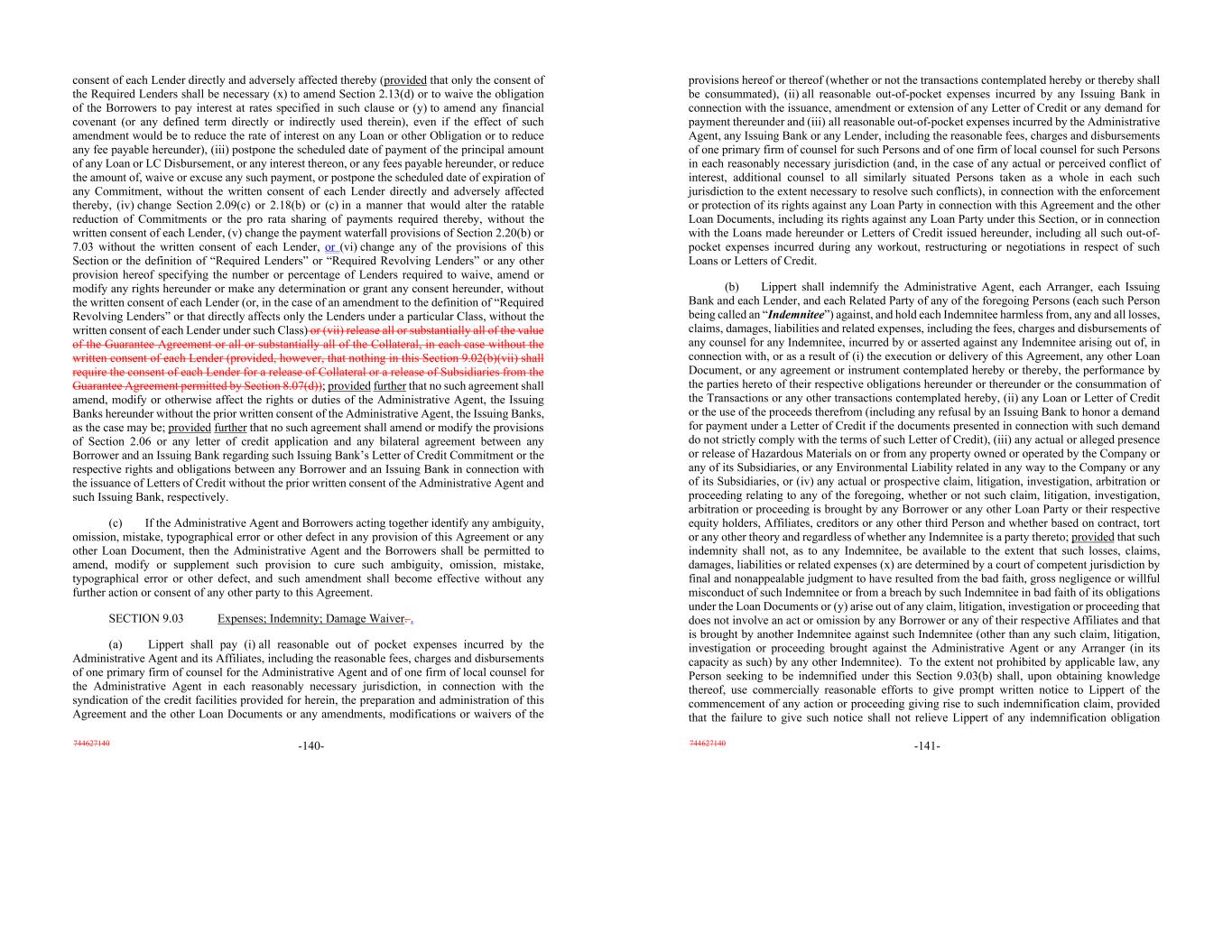 744627140 -140- consent of each Lender directly and adversely affected thereby (provided that only the consent of the Required Lenders shall be necessary (x) to amend Section 2.13(d) or to waive the obligation of the Borrowers to pay interest at rates specified in such clause or (y) to amend any financial covenant (or any defined term directly or indirectly used therein), even if the effect of such amendment would be to reduce the rate of interest on any Loan or other Obligation or to reduce any fee payable hereunder), (iii) postpone the scheduled date of payment of the principal amount of any Loan or LC Disbursement, or any interest thereon, or any fees payable hereunder, or reduce the amount of, waive or excuse any such payment, or postpone the scheduled date of expiration of any Commitment, without the written consent of each Lender directly and adversely affected thereby, (iv) change Section 2.09(c) or 2.18(b) or (c) in a manner that would alter the ratable reduction of Commitments or the pro rata sharing of payments required thereby, without the written consent of each Lender, (v) change the payment waterfall provisions of Section 2.20(b) or 7.03 without the written consent of each Lender, or (vi) change any of the provisions of this Section or the definition of “Required Lenders” or “Required Revolving Lenders” or any other provision hereof specifying the number or percentage of Lenders required to waive, amend or modify any rights hereunder or make any determination or grant any consent hereunder, without the written consent of each Lender (or, in the case of an amendment to the definition of “Required Revolving Lenders” or that directly affects only the Lenders under a particular Class, without the written consent of each Lender under such Class) or (vii) release all or substantially all of the value of the Guarantee Agreement or all or substantially all of the Collateral, in each case without the written consent of each Lender (provided, however, that nothing in this Section 9.02(b)(vii) shall require the consent of each Lender for a release of Collateral or a release of Subsidiaries from the Guarantee Agreement permitted by Section 8.07(d)); provided further that no such agreement shall amend, modify or otherwise affect the rights or duties of the Administrative Agent, the Issuing Banks hereunder without the prior written consent of the Administrative Agent, the Issuing Banks, as the case may be; provided further that no such agreement shall amend or modify the provisions of Section 2.06 or any letter of credit application and any bilateral agreement between any Borrower and an Issuing Bank regarding such Issuing Bank’s Letter of Credit Commitment or the respective rights and obligations between any Borrower and an Issuing Bank in connection with the issuance of Letters of Credit without the prior written consent of the Administrative Agent and such Issuing Bank, respectively. (c) If the Administrative Agent and Borrowers acting together identify any ambiguity, omission, mistake, typographical error or other defect in any provision of this Agreement or any other Loan Document, then the Administrative Agent and the Borrowers shall be permitted to amend, modify or supplement such provision to cure such ambiguity, omission, mistake, typographical error or other defect, and such amendment shall become effective without any further action or consent of any other party to this Agreement. SECTION 9.03 Expenses; Indemnity; Damage Waiver. . (a) Lippert shall pay (i) all reasonable out of pocket expenses incurred by the Administrative Agent and its Affiliates, including the reasonable fees, charges and disbursements of one primary firm of counsel for the Administrative Agent and of one firm of local counsel for the Administrative Agent in each reasonably necessary jurisdiction, in connection with the syndication of the credit facilities provided for herein, the preparation and administration of this Agreement and the other Loan Documents or any amendments, modifications or waivers of the 744627140 -141- provisions hereof or thereof (whether or not the transactions contemplated hereby or thereby shall be consummated), (ii) all reasonable out-of-pocket expenses incurred by any Issuing Bank in connection with the issuance, amendment or extension of any Letter of Credit or any demand for payment thereunder and (iii) all reasonable out-of-pocket expenses incurred by the Administrative Agent, any Issuing Bank or any Lender, including the reasonable fees, charges and disbursements of one primary firm of counsel for such Persons and of one firm of local counsel for such Persons in each reasonably necessary jurisdiction (and, in the case of any actual or perceived conflict of interest, additional counsel to all similarly situated Persons taken as a whole in each such jurisdiction to the extent necessary to resolve such conflicts), in connection with the enforcement or protection of its rights against any Loan Party in connection with this Agreement and the other Loan Documents, including its rights against any Loan Party under this Section, or in connection with the Loans made hereunder or Letters of Credit issued hereunder, including all such out-of- pocket expenses incurred during any workout, restructuring or negotiations in respect of such Loans or Letters of Credit. (b) Lippert shall indemnify the Administrative Agent, each Arranger, each Issuing Bank and each Lender, and each Related Party of any of the foregoing Persons (each such Person being called an “Indemnitee”) against, and hold each Indemnitee harmless from, any and all losses, claims, damages, liabilities and related expenses, including the fees, charges and disbursements of any counsel for any Indemnitee, incurred by or asserted against any Indemnitee arising out of, in connection with, or as a result of (i) the execution or delivery of this Agreement, any other Loan Document, or any agreement or instrument conte