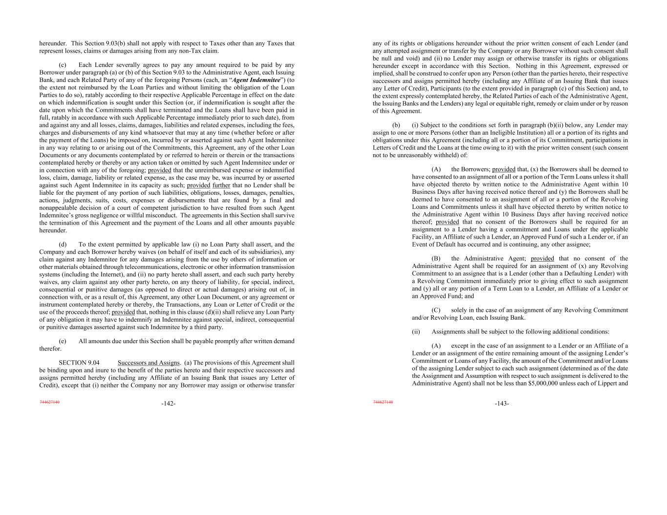 744627140 -142- hereunder. This Section 9.03(b) shall not apply with respect to Taxes other than any Taxes that represent losses, claims or damages arising from any non-Tax claim. (c) Each Lender severally agrees to pay any amount required to be paid by any Borrower under paragraph (a) or (b) of this Section 9.03 to the Administrative Agent, each Issuing Bank, and each Related Party of any of the foregoing Persons (each, an “Agent Indemnitee”) (to the extent not reimbursed by the Loan Parties and without limiting the obligation of the Loan Parties to do so), ratably according to their respective Applicable Percentage in effect on the date on which indemnification is sought under this Section (or, if indemnification is sought after the date upon which the Commitments shall have terminated and the Loans shall have been paid in full, ratably in accordance with such Applicable Percentage immediately prior to such date), from and against any and all losses, claims, damages, liabilities and related expenses, including the fees, charges and disbursements of any kind whatsoever that may at any time (whether before or after the payment of the Loans) be imposed on, incurred by or asserted against such Agent Indemnitee in any way relating to or arising out of the Commitments, this Agreement, any of the other Loan Documents or any documents contemplated by or referred to herein or therein or the transactions contemplated hereby or thereby or any action taken or omitted by such Agent Indemnitee under or in connection with any of the foregoing; provided that the unreimbursed expense or indemnified loss, claim, damage, liability or related expense, as the case may be, was incurred by or asserted against such Agent Indemnitee in its capacity as such; provided further that no Lender shall be liable for the payment of any portion of such liabilities, obligations, losses, damages, penalties, actions, judgments, suits, costs, expenses or disbursements that are found by a final and nonappealable decision of a court of competent jurisdiction to have resulted from such Agent Indemnitee’s gross negligence or willful misconduct. The agreements in this Section shall survive the termination of this Agreement and the payment of the Loans and all other amounts payable hereunder. (d) To the extent permitted by applicable law (i) no Loan Party shall assert, and the Company and each Borrower hereby waives (on behalf of itself and each of its subsidiaries), any claim against any Indemnitee for any damages arising from the use by others of information or other materials obtained through telecommunications, electronic or other information transmission systems (including the Internet), and (ii) no party hereto shall assert, and each such party hereby waives, any claim against any other party hereto, on any theory of liability, for special, indirect, consequential or punitive damages (as opposed to direct or actual damages) arising out of, in connection with, or as a result of, this Agreement, any other Loan Document, or any agreement or instrument contemplated hereby or thereby, the Transactions, any Loan or Letter of Credit or the use of the proceeds thereof; provided that, nothing in this clause (d)(ii) shall relieve any Loan Party of any obligation it may have to indemnify an Indemnitee against special, indirect, consequential or punitive damages asserted against such Indemnitee by a third party. (e) All amounts due under this Section shall be payable promptly after written demand therefor. SECTION 9.04 Successors and Assigns. (a) The provisions of this Agreement shall be binding upon and inure to the benefit of the parties hereto and their respective successors and assigns permitted hereby (including any Affiliate of an Issuing Bank that issues any Letter of Credit), except that (i) neither the Company nor any Borrower may assign or otherwise transfer 744627140 -143- any of its rights or obligations hereunder without the prior written consent of each Lender (and any attempted assignment or transfer by the Company or any Borrower without such consent shall be null and void) and (ii) no Lender may assign or otherwise transfer its rights or obligations hereunder except in accordance with this Section. Nothing in this Agreement, expressed or implied, shall be construed to confer upon any Person (other than the parties hereto, their respective successors and assigns permitted hereby (including any Affiliate of an Issuing Bank that issues any Letter of Credit), Participants (to the extent provided in paragraph (c) of this Section) and, to the extent expressly contemplated hereby, the Related Parties of each of the Administrative Agent, the Issuing Banks and the Lenders) any legal or equitable right, remedy or claim under or by reason of this Agreement. (b) (i) Subject to the conditions set forth in paragraph (b)(ii) below, any Lender may assign to one or more Persons (other than an Ineligible Institution) all or a portion of its rights and obligations under this Agreement (including all or a portion of its Commitment, participations in Letters of Credit and the Loans at the time owing to it) with the prior written consent (such consent not to be unreasonably withheld) of: (A) the Borrowers; provided that, (x) the Borrowers shall be deemed to have consented to an assignment of all or a portion of the Term Loans unless it shall have objected thereto by written notice to the Administrative Agent within 10 Business Days after having received notice thereof and (y) the Borrowers shall be deemed to have consented to an assignment of all or a portion of the Revolving Loans and Commitments unless it shall have objected thereto by written notice to the Administrative Agent within 10 Business Days after having received notice thereof; provided that no consent of the Borrowers shall be required for an assignment to a Lender having a commitment and Loans under the applicable Facility, an Affiliate of such a Lender, an Approved Fun
