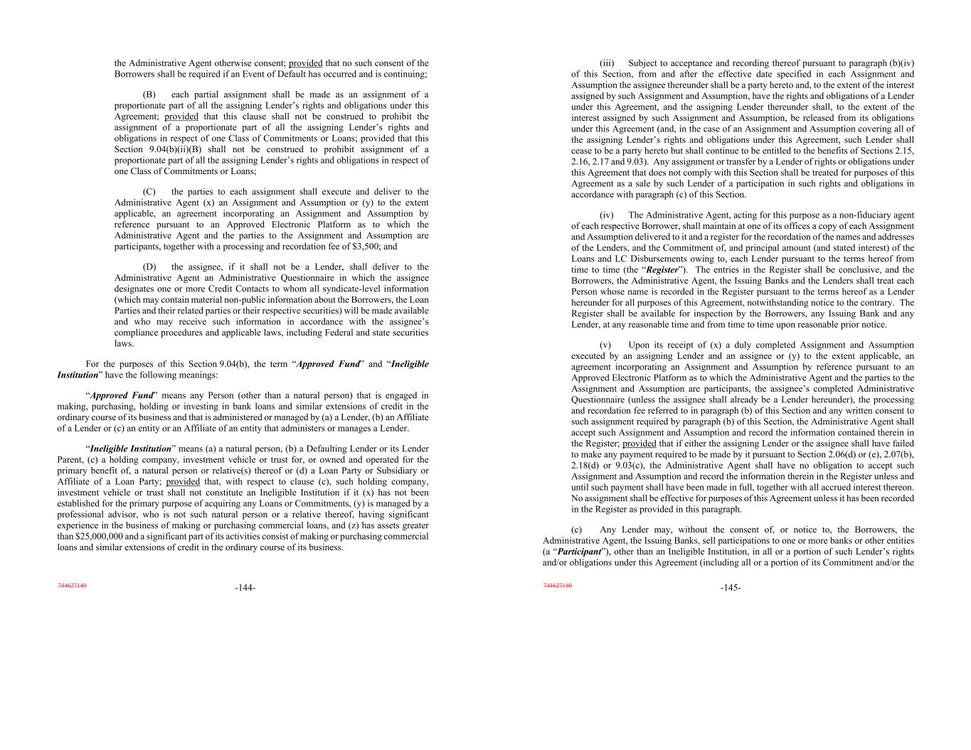 744627140 -144- the Administrative Agent otherwise consent; provided that no such consent of the Borrowers shall be required if an Event of Default has occurred and is continuing; (B) each partial assignment shall be made as an assignment of a proportionate part of all the assigning Lender’s rights and obligations under this Agreement; provided that this clause shall not be construed to prohibit the assignment of a proportionate part of all the assigning Lender’s rights and obligations in respect of one Class of Commitments or Loans; provided that this Section 9.04(b)(ii)(B) shall not be construed to prohibit assignment of a proportionate part of all the assigning Lender’s rights and obligations in respect of one Class of Commitments or Loans; (C) the parties to each assignment shall execute and deliver to the Administrative Agent (x) an Assignment and Assumption or (y) to the extent applicable, an agreement incorporating an Assignment and Assumption by reference pursuant to an Approved Electronic Platform as to which the Administrative Agent and the parties to the Assignment and Assumption are participants, together with a processing and recordation fee of $3,500; and (D) the assignee, if it shall not be a Lender, shall deliver to the Administrative Agent an Administrative Questionnaire in which the assignee designates one or more Credit Contacts to whom all syndicate-level information (which may contain material non-public information about the Borrowers, the Loan Parties and their related parties or their respective securities) will be made available and who may receive such information in accordance with the assignee’s compliance procedures and applicable laws, including Federal and state securities laws. For the purposes of this Section 9.04(b), the term “Approved Fund” and “Ineligible Institution” have the following meanings: “Approved Fund” means any Person (other than a natural person) that is engaged in making, purchasing, holding or investing in bank loans and similar extensions of credit in the ordinary course of its business and that is administered or managed by (a) a Lender, (b) an Affiliate of a Lender or (c) an entity or an Affiliate of an entity that administers or manages a Lender. “Ineligible Institution” means (a) a natural person, (b) a Defaulting Lender or its Lender Parent, (c) a holding company, investment vehicle or trust for, or owned and operated for the primary benefit of, a natural person or relative(s) thereof or (d) a Loan Party or Subsidiary or Affiliate of a Loan Party; provided that, with respect to clause (c), such holding company, investment vehicle or trust shall not constitute an Ineligible Institution if it (x) has not been established for the primary purpose of acquiring any Loans or Commitments, (y) is managed by a professional advisor, who is not such natural person or a relative thereof, having significant experience in the business of making or purchasing commercial loans, and (z) has assets greater than $25,000,000 and a significant part of its activities consist of making or purchasing commercial loans and similar extensions of credit in the ordinary course of its business. 744627140 -145- (iii) Subject to acceptance and recording thereof pursuant to paragraph (b)(iv) of this Section, from and after the effective date specified in each Assignment and Assumption the assignee thereunder shall be a party hereto and, to the extent of the interest assigned by such Assignment and Assumption, have the rights and obligations of a Lender under this Agreement, and the assigning Lender thereunder shall, to the extent of the interest assigned by such Assignment and Assumption, be released from its obligations under this Agreement (and, in the case of an Assignment and Assumption covering all of the assigning Lender’s rights and obligations under this Agreement, such Lender shall cease to be a party hereto but shall continue to be entitled to the benefits of Sections 2.15, 2.16, 2.17 and 9.03). Any assignment or transfer by a Lender of rights or obligations under this Agreement that does not comply with this Section shall be treated for purposes of this Agreement as a sale by such Lender of a participation in such rights and obligations in accordance with paragraph (c) of this Section. (iv) The Administrative Agent, acting for this purpose as a non-fiduciary agent of each respective Borrower, shall maintain at one of its offices a copy of each Assignment and Assumption delivered to it and a register for the recordation of the names and addresses of the Lenders, and the Commitment of, and principal amount (and stated interest) of the Loans and LC Disbursements owing to, each Lender pursuant to the terms hereof from time to time (the “Register”). The entries in the Register shall be conclusive, and the Borrowers, the Administrative Agent, the Issuing Banks and the Lenders shall treat each Person whose name is recorded in the Register pursuant to the terms hereof as a Lender hereunder for all purposes of this Agreement, notwithstanding notice to the contrary. The Register shall be available for inspection by the Borrowers, any Issuing Bank and any Lender, at any reasonable time and from time to time upon reasonable prior notice. (v) Upon its receipt of (x) a duly completed Assignment and Assumption executed by an assigning Lender and an assignee or (y) to the extent applicable, an agreement incorporating an Assignment and Assumption by reference pursuant to an Approved Electronic Platform as to which the Administrative Agent and the parties to the Assignment and Assumption are participants, the assignee’s completed Administrative Questionnaire (unless the assignee shall already be a Lender hereunder), the processing and recordation fee referred to in paragraph (b) of this Section and any written consent to such assignment required by paragraph (b) of this Section, the Administrative Agent shall accept such Assignment and Assum