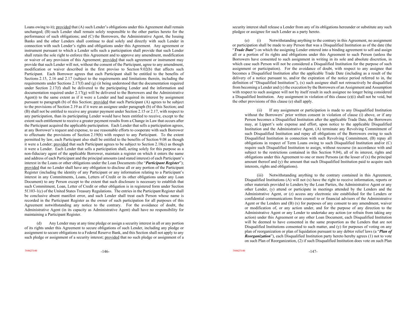 744627140 -146- Loans owing to it); provided that (A) such Lender’s obligations under this Agreement shall remain unchanged; (B) such Lender shall remain solely responsible to the other parties hereto for the performance of such obligations; and (C) the Borrowers, the Administrative Agent, the Issuing Banks and the other Lenders shall continue to deal solely and directly with such Lender in connection with such Lender’s rights and obligations under this Agreement. Any agreement or instrument pursuant to which a Lender sells such a participation shall provide that such Lender shall retain the sole right to enforce this Agreement and to approve any amendment, modification or waiver of any provision of this Agreement; provided that such agreement or instrument may provide that such Lender will not, without the consent of the Participant, agree to any amendment, modification or waiver described in the first proviso to Section 9.02(b) that affects such Participant. Each Borrower agrees that each Participant shall be entitled to the benefits of Sections 2.15, 2.16 and 2.17 (subject to the requirements and limitations therein, including the requirements under Sections 2.17(f) and (g) (it being understood that the documentation required under Section 2.17(f) shall be delivered to the participating Lender and the information and documentation required under 2.17(g) will be delivered to the Borrowers and the Administrative Agent)) to the same extent as if it were a Lender and had acquired its interest by assignment pursuant to paragraph (b) of this Section; provided that such Participant (A) agrees to be subject to the provisions of Section 2.19 as if it were an assignee under paragraph (b) of this Section; and (B) shall not be entitled to receive any greater payment under Section 2.15 or 2.17, with respect to any participation, than its participating Lender would have been entitled to receive, except to the extent such entitlement to receive a greater payment results from a Change in Law that occurs after the Participant acquired the applicable participation. Each Lender that sells a participation agrees, at any Borrower’s request and expense, to use reasonable efforts to cooperate with such Borrower to effectuate the provisions of Section 2.19(b) with respect to any Participant. To the extent permitted by law, each Participant also shall be entitled to the benefits of Section 9.08 as though it were a Lender; provided that such Participant agrees to be subject to Section 2.18(c) as though it were a Lender. Each Lender that sells a participation shall, acting solely for this purpose as a non-fiduciary agent of the applicable Borrower, maintain a register on which it enters the name and address of each Participant and the principal amounts (and stated interest) of each Participant’s interest in the Loans or other obligations under the Loan Documents (the “Participant Register”); provided that no Lender shall have any obligation to disclose all or any portion of the Participant Register (including the identity of any Participant or any information relating to a Participant’s interest in any Commitments, Loans, Letters of Credit or its other obligations under any Loan Document) to any Person except to the extent that such disclosure is necessary to establish that such Commitment, Loan, Letter of Credit or other obligation is in registered form under Section 5f.103-1(c) of the United States Treasury Regulations. The entries in the Participant Register shall be conclusive absent manifest error, and such Lender shall treat each Person whose name is recorded in the Participant Register as the owner of such participation for all purposes of this Agreement notwithstanding any notice to the contrary. For the avoidance of doubt, the Administrative Agent (in its capacity as Administrative Agent) shall have no responsibility for maintaining a Participant Register. (d) Any Lender may at any time pledge or assign a security interest in all or any portion of its rights under this Agreement to secure obligations of such Lender, including any pledge or assignment to secure obligations to a Federal Reserve Bank, and this Section shall not apply to any such pledge or assignment of a security interest; provided that no such pledge or assignment of a 744627140 -147- security interest shall release a Lender from any of its obligations hereunder or substitute any such pledgee or assignee for such Lender as a party hereto. (e) (i) Notwithstanding anything to the contrary in this Agreement, no assignment or participation shall be made to any Person that was a Disqualified Institution as of the date (the “Trade Date”) on which the assigning Lender entered into a binding agreement to sell and assign all or a portion of its rights and obligations under this Agreement to such Person (unless the Borrowers have consented to such assignment in writing in its sole and absolute discretion, in which case such Person will not be considered a Disqualified Institution for the purpose of such assignment or participation). For the avoidance of doubt, with respect to any assignee that becomes a Disqualified Institution after the applicable Trade Date (including as a result of the delivery of a notice pursuant to, and/or the expiration of the notice period referred to in, the definition of “Disqualified Institution”), (x) such assignee shall not retroactively be disqualified from becoming a Lender and (y) the execution by the Borrowers of an Assignment and Assumption with respect to such assignee will not by itself result in such assignee no longer being considered a Disqualified Institution. Any assignment in violation of this clause (e)(i) shall not be void, but the other provisions of this clause (e) shall apply. (ii) If any assignment or participation is made to any Disqualified Institution without the Borrowers’ prior written consent in violation of clause (i) above, or if any Person becomes a Disqualified Inst