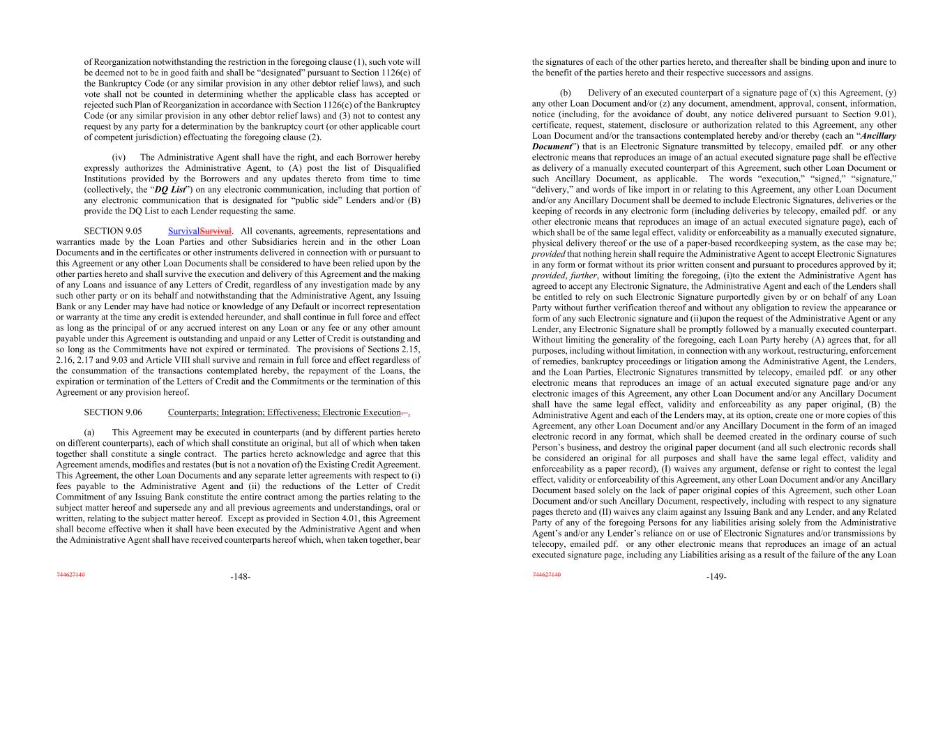 744627140 -148- of Reorganization notwithstanding the restriction in the foregoing clause (1), such vote will be deemed not to be in good faith and shall be “designated” pursuant to Section 1126(e) of the Bankruptcy Code (or any similar provision in any other debtor relief laws), and such vote shall not be counted in determining whether the applicable class has accepted or rejected such Plan of Reorganization in accordance with Section 1126(c) of the Bankruptcy Code (or any similar provision in any other debtor relief laws) and (3) not to contest any request by any party for a determination by the bankruptcy court (or other applicable court of competent jurisdiction) effectuating the foregoing clause (2). (iv) The Administrative Agent shall have the right, and each Borrower hereby expressly authorizes the Administrative Agent, to (A) post the list of Disqualified Institutions provided by the Borrowers and any updates thereto from time to time (collectively, the “DQ List”) on any electronic communication, including that portion of any electronic communication that is designated for “public side” Lenders and/or (B) provide the DQ List to each Lender requesting the same. SECTION 9.05 SurvivalSurvival. All covenants, agreements, representations and warranties made by the Loan Parties and other Subsidiaries herein and in the other Loan Documents and in the certificates or other instruments delivered in connection with or pursuant to this Agreement or any other Loan Documents shall be considered to have been relied upon by the other parties hereto and shall survive the execution and delivery of this Agreement and the making of any Loans and issuance of any Letters of Credit, regardless of any investigation made by any such other party or on its behalf and notwithstanding that the Administrative Agent, any Issuing Bank or any Lender may have had notice or knowledge of any Default or incorrect representation or warranty at the time any credit is extended hereunder, and shall continue in full force and effect as long as the principal of or any accrued interest on any Loan or any fee or any other amount payable under this Agreement is outstanding and unpaid or any Letter of Credit is outstanding and so long as the Commitments have not expired or terminated. The provisions of Sections 2.15, 2.16, 2.17 and 9.03 and Article VIII shall survive and remain in full force and effect regardless of the consummation of the transactions contemplated hereby, the repayment of the Loans, the expiration or termination of the Letters of Credit and the Commitments or the termination of this Agreement or any provision hereof. SECTION 9.06 Counterparts; Integration; Effectiveness; Electronic Execution. . (a) This Agreement may be executed in counterparts (and by different parties hereto on different counterparts), each of which shall constitute an original, but all of which when taken together shall constitute a single contract. The parties hereto acknowledge and agree that this Agreement amends, modifies and restates (but is not a novation of) the Existing Credit Agreement. This Agreement, the other Loan Documents and any separate letter agreements with respect to (i) fees payable to the Administrative Agent and (ii) the reductions of the Letter of Credit Commitment of any Issuing Bank constitute the entire contract among the parties relating to the subject matter hereof and supersede any and all previous agreements and understandings, oral or written, relating to the subject matter hereof. Except as provided in Section 4.01, this Agreement shall become effective when it shall have been executed by the Administrative Agent and when the Administrative Agent shall have received counterparts hereof which, when taken together, bear 744627140 -149- the signatures of each of the other parties hereto, and thereafter shall be binding upon and inure to the benefit of the parties hereto and their respective successors and assigns. (b) Delivery of an executed counterpart of a signature page of (x) this Agreement, (y) any other Loan Document and/or (z) any document, amendment, approval, consent, information, notice (including, for the avoidance of doubt, any notice delivered pursuant to Section 9.01), certificate, request, statement, disclosure or authorization related to this Agreement, any other Loan Document and/or the transactions contemplated hereby and/or thereby (each an “Ancillary Document”) that is an Electronic Signature transmitted by telecopy, emailed pdf. or any other electronic means that reproduces an image of an actual executed signature page shall be effective as delivery of a manually executed counterpart of this Agreement, such other Loan Document or such Ancillary Document, as applicable. The words “execution,” “signed,” “signature,” “delivery,” and words of like import in or relating to this Agreement, any other Loan Document and/or any Ancillary Document shall be deemed to include Electronic Signatures, deliveries or the keeping of records in any electronic form (including deliveries by telecopy, emailed pdf. or any other electronic means that reproduces an image of an actual executed signature page), each of which shall be of the same legal effect, validity or enforceability as a manually executed signature, physical delivery thereof or the use of a paper-based recordkeeping system, as the case may be; provided that nothing herein shall require the Administrative Agent to accept Electronic Signatures in any form or format without its prior written consent and pursuant to procedures approved by it; provided, further, without limiting the foregoing, (i)to the extent the Administrative Agent has agreed to accept any Electronic Signature, the Administrative Agent and each of the Lenders shall be entitled to rely on such Electronic Signature purportedly given by or on behalf of any Loan Party without further verification thereof and without any obligation to review the appearanc