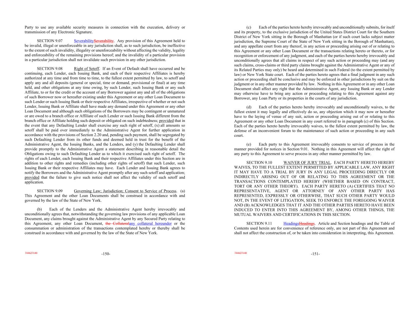 744627140 -150- Party to use any available security measures in connection with the execution, delivery or transmission of any Electronic Signature. SECTION 9.07 SeverabilitySeverability. Any provision of this Agreement held to be invalid, illegal or unenforceable in any jurisdiction shall, as to such jurisdiction, be ineffective to the extent of such invalidity, illegality or unenforceability without affecting the validity, legality and enforceability of the remaining provisions hereof; and the invalidity of a particular provision in a particular jurisdiction shall not invalidate such provision in any other jurisdiction. SECTION 9.08 Right of Setoff. If an Event of Default shall have occurred and be continuing, each Lender, each Issuing Bank, and each of their respective Affiliates is hereby authorized at any time and from time to time, to the fullest extent permitted by law, to setoff and apply any and all deposits (general or special, time or demand, provisional or final) at any time held, and other obligations at any time owing, by such Lender, such Issuing Bank or any such Affiliate, to or for the credit or the account of any Borrower against any and all of the obligations of such Borrower now or hereafter existing under this Agreement or any other Loan Document to such Lender or such Issuing Bank or their respective Affiliates, irrespective of whether or not such Lender, Issuing Bank or Affiliate shall have made any demand under this Agreement or any other Loan Document and although such obligations of the Borrowers may be contingent or unmatured or are owed to a branch office or Affiliate of such Lender or such Issuing Bank different from the branch office or Affiliate holding such deposit or obligated on such indebtedness; provided that in the event that any Defaulting Lender shall exercise any such right of setoff, (x) all amounts so setoff shall be paid over immediately to the Administrative Agent for further application in accordance with the provisions of Section 2.20 and, pending such payment, shall be segregated by such Defaulting Lender from its other funds and deemed held in trust for the benefit of the Administrative Agent, the Issuing Banks, and the Lenders, and (y) the Defaulting Lender shall provide promptly to the Administrative Agent a statement describing in reasonable detail the Obligations owing to such Defaulting Lender as to which it exercised such right of setoff. The rights of each Lender, each Issuing Bank and their respective Affiliates under this Section are in addition to other rights and remedies (including other rights of setoff) that such Lender, such Issuing Bank or their respective Affiliates may have. Each Lender and Issuing Bank agrees to notify the Borrowers and the Administrative Agent promptly after any such setoff and application; provided that the failure to give such notice shall not affect the validity of such setoff and application. SECTION 9.09 Governing Law; Jurisdiction; Consent to Service of Process. (a) This Agreement and the other Loan Documents shall be construed in accordance with and governed by the law of the State of New York. (b) Each of the Lenders and the Administrative Agent hereby irrevocably and unconditionally agrees that, notwithstanding the governing law provisions of any applicable Loan Document, any claims brought against the Administrative Agent by any Secured Party relating to this Agreement, any other Loan Document, the Collateralany collateral hereunder or the consummation or administration of the transactions contemplated hereby or thereby shall be construed in accordance with and governed by the law of the State of New York. 744627140 -151- (c) Each of the parties hereto hereby irrevocably and unconditionally submits, for itself and its property, to the exclusive jurisdiction of the United States District Court for the Southern District of New York sitting in the Borough of Manhattan (or if such court lacks subject matter jurisdiction, the Supreme Court of the State of New York sitting in the Borough of Manhattan), and any appellate court from any thereof, in any action or proceeding arising out of or relating to this Agreement or any other Loan Document or the transactions relating hereto or thereto, or for recognition or enforcement of any judgment, and each of the parties hereto hereby irrevocably and unconditionally agrees that all claims in respect of any such action or proceeding may (and any such claims, cross-claims or third party claims brought against the Administrative Agent or any of its Related Parties may only) be heard and determined in such Federal (to the extent permitted by law) or New York State court. Each of the parties hereto agrees that a final judgment in any such action or proceeding shall be conclusive and may be enforced in other jurisdictions by suit on the judgment or in any other manner provided by law. Nothing in this Agreement or in any other Loan Document shall affect any right that the Administrative Agent, any Issuing Bank or any Lender may otherwise have to bring any action or proceeding relating to this Agreement against any Borrower, any Loan Party or its properties in the courts of any jurisdiction. (d) Each of the parties hereto hereby irrevocably and unconditionally waives, to the fullest extent it may legally and effectively do so, any objection which it may now or hereafter have to the laying of venue of any suit, action or proceeding arising out of or relating to this Agreement or any other Loan Document in any court referred to in paragraph (c) of this Section. Each of the parties hereto hereby irrevocably waives, to the fullest extent permitted by law, the defense of an inconvenient forum to the maintenance of such action or proceeding in any such court. (e) Each party to this Agreement irrevocably consents to service of process in the manner provided for notices in Section 9.01. Nothing in this Agreement will affect the right of any party to this Agreement to serve p