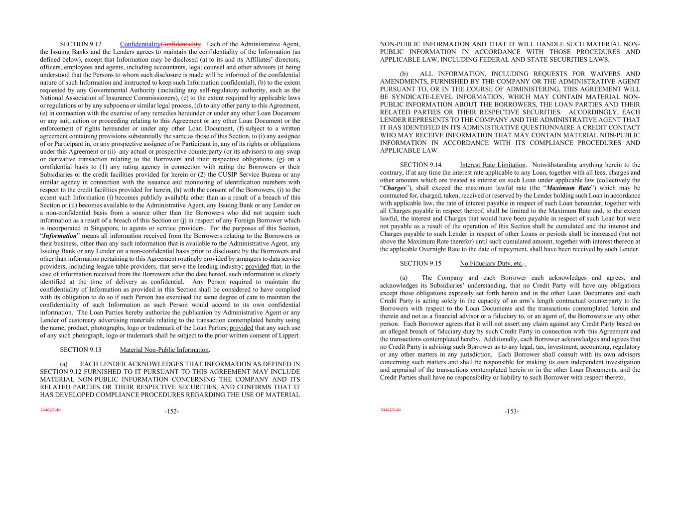 744627140 -152- SECTION 9.12 ConfidentialityConfidentiality. Each of the Administrative Agent, the Issuing Banks and the Lenders agrees to maintain the confidentiality of the Information (as defined below), except that Information may be disclosed (a) to its and its Affiliates’ directors, officers, employees and agents, including accountants, legal counsel and other advisors (it being understood that the Persons to whom such disclosure is made will be informed of the confidential nature of such Information and instructed to keep such Information confidential), (b) to the extent requested by any Governmental Authority (including any self-regulatory authority, such as the National Association of Insurance Commissioners), (c) to the extent required by applicable laws or regulations or by any subpoena or similar legal process, (d) to any other party to this Agreement, (e) in connection with the exercise of any remedies hereunder or under any other Loan Document or any suit, action or proceeding relating to this Agreement or any other Loan Document or the enforcement of rights hereunder or under any other Loan Document, (f) subject to a written agreement containing provisions substantially the same as those of this Section, to (i) any assignee of or Participant in, or any prospective assignee of or Participant in, any of its rights or obligations under this Agreement or (ii) any actual or prospective counterparty (or its advisors) to any swap or derivative transaction relating to the Borrowers and their respective obligations, (g) on a confidential basis to (1) any rating agency in connection with rating the Borrowers or their Subsidiaries or the credit facilities provided for herein or (2) the CUSIP Service Bureau or any similar agency in connection with the issuance and monitoring of identification numbers with respect to the credit facilities provided for herein, (h) with the consent of the Borrowers, (i) to the extent such Information (i) becomes publicly available other than as a result of a breach of this Section or (ii) becomes available to the Administrative Agent, any Issuing Bank or any Lender on a non-confidential basis from a source other than the Borrowers who did not acquire such information as a result of a breach of this Section or (j) in respect of any Foreign Borrower which is incorporated in Singapore, to agents or service providers. For the purposes of this Section, “Information” means all information received from the Borrowers relating to the Borrowers or their business, other than any such information that is available to the Administrative Agent, any Issuing Bank or any Lender on a non-confidential basis prior to disclosure by the Borrowers and other than information pertaining to this Agreement routinely provided by arrangers to data service providers, including league table providers, that serve the lending industry; provided that, in the case of information received from the Borrowers after the date hereof, such information is clearly identified at the time of delivery as confidential. Any Person required to maintain the confidentiality of Information as provided in this Section shall be considered to have complied with its obligation to do so if such Person has exercised the same degree of care to maintain the confidentiality of such Information as such Person would accord to its own confidential information. The Loan Parties hereby authorize the publication by Administrative Agent or any Lender of customary advertising materials relating to the transaction contemplated hereby using the name, product, photographs, logo or trademark of the Loan Parties; provided that any such use of any such photograph, logo or trademark shall be subject to the prior written consent of Lippert. SECTION 9.13 Material Non-Public Information. (a) EACH LENDER ACKNOWLEDGES THAT INFORMATION AS DEFINED IN SECTION 9.12 FURNISHED TO IT PURSUANT TO THIS AGREEMENT MAY INCLUDE MATERIAL NON-PUBLIC INFORMATION CONCERNING THE COMPANY AND ITS RELATED PARTIES OR THEIR RESPECTIVE SECURITIES, AND CONFIRMS THAT IT HAS DEVELOPED COMPLIANCE PROCEDURES REGARDING THE USE OF MATERIAL 744627140 -153- NON-PUBLIC INFORMATION AND THAT IT WILL HANDLE SUCH MATERIAL NON- PUBLIC INFORMATION IN ACCORDANCE WITH THOSE PROCEDURES AND APPLICABLE LAW, INCLUDING FEDERAL AND STATE SECURITIES LAWS. (b) ALL INFORMATION, INCLUDING REQUESTS FOR WAIVERS AND AMENDMENTS, FURNISHED BY THE COMPANY OR THE ADMINISTRATIVE AGENT PURSUANT TO, OR IN THE COURSE OF ADMINISTERING, THIS AGREEMENT WILL BE SYNDICATE-LEVEL INFORMATION, WHICH MAY CONTAIN MATERIAL NON- PUBLIC INFORMATION ABOUT THE BORROWERS, THE LOAN PARTIES AND THEIR RELATED PARTIES OR THEIR RESPECTIVE SECURITIES. ACCORDINGLY, EACH LENDER REPRESENTS TO THE COMPANY AND THE ADMINISTRATIVE AGENT THAT IT HAS IDENTIFIED IN ITS ADMINISTRATIVE QUESTIONNAIRE A CREDIT CONTACT WHO MAY RECEIVE INFORMATION THAT MAY CONTAIN MATERIAL NON-PUBLIC INFORMATION IN ACCORDANCE WITH ITS COMPLIANCE PROCEDURES AND APPLICABLE LAW. SECTION 9.14 Interest Rate Limitation. Notwithstanding anything herein to the contrary, if at any time the interest rate applicable to any Loan, together with all fees, charges and other amounts which are treated as interest on such Loan under applicable law (collectively the “Charges”), shall exceed the maximum lawful rate (the “Maximum Rate”) which may be contracted for, charged, taken, received or reserved by the Lender holding such Loan in accordance with applicable law, the rate of interest payable in respect of such Loan hereunder, together with all Charges payable in respect thereof, shall be limited to the Maximum Rate and, to the extent lawful, the interest and Charges that would have been payable in respect of such Loan but were not payable as a result of the operation of this Section shall be cumulated and the interest and Charges payable to such Lender in respect of other Loans or periods shall be increased (but not above the Maximum Rate therefor) un
