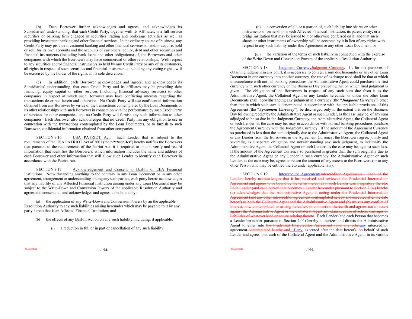 744627140 -154- (b) Each Borrower further acknowledges and agrees, and acknowledges its Subsidiaries’ understanding, that each Credit Party, together with its Affiliates, is a full service securities or banking firm engaged in securities trading and brokerage activities as well as providing investment banking and other financial services. In the ordinary course of business, any Credit Party may provide investment banking and other financial services to, and/or acquire, hold or sell, for its own accounts and the accounts of customers, equity, debt and other securities and financial instruments (including bank loans and other obligations) of, the Borrowers and other companies with which the Borrowers may have commercial or other relationships. With respect to any securities and/or financial instruments so held by any Credit Party or any of its customers, all rights in respect of such securities and financial instruments, including any voting rights, will be exercised by the holder of the rights, in its sole discretion. (c) In addition, each Borrower acknowledges and agrees, and acknowledges its Subsidiaries’ understanding, that each Credit Party and its affiliates may be providing debt financing, equity capital or other services (including financial advisory services) to other companies in respect of which such Borrower may have conflicting interests regarding the transactions described herein and otherwise. No Credit Party will use confidential information obtained from any Borrower by virtue of the transactions contemplated by the Loan Documents or its other relationships with such Borrower in connection with the performance by such Credit Party of services for other companies, and no Credit Party will furnish any such information to other companies. Each Borrower also acknowledges that no Credit Party has any obligation to use in connection with the transactions contemplated by the Loan Documents, or to furnish to such Borrower, confidential information obtained from other companies. SECTION 9.16 USA PATRIOT Act. Each Lender that is subject to the requirements of the USA PATRIOT Act of 2001 (the “Patriot Act”) hereby notifies the Borrowers that pursuant to the requirements of the Patriot Act, it is required to obtain, verify and record information that identifies the Borrowers, which information includes the name and address of each Borrower and other information that will allow such Lender to identify each Borrower in accordance with the Patriot Act. SECTION 9.17 Acknowledgement and Consent to Bail-In of EEA Financial Institutions. Notwithstanding anything to the contrary in any Loan Document or in any other agreement, arrangement or understanding among any such parties, each party hereto acknowledges that any liability of any Affected Financial Institution arising under any Loan Document may be subject to the Write-Down and Conversion Powers of the applicable Resolution Authority and agrees and consents to, and acknowledges and agrees to be bound by: (a) the application of any Write-Down and Conversion Powers by an the applicable Resolution Authority to any such liabilities arising hereunder which may be payable to it by any party hereto that is an Affected Financial Institution; and (b) the effects of any Bail-In Action on any such liability, including, if applicable: (i) a reduction in full or in part or cancellation of any such liability; 744627140 -155- (ii) a conversion of all, or a portion of, such liability into shares or other instruments of ownership in such Affected Financial Institution, its parent entity, or a bridge institution that may be issued to it or otherwise conferred on it, and that such shares or other instruments of ownership will be accepted by it in lieu of any rights with respect to any such liability under this Agreement or any other Loan Document; or (iii) the variation of the terms of such liability in connection with the exercise of the Write-Down and Conversion Powers of the applicable Resolution Authority. SECTION 9.18 Judgment CurrencyJudgment Currency. If, for the purposes of obtaining judgment in any court, it is necessary to convert a sum due hereunder or any other Loan Document in one currency into another currency, the rate of exchange used shall be that at which in accordance with normal banking procedures the Administrative Agent could purchase the first currency with such other currency on the Business Day preceding that on which final judgment is given. The obligation of the Borrowers in respect of any such sum due from it to the Administrative Agent, the Collateral Agent or any Lender hereunder or under the other Loan Documents shall, notwithstanding any judgment in a currency (the “Judgment Currency”) other than that in which such sum is denominated in accordance with the applicable provisions of this Agreement (the “Agreement Currency”), be discharged only to the extent that on the Business Day following receipt by the Administrative Agent or such Lender, as the case may be, of any sum adjudged to be so due in the Judgment Currency, the Administrative Agent, the Collateral Agent or such Lender, as the case may be, may in accordance with normal banking procedures purchase the Agreement Currency with the Judgment Currency. If the amount of the Agreement Currency so purchased is less than the sum originally due to the Administrative Agent, the Collateral Agent or any Lender from the Borrowers in the Agreement Currency, the Borrowers agree, jointly and severally, as a separate obligation and notwithstanding any such judgment, to indemnify the Administrative Agent, the Collateral Agent or such Lender, as the case may be, against such loss. If the amount of the Agreement Currency so purchased is greater than the sum originally due to the Administrative Agent or any Lender in such currency, the Administrative Agent or such Lender, as the case may be, agrees to return the amount of any excess to the Borrowers (or to any other Person