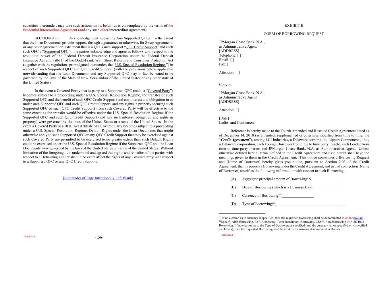 744627140 -156- capacities thereunder, may take such actions on its behalf as is contemplated by the terms of the Prudential Intercreditor Agreement (and any such other intercreditor agreement). SECTION 9.20 Acknowledgement Regarding Any Supported QFCs. To the extent that the Loan Documents provide support, through a guarantee or otherwise, for Swap Agreements or any other agreement or instrument that is a QFC (such support “QFC Credit Support” and each such QFC a “Supported QFC”), the parties acknowledge and agree as follows with respect to the resolution power of the Federal Deposit Insurance Corporation under the Federal Deposit Insurance Act and Title II of the Dodd-Frank Wall Street Reform and Consumer Protection Act (together with the regulations promulgated thereunder, the “U.S. Special Resolution Regimes”) in respect of such Supported QFC and QFC Credit Support (with the provisions below applicable notwithstanding that the Loan Documents and any Supported QFC may in fact be stated to be governed by the laws of the State of New York and/or of the United States or any other state of the United States). In the event a Covered Entity that is party to a Supported QFC (each, a “Covered Party”) becomes subject to a proceeding under a U.S. Special Resolution Regime, the transfer of such Supported QFC and the benefit of such QFC Credit Support (and any interest and obligation in or under such Supported QFC and such QFC Credit Support, and any rights in property securing such Supported QFC or such QFC Credit Support) from such Covered Party will be effective to the same extent as the transfer would be effective under the U.S. Special Resolution Regime if the Supported QFC and such QFC Credit Support (and any such interest, obligation and rights in property) were governed by the laws of the United States or a state of the United States. In the event a Covered Party or a BHC Act Affiliate of a Covered Party becomes subject to a proceeding under a U.S. Special Resolution Regime, Default Rights under the Loan Documents that might otherwise apply to such Supported QFC or any QFC Credit Support that may be exercised against such Covered Party are permitted to be exercised to no greater extent than such Default Rights could be exercised under the U.S. Special Resolution Regime if the Supported QFC and the Loan Documents were governed by the laws of the United States or a state of the United States. Without limitation of the foregoing, it is understood and agreed that rights and remedies of the parties with respect to a Defaulting Lender shall in no event affect the rights of any Covered Party with respect to a Supported QFC or any QFC Credit Support. [Remainder of Page Intentionally Left Blank] 744627140 EXHIBIT B FORM OF BORROWING REQUEST JPMorgan Chase Bank, N.A., as Administrative Agent [ADDRESS] Telephone: [ ] Email: [ ] Fax: [ ] Attention: [ ] Copy to: JPMorgan Chase Bank, N.A., as Administrative Agent [ADDRESS] Attention: [ ] [Date] Ladies and Gentlemen: Reference is hereby made to the Fourth Amended and Restated Credit Agreement dated as of December 14, 2018 (as amended, supplemented or otherwise modified from time to time, the “Credit Agreement”), among LCI Industries, a Delaware corporation, Lippert Components, Inc., a Delaware corporation, each Foreign Borrower from time to time party thereto, each Lender from time to time party thereto and JPMorgan Chase Bank, N.A. as Administrative Agent. Unless otherwise defined herein, terms defined in the Credit Agreement and used herein shall have the meanings given to them in the Credit Agreement. This notice constitutes a Borrowing Request and [Name of Borrower] hereby gives you notice, pursuant to Section 2.03 of the Credit Agreement, that it requests a Borrowing under the Credit Agreement, and in that connection [Name of Borrower] specifies the following information with respect to such Borrowing: (A) Aggregate principal amount of Borrowing: $_________________ (B) Date of Borrowing (which is a Business Day):________________ (C) Currency of Borrowing:41 ________________ (D) Type of Borrowing:52 ____________________________________ 41 If no election as to currency is specified, then the requested Borrowing shall be denominated in dollarsDollars. 52Specify ABR Borrowing, RFR Borrowing, Term Benchmark Borrowing, CDOR Rate Borrowing or AUD Rate Borrowing. If no election as to the Type of Borrowing is specified (and the currency is not specified or is specified as Dollars), then the requested Borrowing shall be an ABR Borrowing denominated in Dollars.