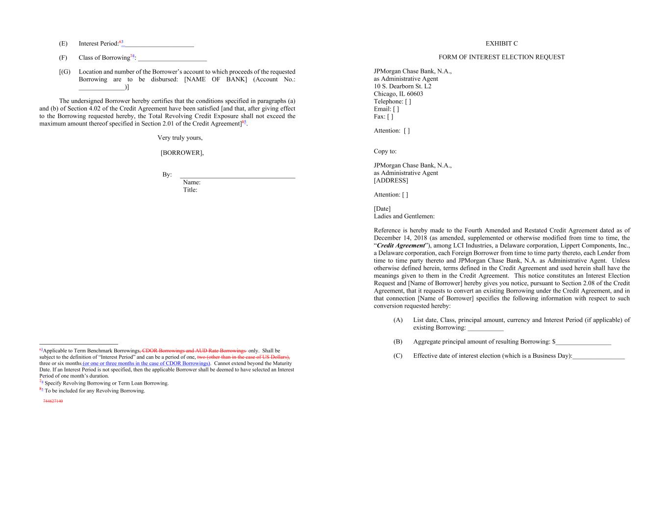 744627140 (E) Interest Period:63 _____________________ (F) Class of Borrowing74: _____________________ [(G) Location and number of the Borrower’s account to which proceeds of the requested Borrowing are to be disbursed: [NAME OF BANK] (Account No.: ______________)] The undersigned Borrower hereby certifies that the conditions specified in paragraphs (a) and (b) of Section 4.02 of the Credit Agreement have been satisfied [and that, after giving effect to the Borrowing requested hereby, the Total Revolving Credit Exposure shall not exceed the maximum amount thereof specified in Section 2.01 of the Credit Agreement]85. Very truly yours, [BORROWER], By: Name: Title: 63Applicable to Term Benchmark Borrowings, CDOR Borrowings and AUD Rate Borrowings only. Shall be subject to the definition of “Interest Period” and can be a period of one, two (other than in the case of US Dollars), three or six months (or one or three months in the case of CDOR Borrowings). Cannot extend beyond the Maturity Date. If an Interest Period is not specified, then the applicable Borrower shall be deemed to have selected an Interest Period of one month’s duration. 74 Specify Revolving Borrowing or Term Loan Borrowing. 85 To be included for any Revolving Borrowing. EXHIBIT C FORM OF INTEREST ELECTION REQUEST JPMorgan Chase Bank, N.A., as Administrative Agent 10 S. Dearborn St. L2 Chicago, IL 60603 Telephone: [ ] Email: [ ] Fax: [ ] Attention: [ ] Copy to: JPMorgan Chase Bank, N.A., as Administrative Agent [ADDRESS] Attention: [ ] [Date] Ladies and Gentlemen: Reference is hereby made to the Fourth Amended and Restated Credit Agreement dated as of December 14, 2018 (as amended, supplemented or otherwise modified from time to time, the “Credit Agreement”), among LCI Industries, a Delaware corporation, Lippert Components, Inc., a Delaware corporation, each Foreign Borrower from time to time party thereto, each Lender from time to time party thereto and JPMorgan Chase Bank, N.A. as Administrative Agent. Unless otherwise defined herein, terms defined in the Credit Agreement and used herein shall have the meanings given to them in the Credit Agreement. This notice constitutes an Interest Election Request and [Name of Borrower] hereby gives you notice, pursuant to Section 2.08 of the Credit Agreement, that it requests to convert an existing Borrowing under the Credit Agreement, and in that connection [Name of Borrower] specifies the following information with respect to such conversion requested hereby: (A) List date, Class, principal amount, currency and Interest Period (if applicable) of existing Borrowing: ___________ (B) Aggregate principal amount of resulting Borrowing: $_________________ (C) Effective date of interest election (which is a Business Day):________________