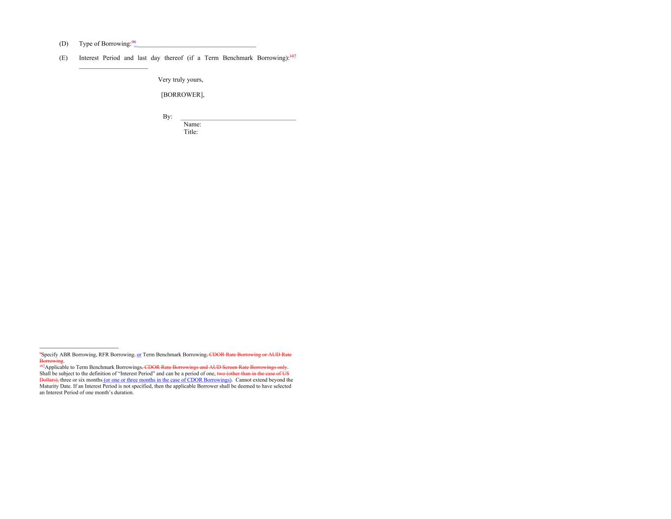 (D) Type of Borrowing:96 ____________________________________ (E) Interest Period and last day thereof (if a Term Benchmark Borrowing):107 _____________________ Very truly yours, [BORROWER], By: Name: Title: 9Specify ABR Borrowing, RFR Borrowing, or Term Benchmark Borrowing, CDOR Rate Borrowing or AUD Rate Borrowing. 107Applicable to Term Benchmark Borrowings, CDOR Rate Borrowings and AUD Screen Rate Borrowings only. Shall be subject to the definition of “Interest Period” and can be a period of one, two (other than in the case of US Dollars), three or six months (or one or three months in the case of CDOR Borrowings). Cannot extend beyond the Maturity Date. If an Interest Period is not specified, then the applicable Borrower shall be deemed to have selected an Interest Period of one month’s duration.