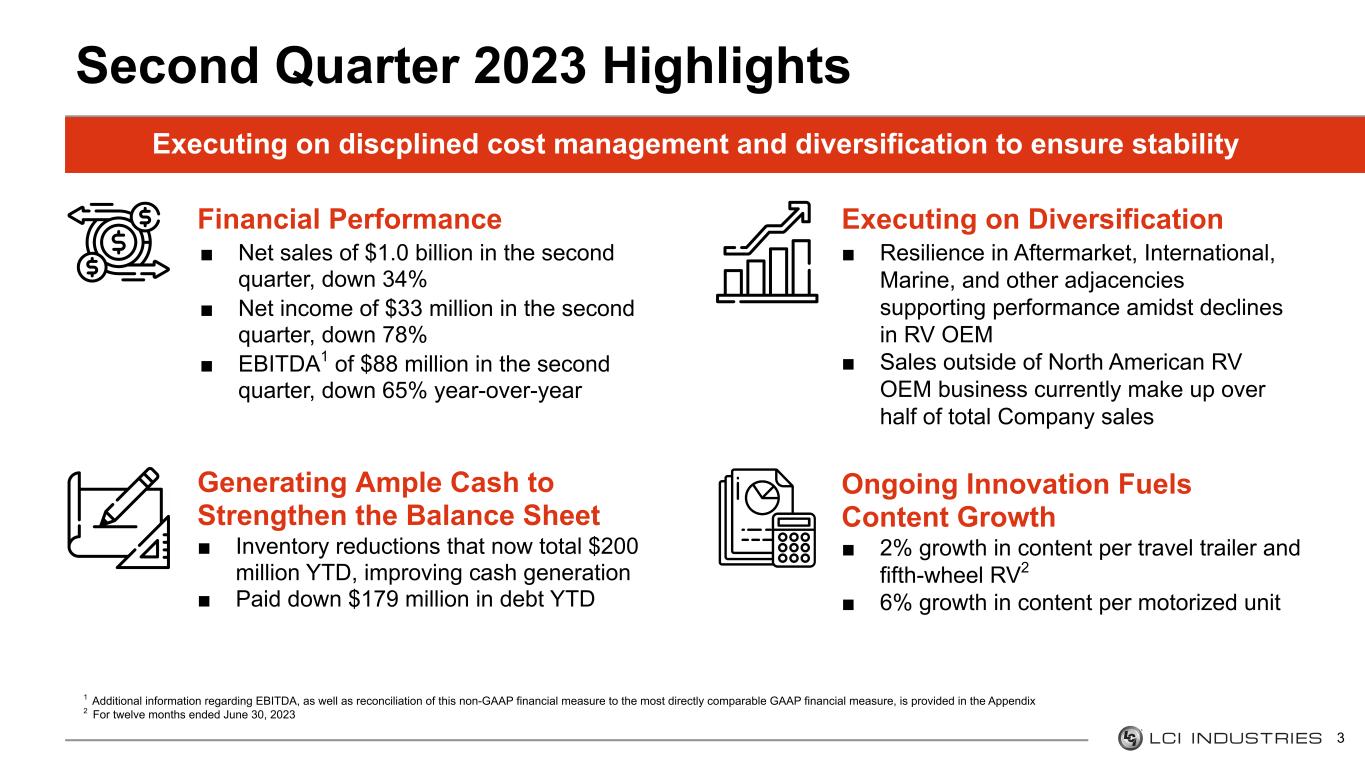 FORWARD-LOOKING STATEMENTS This presentation contains certain “forward-looking statements” with respect to our financial condition, results of operations, business strategies, operating efficiencies or synergies, competitive position, growth opportunities, acquisitions, plans and objectives of management, markets for the Company’s common stock, the impact of legal proceedings, and other matters. Statements in this presentation that are not historical facts are “forward-looking statements” for the purpose of the safe harbor provided by Section 21E of the Securities Exchange Act of 1934, as amended, and Section 27A of the Securities Act of 1933, as amended, and involve a number of risks and uncertainties. Forward-looking statements, including, without limitation, those relating to the Company's future business prospects, net sales, expenses and income (loss), capital expenditures, tax rate, cash flow, financial condition, liquidity, covenant compliance, retail and wholesale demand, integration of acquisitions, R&D investments, commodity prices and industry trends, whenever they occur in this presentation are necessarily estimates reflecting the best judgment of the Company's senior management at the time such statements were made. There are a number of factors, many of which are beyond the Company’s control, which could cause actual results and events to differ materially from those described in the forward-looking statements. These factors include, in addition to other matters described in this presentation, the impacts of COVID-19, or other future pandemics, and the Russia-Ukraine war, and heightened tensions between China and Taiwan on the global economy and on the Company's customers, suppliers, employees, business and cash flows, pricing pressures due to domestic and foreign competition, costs and availability of, and tariffs on, raw materials (particularly steel and aluminum) and other components, seasonality and cyclicality in the industries to which we sell our products, availability of credit for financing the retail and wholesale purchase of products for which we sell our components, inventory levels of retail dealers and manufacturers, availability of transportation for products for which we sell our components, the financial condition of our customers, the financial condition of retail dealers of products for which we sell our components, retention and concentration of significant customers, the costs, pace of and successful integration of acquisitions and other growth initiatives, availability and costs of production facilities and labor, team member benefits, team member retention, realization and impact of expansion plans, efficiency improvements and cost reductions, the disruption of business resulting from natural disasters or other unforeseen events, the successful entry into new markets, the costs of compliance with environmental laws, laws of foreign jurisdictions in which we operate, other operational and financial risks related to conducting business internationally, and increased governmental regulation and oversight, information technology performance and security, the ability to protect intellectual property, warranty and product liability claims or product recalls, interest rates, oil and gasoline prices and availability, the impact of international, national and regional economic conditions and consumer confidence on the retail sale of products for which we sell our components, and other risks and uncertainties discussed more fully under the caption “Risk Factors” in the Company’s Annual Report on Form 10-K for the year ended December 31, 2022, and in the Company’s subsequent filings with the Securities and Exchange Commission, including the Company's Quarterly Reports on the 10-Q. Readers of this presentation are cautioned not to place undue reliance on these forward-looking statements, since there can be no assurance that these forward-looking statements will prove to be accurate. The Company disclaims any obligation or undertaking to update forward-looking statements to reflect circumstances or events that occur after the date the forward-looking statements are made, except as required by law. This presentation includes certain non-GAAP financial measures, such as EBITDA and net debt to EBITDA leverage. These non-GAAP financial measures should not be considered a substitute for the comparable GAAP financial measures. Reconciliations of these non-GAAP financial measures to the most directly comparable GAAP financial measure are included in the presentation. 2