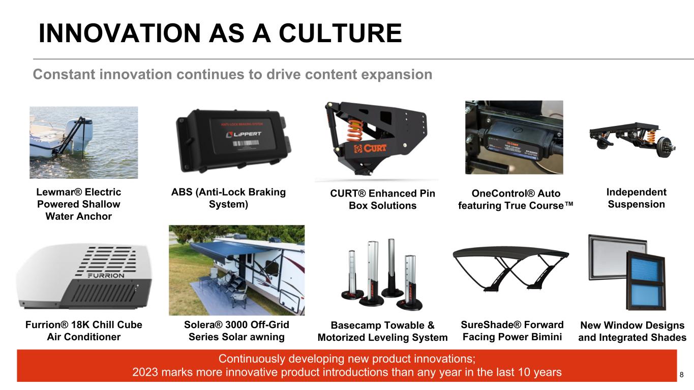 INNOVATION AS A CULTURE Constant innovation continues to drive content expansion Continuously developing new product innovations; 2023 marks more innovative product introductions than any year in the last 10 years 8 Independent Suspension Furrion® 18K Chill Cube Air Conditioner Solera® 3000 Off-Grid Series Solar awning Basecamp Towable & Motorized Leveling System CURT® Enhanced Pin Box Solutions OneControl® Auto featuring True Course™ ABS (Anti-Lock Braking System) SureShade® Forward Facing Power Bimini New Window Designs and Integrated Shades Lewmar® Electric Powered Shallow Water Anchor