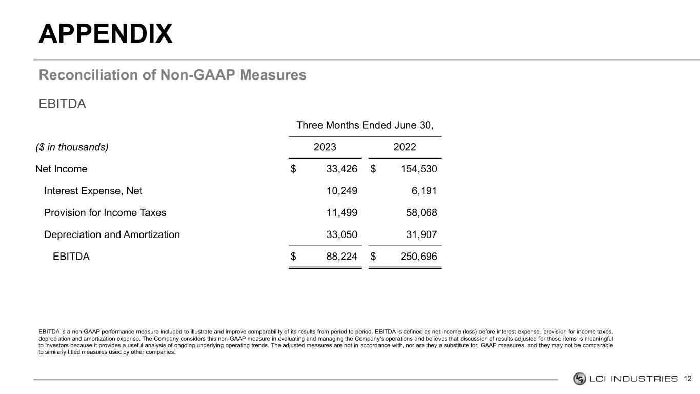 EBITDA Reconciliation of Non-GAAP Measures APPENDIX EBITDA is a non-GAAP performance measure included to illustrate and improve comparability of its results from period to period. EBITDA is defined as net income (loss) before interest expense, provision for income taxes, depreciation and amortization expense. The Company considers this non-GAAP measure in evaluating and managing the Company's operations and believes that discussion of results adjusted for these items is meaningful to investors because it provides a useful analysis of ongoing underlying operating trends. The adjusted measures are not in accordance with, nor are they a substitute for, GAAP measures, and they may not be comparable to similarly titled measures used by other companies. Three Months Ended June 30, ($ in thousands) 2023 2022 Net Income $ 33,426 $ 154,530 Interest Expense, Net 10,249 6,191 Provision for Income Taxes 11,499 58,068 Depreciation and Amortization 33,050 31,907 EBITDA $ 88,224 $ 250,696 12