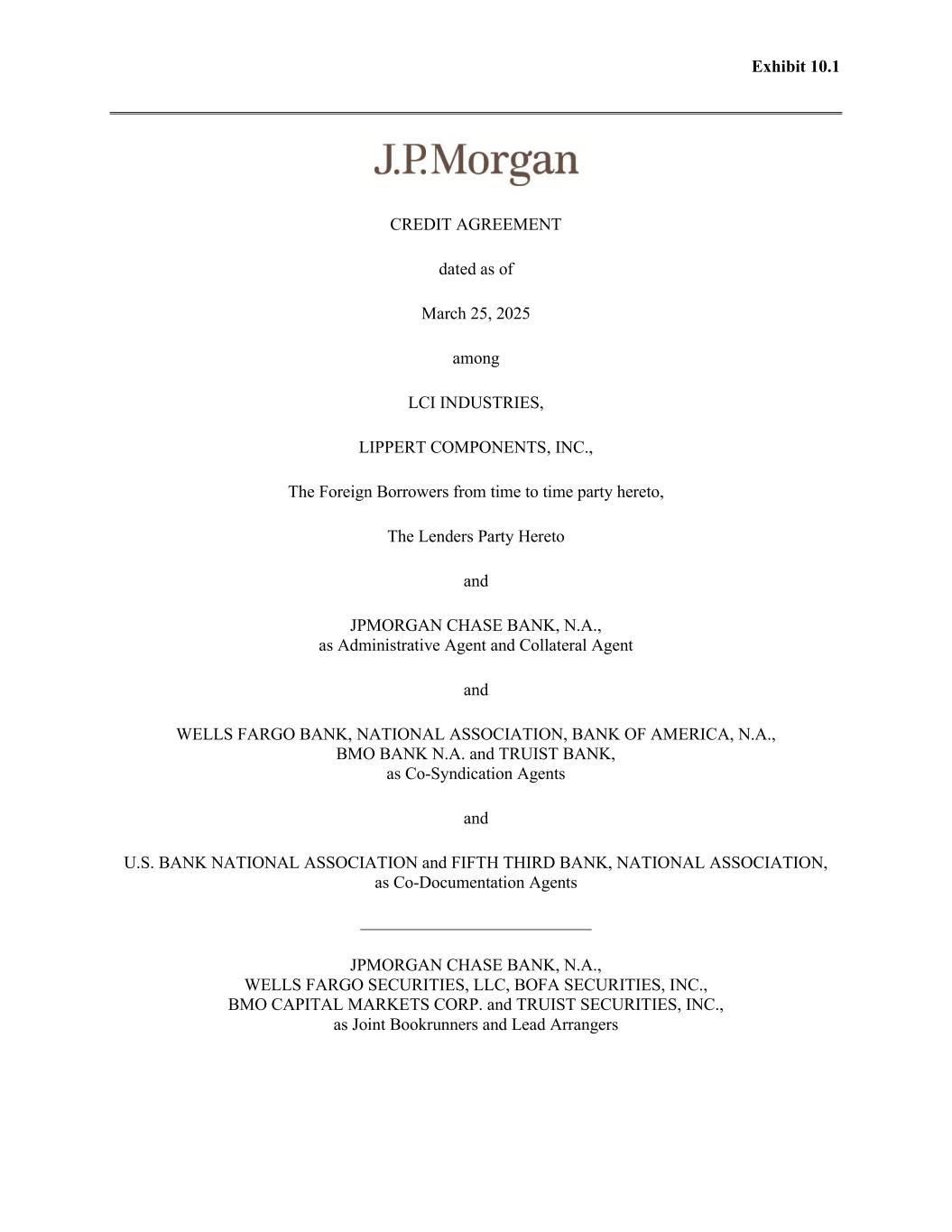 Exhibit 10.1 CREDIT AGREEMENT dated as of March 25, 2025 among LCI INDUSTRIES, LIPPERT COMPONENTS, INC., The Foreign Borrowers from time to time party hereto, The Lenders Party Hereto and JPMORGAN CHASE BANK, N.A., as Administrative Agent and Collateral Agent and WELLS FARGO BANK, NATIONAL ASSOCIATION, BANK OF AMERICA, N.A., BMO BANK N.A. and TRUIST BANK, as Co-Syndication Agents and U.S. BANK NATIONAL ASSOCIATION and FIFTH THIRD BANK, NATIONAL ASSOCIATION, as Co-Documentation Agents ___________________________ JPMORGAN CHASE BANK, N.A., WELLS FARGO SECURITIES, LLC, BOFA SECURITIES, INC., BMO CAPITAL MARKETS CORP. and TRUIST SECURITIES, INC., as Joint Bookrunners and Lead Arrangers