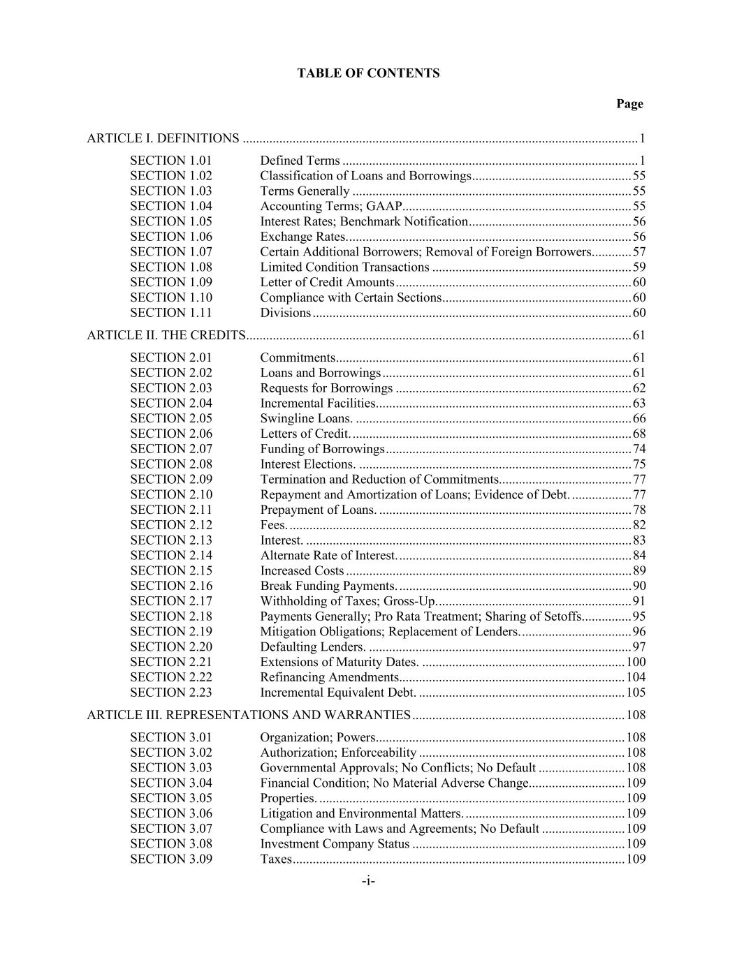 TABLE OF CONTENTS Page -i- ARTICLE I. DEFINITIONS ....................................................................................................................... 1 SECTION 1.01 Defined Terms ......................................................................................... 1 SECTION 1.02 Classification of Loans and Borrowings ................................................ 55 SECTION 1.03 Terms Generally .................................................................................... 55 SECTION 1.04 Accounting Terms; GAAP..................................................................... 55 SECTION 1.05 Interest Rates; Benchmark Notification ................................................. 56 SECTION 1.06 Exchange Rates. ..................................................................................... 56 SECTION 1.07 Certain Additional Borrowers; Removal of Foreign Borrowers. ........... 57 SECTION 1.08 Limited Condition Transactions ............................................................ 59 SECTION 1.09 Letter of Credit Amounts ....................................................................... 60 SECTION 1.10 Compliance with Certain Sections ......................................................... 60 SECTION 1.11 Divisions ................................................................................................ 60 ARTICLE II. THE CREDITS .................................................................................................................... 61 SECTION 2.01 Commitments ......................................................................................... 61 SECTION 2.02 Loans and Borrowings ........................................................................... 61 SECTION 2.03 Requests for Borrowings ....................................................................... 62 SECTION 2.04 Incremental Facilities. ............................................................................ 63 SECTION 2.05 Swingline Loans. ................................................................................... 66 SECTION 2.06 Letters of Credit. .................................................................................... 68 SECTION 2.07 Funding of Borrowings .......................................................................... 74 SECTION 2.08 Interest Elections. .................................................................................. 75 SECTION 2.09 Termination and Reduction of Commitments........................................ 77 SECTION 2.10 Repayment and Amortization of Loans; Evidence of Debt. .................. 77 SECTION 2.11 Prepayment of Loans. ............................................................................ 78 SECTION 2.12 Fees. ....................................................................................................... 82 SECTION 2.13 Interest. .................................................................................................. 83 SECTION 2.14 Alternate Rate of Interest. ...................................................................... 84 SECTION 2.15 Increased Costs ...................................................................................... 89 SECTION 2.16 Break Funding Payments. ...................................................................... 90 SECTION 2.17 Withholding of Taxes; Gross-Up. .......................................................... 91 SECTION 2.18 Payments Generally; Pro Rata Treatment; Sharing of Setoffs. .............. 95 SECTION 2.19 Mitigation Obligations; Replacement of Lenders. ................................. 96 SECTION 2.20 Defaulting Lenders. ............................................................................... 97 SECTION 2.21 Extensions of Maturity Dates. ............................................................. 100 SECTION 2.22 Refinancing Amendments.................................................................... 104 SECTION 2.23 Incremental Equivalent Debt. .............................................................. 105 ARTICLE III. REPRESENTATIONS AND WARRANTIES ................................................................ 108 SECTION 3.01 Organization; Powers ........................................................................... 108 SECTION 3.02 Authorization; Enforceability .............................................................. 108 SECTION 3.03 Governmental Approvals; No Conflicts; No Default .......................... 108 SECTION 3.04 Financial Condition; No Material Adverse Change. ............................ 109 SECTION 3.05 Properties. ............................................................................................ 109 SECTION 3.06 Litigation and Environmental Matters. ................................................ 109 SECTION 3.07 Compliance with Laws and Agreements; No Default ......................... 109 SECTION 3.08 Investment Company Status ................................................................ 109 SECTION 3.09 Taxes .................................................................................................... 109