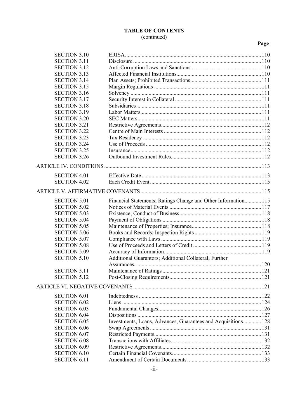 TABLE OF CONTENTS (continued) Page -ii- SECTION 3.10 ERISA .................................................................................................. 110 SECTION 3.11 Disclosure. ........................................................................................... 110 SECTION 3.12 Anti-Corruption Laws and Sanctions .................................................. 110 SECTION 3.13 Affected Financial Institutions ............................................................. 110 SECTION 3.14 Plan Assets; Prohibited Transactions ................................................... 111 SECTION 3.15 Margin Regulations ............................................................................. 111 SECTION 3.16 Solvency .............................................................................................. 111 SECTION 3.17 Security Interest in Collateral .............................................................. 111 SECTION 3.18 Subsidiaries .......................................................................................... 111 SECTION 3.19 Labor Matters ....................................................................................... 111 SECTION 3.20 SEC Matters ......................................................................................... 111 SECTION 3.21 Restrictive Agreements ........................................................................ 112 SECTION 3.22 Centre of Main Interests ...................................................................... 112 SECTION 3.23 Tax Residency ..................................................................................... 112 SECTION 3.24 Use of Proceeds ................................................................................... 112 SECTION 3.25 Insurance .............................................................................................. 112 SECTION 3.26 Outbound Investment Rules................................................................. 112 ARTICLE IV. CONDITIONS ................................................................................................................. 113 SECTION 4.01 Effective Date ...................................................................................... 113 SECTION 4.02 Each Credit Event ................................................................................ 115 ARTICLE V. AFFIRMATIVE COVENANTS ....................................................................................... 115 SECTION 5.01 Financial Statements; Ratings Change and Other Information ............ 115 SECTION 5.02 Notices of Material Events .................................................................. 117 SECTION 5.03 Existence; Conduct of Business ........................................................... 118 SECTION 5.04 Payment of Obligations ....................................................................... 118 SECTION 5.05 Maintenance of Properties; Insurance .................................................. 118 SECTION 5.06 Books and Records; Inspection Rights ................................................ 119 SECTION 5.07 Compliance with Laws ........................................................................ 119 SECTION 5.08 Use of Proceeds and Letters of Credit ................................................. 119 SECTION 5.09 Accuracy of Information ...................................................................... 119 SECTION 5.10 Additional Guarantors; Additional Collateral; Further Assurances. .......................................................................................... 120 SECTION 5.11 Maintenance of Ratings ....................................................................... 121 SECTION 5.12 Post-Closing Requirements.................................................................. 121 ARTICLE VI. NEGATIVE COVENANTS ............................................................................................ 121 SECTION 6.01 Indebtedness ........................................................................................ 122 SECTION 6.02 Liens .................................................................................................... 124 SECTION 6.03 Fundamental Changes. ......................................................................... 126 SECTION 6.04 Dispositions ......................................................................................... 127 SECTION 6.05 Investments, Loans, Advances, Guarantees and Acquisitions ............. 128 SECTION 6.06 Swap Agreements ................................................................................ 131 SECTION 6.07 Restricted Payments ............................................................................. 131 SECTION 6.08 Transactions with Affiliates ................................................................. 132 SECTION 6.09 Restrictive Agreements ........................................................................ 132 SECTION 6.10 Certain Financial Covenants. ............................................................... 133 SECTION 6.11 Amendment of Certain Documents. .................................................... 133