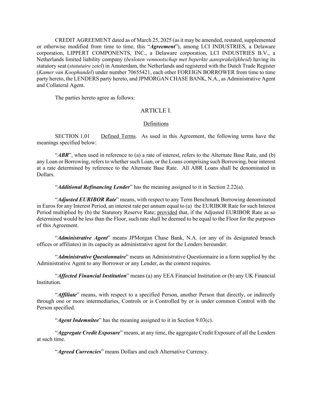 CREDIT AGREEMENT dated as of March 25, 2025 (as it may be amended, restated, supplemented or otherwise modified from time to time, this “Agreement”), among LCI INDUSTRIES, a Delaware corporation, LIPPERT COMPONENTS, INC., a Delaware corporation, LCI INDUSTRIES B.V., a Netherlands limited liability company (besloten vennootschap met beperkte aansprakelijkheid) having its statutory seat (statutaire zetel) in Amsterdam, the Netherlands and registered with the Dutch Trade Register (Kamer van Koophandel) under number 70655421, each other FOREIGN BORROWER from time to time party hereto, the LENDERS party hereto, and JPMORGAN CHASE BANK, N.A., as Administrative Agent and Collateral Agent. The parties hereto agree as follows: ARTICLE I. Definitions SECTION 1.01 Defined Terms. As used in this Agreement, the following terms have the meanings specified below: “ABR”, when used in reference to (a) a rate of interest, refers to the Alternate Base Rate, and (b) any Loan or Borrowing, refers to whether such Loan, or the Loans comprising such Borrowing, bear interest at a rate determined by reference to the Alternate Base Rate. All ABR Loans shall be denominated in Dollars. “Additional Refinancing Lender” has the meaning assigned to it in Section 2.22(a). “Adjusted EURIBOR Rate” means, with respect to any Term Benchmark Borrowing denominated in Euros for any Interest Period, an interest rate per annum equal to (a) the EURIBOR Rate for such Interest Period multiplied by (b) the Statutory Reserve Rate; provided that, if the Adjusted EURIBOR Rate as so determined would be less than the Floor, such rate shall be deemed to be equal to the Floor for the purposes of this Agreement. “Administrative Agent” means JPMorgan Chase Bank, N.A. (or any of its designated branch offices or affiliates) in its capacity as administrative agent for the Lenders hereunder. “Administrative Questionnaire” means an Administrative Questionnaire in a form supplied by the Administrative Agent to any Borrower or any Lender, as the context requires. “Affected Financial Institution” means (a) any EEA Financial Institution or (b) any UK Financial Institution. “Affiliate” means, with respect to a specified Person, another Person that directly, or indirectly through one or more intermediaries, Controls or is Controlled by or is under common Control with the Person specified. “Agent Indemnitee” has the meaning assigned to it in Section 9.03(c). “Aggregate Credit Exposure” means, at any time, the aggregate Credit Exposure of all the Lenders at such time. “Agreed Currencies” means Dollars and each Alternative Currency.