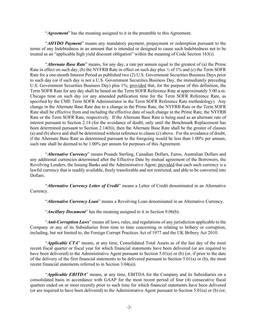 -2- “Agreement” has the meaning assigned to it in the preamble to this Agreement. “AHYDO Payment” means any mandatory payment, prepayment or redemption pursuant to the terms of any Indebtedness in an amount that is intended or designed to cause such Indebtedness not to be treated as an “applicable high yield discount obligation” within the meaning of Code Section 163(i). “Alternate Base Rate” means, for any day, a rate per annum equal to the greatest of (a) the Prime Rate in effect on such day, (b) the NYFRB Rate in effect on such day plus ½ of 1% and (c) the Term SOFR Rate for a one-month Interest Period as published two (2) U.S. Government Securities Business Days prior to such day (or if such day is not a U.S. Government Securities Business Day, the immediately preceding U.S. Government Securities Business Day) plus 1%; provided that, for the purpose of this definition, the Term SOFR Rate for any day shall be based on the Term SOFR Reference Rate at approximately 5:00 a.m. Chicago time on such day (or any amended publication time for the Term SOFR Reference Rate, as specified by the CME Term SOFR Administrator in the Term SOFR Reference Rate methodology). Any change in the Alternate Base Rate due to a change in the Prime Rate, the NYFRB Rate or the Term SOFR Rate shall be effective from and including the effective date of such change in the Prime Rate, the NYFRB Rate or the Term SOFR Rate, respectively. If the Alternate Base Rate is being used as an alternate rate of interest pursuant to Section 2.14 (for the avoidance of doubt, only until the Benchmark Replacement has been determined pursuant to Section 2.14(b)), then the Alternate Base Rate shall be the greater of clauses (a) and (b) above and shall be determined without reference to clause (c) above. For the avoidance of doubt, if the Alternate Base Rate as determined pursuant to the foregoing would be less than 1.00% per annum, such rate shall be deemed to be 1.00% per annum for purposes of this Agreement. “Alternative Currency” means Pounds Sterling, Canadian Dollars, Euros, Australian Dollars and any additional currencies determined after the Effective Date by mutual agreement of the Borrowers, the Revolving Lenders, the Issuing Banks and the Administrative Agent; provided that each such currency is a lawful currency that is readily available, freely transferable and not restricted, and able to be converted into Dollars. “Alternative Currency Letter of Credit” means a Letter of Credit denominated in an Alternative Currency. “Alternative Currency Loan” means a Revolving Loan denominated in an Alternative Currency. “Ancillary Document” has the meaning assigned to it in Section 9.06(b). “Anti-Corruption Laws” means all laws, rules, and regulations of any jurisdiction applicable to the Company or any of its Subsidiaries from time to time concerning or relating to bribery or corruption, including, but not limited to, the Foreign Corrupt Practices Act of 1977 and the UK Bribery Act 2010. “Applicable CTA” means, at any time, Consolidated Total Assets as of the last day of the most recent fiscal quarter or fiscal year for which financial statements have been delivered (or are required to have been delivered) to the Administrative Agent pursuant to Section 5.01(a) or (b) (or, if prior to the date of the delivery of the first financial statements to be delivered pursuant to Section 5.01(a) or (b), the most recent financial statements referred to in Section 3.04(a)). “Applicable EBITDA” means, at any time, EBITDA for the Company and its Subsidiaries on a consolidated basis in accordance with GAAP for the most recent period of four (4) consecutive fiscal quarters ended on or most recently prior to such time for which financial statements have been delivered (or are required to have been delivered) to the Administrative Agent pursuant to Section 5.01(a) or (b) (or,