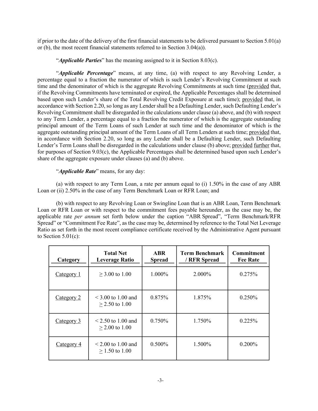 -3- if prior to the date of the delivery of the first financial statements to be delivered pursuant to Section 5.01(a) or (b), the most recent financial statements referred to in Section 3.04(a)). “Applicable Parties” has the meaning assigned to it in Section 8.03(c). “Applicable Percentage” means, at any time, (a) with respect to any Revolving Lender, a percentage equal to a fraction the numerator of which is such Lender’s Revolving Commitment at such time and the denominator of which is the aggregate Revolving Commitments at such time (provided that, if the Revolving Commitments have terminated or expired, the Applicable Percentages shall be determined based upon such Lender’s share of the Total Revolving Credit Exposure at such time); provided that, in accordance with Section 2.20, so long as any Lender shall be a Defaulting Lender, such Defaulting Lender’s Revolving Commitment shall be disregarded in the calculations under clause (a) above, and (b) with respect to any Term Lender, a percentage equal to a fraction the numerator of which is the aggregate outstanding principal amount of the Term Loans of such Lender at such time and the denominator of which is the aggregate outstanding principal amount of the Term Loans of all Term Lenders at such time; provided that, in accordance with Section 2.20, so long as any Lender shall be a Defaulting Lender, such Defaulting Lender’s Term Loans shall be disregarded in the calculations under clause (b) above; provided further that, for purposes of Section 9.03(c), the Applicable Percentages shall be determined based upon such Lender’s share of the aggregate exposure under clauses (a) and (b) above. “Applicable Rate” means, for any day: (a) with respect to any Term Loan, a rate per annum equal to (i) 1.50% in the case of any ABR Loan or (ii) 2.50% in the case of any Term Benchmark Loan or RFR Loan; and (b) with respect to any Revolving Loan or Swingline Loan that is an ABR Loan, Term Benchmark Loan or RFR Loan or with respect to the commitment fees payable hereunder, as the case may be, the applicable rate per annum set forth below under the caption “ABR Spread”, “Term Benchmark/RFR Spread” or “Commitment Fee Rate”, as the case may be, determined by reference to the Total Net Leverage Ratio as set forth in the most recent compliance certificate received by the Administrative Agent pursuant to Section 5.01(c): Category Total Net Leverage Ratio ABR Spread Term Benchmark / RFR Spread Commitment Fee Rate Category 1 ≥ 3.00 to 1.00 1.000% 2.000% 0.275% Category 2 < 3.00 to 1.00 and > 2.50 to 1.00 0.875% 1.875% 0.250% Category 3 < 2.50 to 1.00 and > 2.00 to 1.00 0.750% 1.750% 0.225% Category 4 < 2.00 to 1.00 and > 1.50 to 1.00 0.500% 1.500% 0.200%