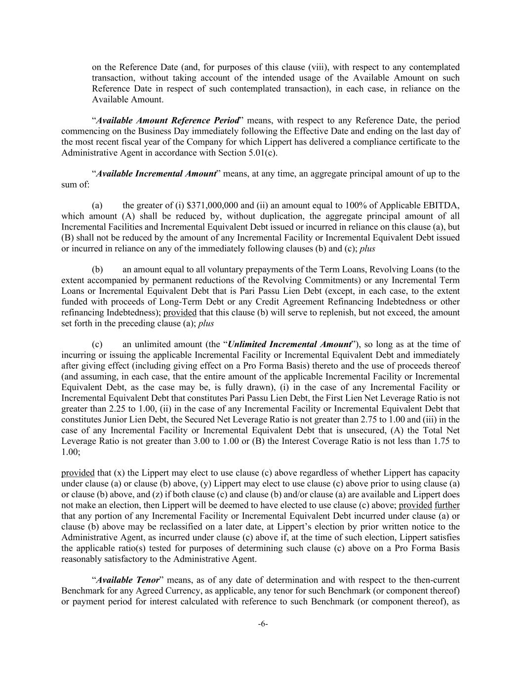 -6- on the Reference Date (and, for purposes of this clause (viii), with respect to any contemplated transaction, without taking account of the intended usage of the Available Amount on such Reference Date in respect of such contemplated transaction), in each case, in reliance on the Available Amount. “Available Amount Reference Period” means, with respect to any Reference Date, the period commencing on the Business Day immediately following the Effective Date and ending on the last day of the most recent fiscal year of the Company for which Lippert has delivered a compliance certificate to the Administrative Agent in accordance with Section 5.01(c). “Available Incremental Amount” means, at any time, an aggregate principal amount of up to the sum of: (a) the greater of (i) $371,000,000 and (ii) an amount equal to 100% of Applicable EBITDA, which amount (A) shall be reduced by, without duplication, the aggregate principal amount of all Incremental Facilities and Incremental Equivalent Debt issued or incurred in reliance on this clause (a), but (B) shall not be reduced by the amount of any Incremental Facility or Incremental Equivalent Debt issued or incurred in reliance on any of the immediately following clauses (b) and (c); plus (b) an amount equal to all voluntary prepayments of the Term Loans, Revolving Loans (to the extent accompanied by permanent reductions of the Revolving Commitments) or any Incremental Term Loans or Incremental Equivalent Debt that is Pari Passu Lien Debt (except, in each case, to the extent funded with proceeds of Long-Term Debt or any Credit Agreement Refinancing Indebtedness or other refinancing Indebtedness); provided that this clause (b) will serve to replenish, but not exceed, the amount set forth in the preceding clause (a); plus (c) an unlimited amount (the “Unlimited Incremental Amount”), so long as at the time of incurring or issuing the applicable Incremental Facility or Incremental Equivalent Debt and immediately after giving effect (including giving effect on a Pro Forma Basis) thereto and the use of proceeds thereof (and assuming, in each case, that the entire amount of the applicable Incremental Facility or Incremental Equivalent Debt, as the case may be, is fully drawn), (i) in the case of any Incremental Facility or Incremental Equivalent Debt that constitutes Pari Passu Lien Debt, the First Lien Net Leverage Ratio is not greater than 2.25 to 1.00, (ii) in the case of any Incremental Facility or Incremental Equivalent Debt that constitutes Junior Lien Debt, the Secured Net Leverage Ratio is not greater than 2.75 to 1.00 and (iii) in the case of any Incremental Facility or Incremental Equivalent Debt that is unsecured, (A) the Total Net Leverage Ratio is not greater than 3.00 to 1.00 or (B) the Interest Coverage Ratio is not less than 1.75 to 1.00; provided that (x) the Lippert may elect to use clause (c) above regardless of whether Lippert has capacity under clause (a) or clause (b) above, (y) Lippert may elect to use clause (c) above prior to using clause (a) or clause (b) above, and (z) if both clause (c) and clause (b) and/or clause (a) are available and Lippert does not make an election, then Lippert will be deemed to have elected to use clause (c) above; provided further that any portion of any Incremental Facility or Incremental Equivalent Debt incurred under clause (a) or clause (b) above may be reclassified on a later date, at Lippert’s election by prior written notice to the Administrative Agent, as incurred under clause (c) above if, at the time of such election, Lippert satisfies the applicable ratio(s) tested for purposes of determining such clause (c) above on a Pro Forma Basis reasonably satisfactory to the Administrative Agent. “Available Tenor” means, as of any date of determination and with respect to the then-current Benchmark for any Agreed Currency, as applicable, any tenor for such Benchmark (or component thereof) or payment period for interest calculated with reference to such Benchmark (or component thereof), as