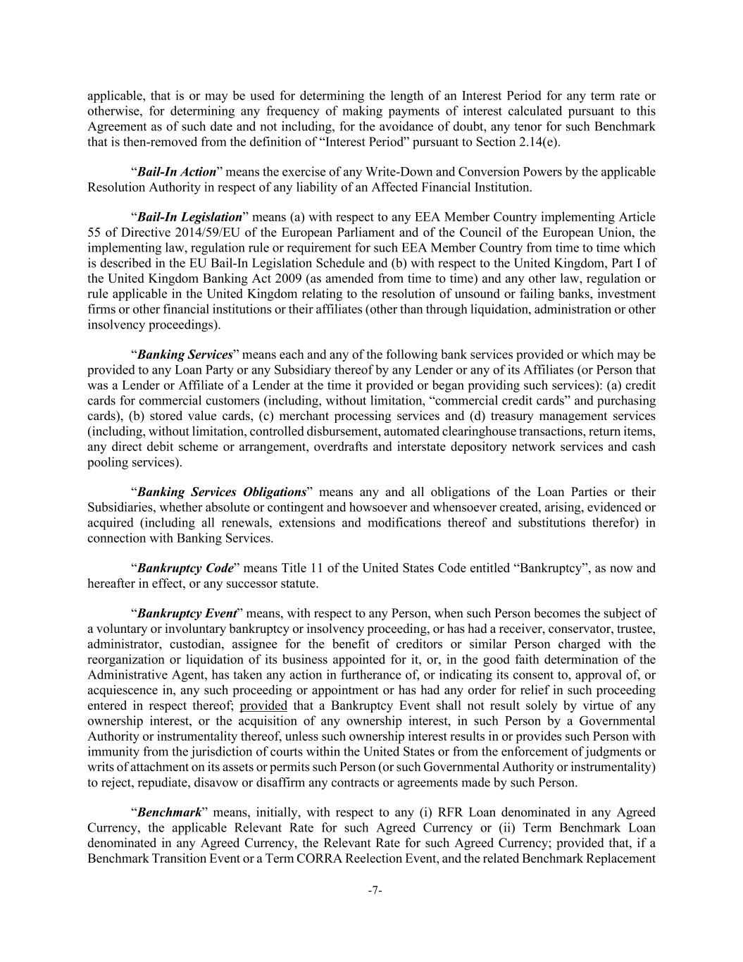 -7- applicable, that is or may be used for determining the length of an Interest Period for any term rate or otherwise, for determining any frequency of making payments of interest calculated pursuant to this Agreement as of such date and not including, for the avoidance of doubt, any tenor for such Benchmark that is then-removed from the definition of “Interest Period” pursuant to Section 2.14(e). “Bail-In Action” means the exercise of any Write-Down and Conversion Powers by the applicable Resolution Authority in respect of any liability of an Affected Financial Institution. “Bail-In Legislation” means (a) with respect to any EEA Member Country implementing Article 55 of Directive 2014/59/EU of the European Parliament and of the Council of the European Union, the implementing law, regulation rule or requirement for such EEA Member Country from time to time which is described in the EU Bail-In Legislation Schedule and (b) with respect to the United Kingdom, Part I of the United Kingdom Banking Act 2009 (as amended from time to time) and any other law, regulation or rule applicable in the United Kingdom relating to the resolution of unsound or failing banks, investment firms or other financial institutions or their affiliates (other than through liquidation, administration or other insolvency proceedings). “Banking Services” means each and any of the following bank services provided or which may be provided to any Loan Party or any Subsidiary thereof by any Lender or any of its Affiliates (or Person that was a Lender or Affiliate of a Lender at the time it provided or began providing such services): (a) credit cards for commercial customers (including, without limitation, “commercial credit cards” and purchasing cards), (b) stored value cards, (c) merchant processing services and (d) treasury management services (including, without limitation, controlled disbursement, automated clearinghouse transactions, return items, any direct debit scheme or arrangement, overdrafts and interstate depository network services and cash pooling services). “Banking Services Obligations” means any and all obligations of the Loan Parties or their Subsidiaries, whether absolute or contingent and howsoever and whensoever created, arising, evidenced or acquired (including all renewals, extensions and modifications thereof and substitutions therefor) in connection with Banking Services. “Bankruptcy Code” means Title 11 of the United States Code entitled “Bankruptcy”, as now and hereafter in effect, or any successor statute. “Bankruptcy Event” means, with respect to any Person, when such Person becomes the subject of a voluntary or involuntary bankruptcy or insolvency proceeding, or has had a receiver, conservator, trustee, administrator, custodian, assignee for the benefit of creditors or similar Person charged with the reorganization or liquidation of its business appointed for it, or, in the good faith determination of the Administrative Agent, has taken any action in furtherance of, or indicating its consent to, approval of, or acquiescence in, any such proceeding or appointment or has had any order for relief in such proceeding entered in respect thereof; provided that a Bankruptcy Event shall not result solely by virtue of any ownership interest, or the acquisition of any ownership interest, in such Person by a Governmental Authority or instrumentality thereof, unless such ownership interest results in or provides such Person with immunity from the jurisdiction of courts within the United States or from the enforcement of judgments or writs of attachment on its assets or permits such Person (or such Governmental Authority or instrumentality) to reject, repudiate, disavow or disaffirm any contracts or agreements made by such Person. “Benchmark” means, initially, with respect to any (i) RFR Loan denominated in any Agreed Currency, the applicable Relevant Rate for such Agreed Currency or (ii) Term Benchmark Loan denominated in any Agreed Currency, the Relevant Rate for such Agreed Currency; provided that, if a Benchmark Transition Event or a Term CORRA Reelection Event, and the related Benchmark Replacement
