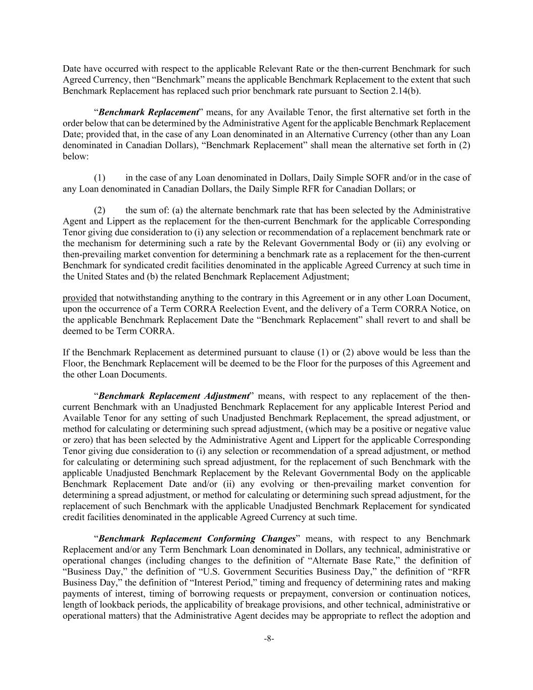 -8- Date have occurred with respect to the applicable Relevant Rate or the then-current Benchmark for such Agreed Currency, then “Benchmark” means the applicable Benchmark Replacement to the extent that such Benchmark Replacement has replaced such prior benchmark rate pursuant to Section 2.14(b). “Benchmark Replacement” means, for any Available Tenor, the first alternative set forth in the order below that can be determined by the Administrative Agent for the applicable Benchmark Replacement Date; provided that, in the case of any Loan denominated in an Alternative Currency (other than any Loan denominated in Canadian Dollars), “Benchmark Replacement” shall mean the alternative set forth in (2) below: (1) in the case of any Loan denominated in Dollars, Daily Simple SOFR and/or in the case of any Loan denominated in Canadian Dollars, the Daily Simple RFR for Canadian Dollars; or (2) the sum of: (a) the alternate benchmark rate that has been selected by the Administrative Agent and Lippert as the replacement for the then-current Benchmark for the applicable Corresponding Tenor giving due consideration to (i) any selection or recommendation of a replacement benchmark rate or the mechanism for determining such a rate by the Relevant Governmental Body or (ii) any evolving or then-prevailing market convention for determining a benchmark rate as a replacement for the then-current Benchmark for syndicated credit facilities denominated in the applicable Agreed Currency at such time in the United States and (b) the related Benchmark Replacement Adjustment; provided that notwithstanding anything to the contrary in this Agreement or in any other Loan Document, upon the occurrence of a Term CORRA Reelection Event, and the delivery of a Term CORRA Notice, on the applicable Benchmark Replacement Date the “Benchmark Replacement” shall revert to and shall be deemed to be Term CORRA. If the Benchmark Replacement as determined pursuant to clause (1) or (2) above would be less than the Floor, the Benchmark Replacement will be deemed to be the Floor for the purposes of this Agreement and the other Loan Documents. “Benchmark Replacement Adjustment” means, with respect to any replacement of the then- current Benchmark with an Unadjusted Benchmark Replacement for any applicable Interest Period and Available Tenor for any setting of such Unadjusted Benchmark Replacement, the spread adjustment, or method for calculating or determining such spread adjustment, (which may be a positive or negative value or zero) that has been selected by the Administrative Agent and Lippert for the applicable Corresponding Tenor giving due consideration to (i) any selection or recommendation of a spread adjustment, or method for calculating or determining such spread adjustment, for the replacement of such Benchmark with the applicable Unadjusted Benchmark Replacement by the Relevant Governmental Body on the applicable Benchmark Replacement Date and/or (ii) any evolving or then-prevailing market convention for determining a spread adjustment, or method for calculating or determining such spread adjustment, for the replacement of such Benchmark with the applicable Unadjusted Benchmark Replacement for syndicated credit facilities denominated in the applicable Agreed Currency at such time. “Benchmark Replacement Conforming Changes” means, with respect to any Benchmark Replacement and/or any Term Benchmark Loan denominated in Dollars, any technical, administrative or operational changes (including changes to the definition of “Alternate Base Rate,” the definition of “Business Day,” the definition of “U.S. Government Securities Business Day,” the definition of “RFR Business Day,” the definition of “Interest Period,” timing and frequency of determining rates and making payments of interest, timing of borrowing requests or prepayment, conversion or continuation notices, length of lookback periods, the applicability of breakage provisions, and other technical, administrative or operational matters) that the Administrative Agent decides may be appropriate to reflect the adoption and