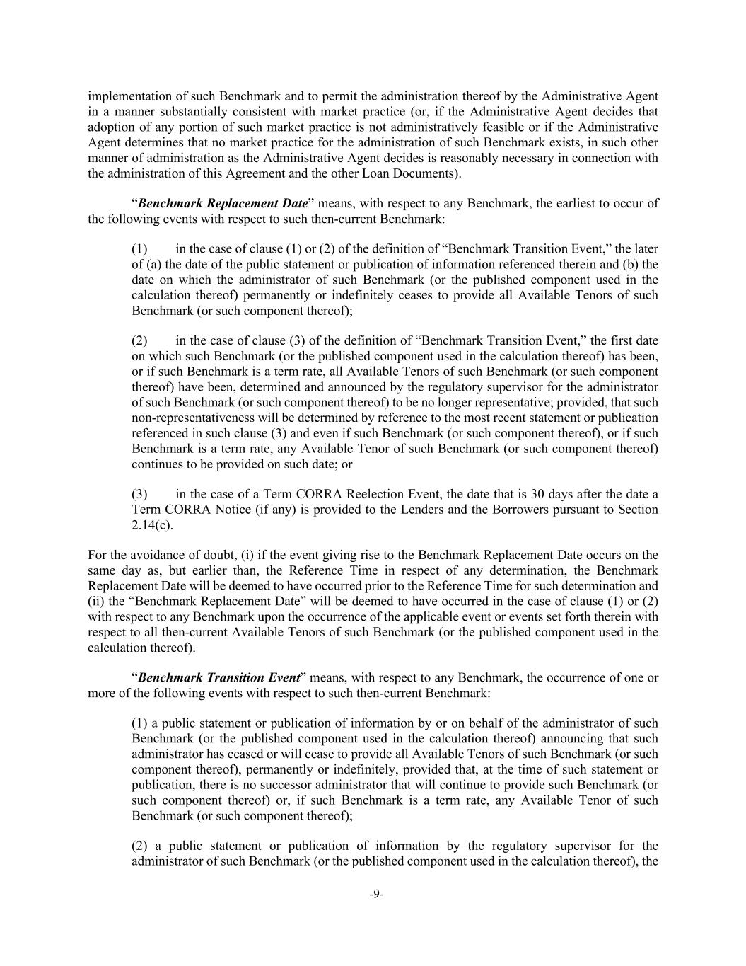-9- implementation of such Benchmark and to permit the administration thereof by the Administrative Agent in a manner substantially consistent with market practice (or, if the Administrative Agent decides that adoption of any portion of such market practice is not administratively feasible or if the Administrative Agent determines that no market practice for the administration of such Benchmark exists, in such other manner of administration as the Administrative Agent decides is reasonably necessary in connection with the administration of this Agreement and the other Loan Documents). “Benchmark Replacement Date” means, with respect to any Benchmark, the earliest to occur of the following events with respect to such then-current Benchmark: (1) in the case of clause (1) or (2) of the definition of “Benchmark Transition Event,” the later of (a) the date of the public statement or publication of information referenced therein and (b) the date on which the administrator of such Benchmark (or the published component used in the calculation thereof) permanently or indefinitely ceases to provide all Available Tenors of such Benchmark (or such component thereof); (2) in the case of clause (3) of the definition of “Benchmark Transition Event,” the first date on which such Benchmark (or the published component used in the calculation thereof) has been, or if such Benchmark is a term rate, all Available Tenors of such Benchmark (or such component thereof) have been, determined and announced by the regulatory supervisor for the administrator of such Benchmark (or such component thereof) to be no longer representative; provided, that such non-representativeness will be determined by reference to the most recent statement or publication referenced in such clause (3) and even if such Benchmark (or such component thereof), or if such Benchmark is a term rate, any Available Tenor of such Benchmark (or such component thereof) continues to be provided on such date; or (3) in the case of a Term CORRA Reelection Event, the date that is 30 days after the date a Term CORRA Notice (if any) is provided to the Lenders and the Borrowers pursuant to Section 2.14(c). For the avoidance of doubt, (i) if the event giving rise to the Benchmark Replacement Date occurs on the same day as, but earlier than, the Reference Time in respect of any determination, the Benchmark Replacement Date will be deemed to have occurred prior to the Reference Time for such determination and (ii) the “Benchmark Replacement Date” will be deemed to have occurred in the case of clause (1) or (2) with respect to any Benchmark upon the occurrence of the applicable event or events set forth therein with respect to all then-current Available Tenors of such Benchmark (or the published component used in the calculation thereof). “Benchmark Transition Event” means, with respect to any Benchmark, the occurrence of one or more of the following events with respect to such then-current Benchmark: (1) a public statement or publication of information by or on behalf of the administrator of such Benchmark (or the published component used in the calculation thereof) announcing that such administrator has ceased or will cease to provide all Available Tenors of such Benchmark (or such component thereof), permanently or indefinitely, provided that, at the time of such statement or publication, there is no successor administrator that will continue to provide such Benchmark (or such component thereof) or, if such Benchmark is a term rate, any Available Tenor of such Benchmark (or such component thereof); (2) a public statement or publication of information by the regulatory supervisor for the administrator of such Benchmark (or the published component used in the calculation thereof), the