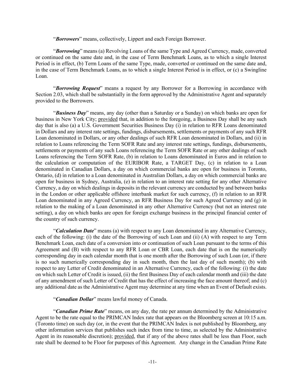-11- “Borrowers” means, collectively, Lippert and each Foreign Borrower. “Borrowing” means (a) Revolving Loans of the same Type and Agreed Currency, made, converted or continued on the same date and, in the case of Term Benchmark Loans, as to which a single Interest Period is in effect, (b) Term Loans of the same Type, made, converted or continued on the same date and, in the case of Term Benchmark Loans, as to which a single Interest Period is in effect, or (c) a Swingline Loan. “Borrowing Request” means a request by any Borrower for a Borrowing in accordance with Section 2.03, which shall be substantially in the form approved by the Administrative Agent and separately provided to the Borrowers. “Business Day” means, any day (other than a Saturday or a Sunday) on which banks are open for business in New York City; provided that, in addition to the foregoing, a Business Day shall be any such day that is also (a) a U.S. Government Securities Business Day (i) in relation to RFR Loans denominated in Dollars and any interest rate settings, fundings, disbursements, settlements or payments of any such RFR Loan denominated in Dollars, or any other dealings of such RFR Loan denominated in Dollars, and (ii) in relation to Loans referencing the Term SOFR Rate and any interest rate settings, fundings, disbursements, settlements or payments of any such Loans referencing the Term SOFR Rate or any other dealings of such Loans referencing the Term SOFR Rate, (b) in relation to Loans denominated in Euros and in relation to the calculation or computation of the EURIBOR Rate, a TARGET Day, (c) in relation to a Loan denominated in Canadian Dollars, a day on which commercial banks are open for business in Toronto, Ontario, (d) in relation to a Loan denominated in Australian Dollars, a day on which commercial banks are open for business in Sydney, Australia, (e) in relation to an interest rate setting for any other Alternative Currency, a day on which dealings in deposits in the relevant currency are conducted by and between banks in the London or other applicable offshore interbank market for such currency, (f) in relation to an RFR Loan denominated in any Agreed Currency, an RFR Business Day for such Agreed Currency and (g) in relation to the making of a Loan denominated in any other Alternative Currency (but not an interest rate setting), a day on which banks are open for foreign exchange business in the principal financial center of the country of such currency. “Calculation Date” means (a) with respect to any Loan denominated in any Alternative Currency, each of the following: (i) the date of the Borrowing of such Loan and (ii) (A) with respect to any Term Benchmark Loan, each date of a conversion into or continuation of such Loan pursuant to the terms of this Agreement and (B) with respect to any RFR Loan or CBR Loan, each date that is on the numerically corresponding day in each calendar month that is one month after the Borrowing of such Loan (or, if there is no such numerically corresponding day in such month, then the last day of such month); (b) with respect to any Letter of Credit denominated in an Alternative Currency, each of the following: (i) the date on which such Letter of Credit is issued, (ii) the first Business Day of each calendar month and (iii) the date of any amendment of such Letter of Credit that has the effect of increasing the face amount thereof; and (c) any additional date as the Administrative Agent may determine at any time when an Event of Default exists. “Canadian Dollar” means lawful money of Canada. “Canadian Prime Rate” means, on any day, the rate per annum determined by the Administrative Agent to be the rate equal to the PRIMCAN Index rate that appears on the Bloomberg screen at 10:15 a.m. (Toronto time) on such day (or, in the event that the PRIMCAN Index is not published by Bloomberg, any other information services that publishes such index from time to time, as selected by the Administrative Agent in its reasonable discretion); provided, that if any of the above rates shall be less than Floor, such rate shall be deemed to be Floor for purposes of this Agreement. Any change in the Canadian Prime Rate