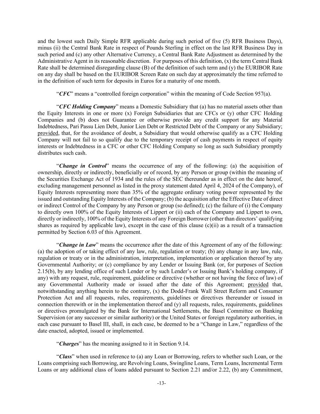 -13- and the lowest such Daily Simple RFR applicable during such period of five (5) RFR Business Days), minus (ii) the Central Bank Rate in respect of Pounds Sterling in effect on the last RFR Business Day in such period and (c) any other Alternative Currency, a Central Bank Rate Adjustment as determined by the Administrative Agent in its reasonable discretion. For purposes of this definition, (x) the term Central Bank Rate shall be determined disregarding clause (B) of the definition of such term and (y) the EURIBOR Rate on any day shall be based on the EURIBOR Screen Rate on such day at approximately the time referred to in the definition of such term for deposits in Euros for a maturity of one month. “CFC” means a “controlled foreign corporation” within the meaning of Code Section 957(a). “CFC Holding Company” means a Domestic Subsidiary that (a) has no material assets other than the Equity Interests in one or more (x) Foreign Subsidiaries that are CFCs or (y) other CFC Holding Companies and (b) does not Guarantee or otherwise provide any credit support for any Material Indebtedness, Pari Passu Lien Debt, Junior Lien Debt or Restricted Debt of the Company or any Subsidiary; provided, that, for the avoidance of doubt, a Subsidiary that would otherwise qualify as a CFC Holding Company will not fail to so qualify due to the temporary receipt of cash payments in respect of equity interests or Indebtedness in a CFC or other CFC Holding Company so long as such Subsidiary promptly distributes such cash. “Change in Control” means the occurrence of any of the following: (a) the acquisition of ownership, directly or indirectly, beneficially or of record, by any Person or group (within the meaning of the Securities Exchange Act of 1934 and the rules of the SEC thereunder as in effect on the date hereof, excluding management personnel as listed in the proxy statement dated April 4, 2024 of the Company), of Equity Interests representing more than 35% of the aggregate ordinary voting power represented by the issued and outstanding Equity Interests of the Company; (b) the acquisition after the Effective Date of direct or indirect Control of the Company by any Person or group (so defined); (c) the failure of (i) the Company to directly own 100% of the Equity Interests of Lippert or (ii) each of the Company and Lippert to own, directly or indirectly, 100% of the Equity Interests of any Foreign Borrower (other than directors’ qualifying shares as required by applicable law), except in the case of this clause (c)(ii) as a result of a transaction permitted by Section 6.03 of this Agreement. “Change in Law” means the occurrence after the date of this Agreement of any of the following: (a) the adoption of or taking effect of any law, rule, regulation or treaty; (b) any change in any law, rule, regulation or treaty or in the administration, interpretation, implementation or application thereof by any Governmental Authority; or (c) compliance by any Lender or Issuing Bank (or, for purposes of Section 2.15(b), by any lending office of such Lender or by such Lender’s or Issuing Bank’s holding company, if any) with any request, rule, requirement, guideline or directive (whether or not having the force of law) of any Governmental Authority made or issued after the date of this Agreement; provided that, notwithstanding anything herein to the contrary, (x) the Dodd-Frank Wall Street Reform and Consumer Protection Act and all requests, rules, requirements, guidelines or directives thereunder or issued in connection therewith or in the implementation thereof and (y) all requests, rules, requirements, guidelines or directives promulgated by the Bank for International Settlements, the Basel Committee on Banking Supervision (or any successor or similar authority) or the United States or foreign regulatory authorities, in each case pursuant to Basel III, shall, in each case, be deemed to be a “Change in Law,” regardless of the date enacted, adopted, issued or implemented. “Charges” has the meaning assigned to it in Section 9.14. “Class” when used in reference to (a) any Loan or Borrowing, refers to whether such Loan, or the Loans comprising such Borrowing, are Revolving Loans, Swingline Loans, Term Loans, Incremental Term Loans or any additional class of loans added pursuant to Section 2.21 and/or 2.22, (b) any Commitment,