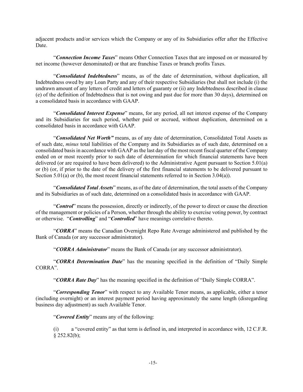 -15- adjacent products and/or services which the Company or any of its Subsidiaries offer after the Effective Date. “Connection Income Taxes” means Other Connection Taxes that are imposed on or measured by net income (however denominated) or that are franchise Taxes or branch profits Taxes. “Consolidated Indebtedness” means, as of the date of determination, without duplication, all Indebtedness owed by any Loan Party and any of their respective Subsidiaries (but shall not include (i) the undrawn amount of any letters of credit and letters of guaranty or (ii) any Indebtedness described in clause (e) of the definition of Indebtedness that is not owing and past due for more than 30 days), determined on a consolidated basis in accordance with GAAP. “Consolidated Interest Expense” means, for any period, all net interest expense of the Company and its Subsidiaries for such period, whether paid or accrued, without duplication, determined on a consolidated basis in accordance with GAAP. “Consolidated Net Worth” means, as of any date of determination, Consolidated Total Assets as of such date, minus total liabilities of the Company and its Subsidiaries as of such date, determined on a consolidated basis in accordance with GAAP as the last day of the most recent fiscal quarter of the Company ended on or most recently prior to such date of determination for which financial statements have been delivered (or are required to have been delivered) to the Administrative Agent pursuant to Section 5.01(a) or (b) (or, if prior to the date of the delivery of the first financial statements to be delivered pursuant to Section 5.01(a) or (b), the most recent financial statements referred to in Section 3.04(a)). “Consolidated Total Assets” means, as of the date of determination, the total assets of the Company and its Subsidiaries as of such date, determined on a consolidated basis in accordance with GAAP. “Control” means the possession, directly or indirectly, of the power to direct or cause the direction of the management or policies of a Person, whether through the ability to exercise voting power, by contract or otherwise. “Controlling” and “Controlled” have meanings correlative thereto. “CORRA” means the Canadian Overnight Repo Rate Average administered and published by the Bank of Canada (or any successor administrator). “CORRA Administrator” means the Bank of Canada (or any successor administrator). “CORRA Determination Date” has the meaning specified in the definition of “Daily Simple CORRA”. “CORRA Rate Day” has the meaning specified in the definition of “Daily Simple CORRA”. “Corresponding Tenor” with respect to any Available Tenor means, as applicable, either a tenor (including overnight) or an interest payment period having approximately the same length (disregarding business day adjustment) as such Available Tenor. “Covered Entity” means any of the following: (i) a “covered entity” as that term is defined in, and interpreted in accordance with, 12 C.F.R. § 252.82(b);