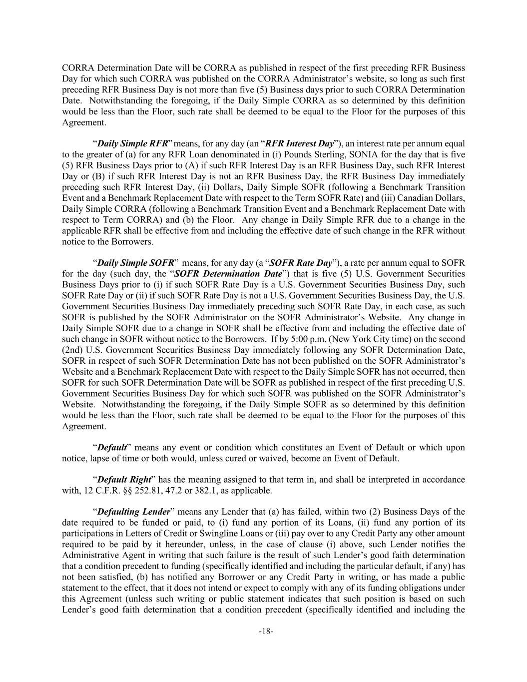-18- CORRA Determination Date will be CORRA as published in respect of the first preceding RFR Business Day for which such CORRA was published on the CORRA Administrator’s website, so long as such first preceding RFR Business Day is not more than five (5) Business days prior to such CORRA Determination Date. Notwithstanding the foregoing, if the Daily Simple CORRA as so determined by this definition would be less than the Floor, such rate shall be deemed to be equal to the Floor for the purposes of this Agreement. “Daily Simple RFR” means, for any day (an “RFR Interest Day”), an interest rate per annum equal to the greater of (a) for any RFR Loan denominated in (i) Pounds Sterling, SONIA for the day that is five (5) RFR Business Days prior to (A) if such RFR Interest Day is an RFR Business Day, such RFR Interest Day or (B) if such RFR Interest Day is not an RFR Business Day, the RFR Business Day immediately preceding such RFR Interest Day, (ii) Dollars, Daily Simple SOFR (following a Benchmark Transition Event and a Benchmark Replacement Date with respect to the Term SOFR Rate) and (iii) Canadian Dollars, Daily Simple CORRA (following a Benchmark Transition Event and a Benchmark Replacement Date with respect to Term CORRA) and (b) the Floor. Any change in Daily Simple RFR due to a change in the applicable RFR shall be effective from and including the effective date of such change in the RFR without notice to the Borrowers. “Daily Simple SOFR” means, for any day (a “SOFR Rate Day”), a rate per annum equal to SOFR for the day (such day, the “SOFR Determination Date”) that is five (5) U.S. Government Securities Business Days prior to (i) if such SOFR Rate Day is a U.S. Government Securities Business Day, such SOFR Rate Day or (ii) if such SOFR Rate Day is not a U.S. Government Securities Business Day, the U.S. Government Securities Business Day immediately preceding such SOFR Rate Day, in each case, as such SOFR is published by the SOFR Administrator on the SOFR Administrator’s Website. Any change in Daily Simple SOFR due to a change in SOFR shall be effective from and including the effective date of such change in SOFR without notice to the Borrowers. If by 5:00 p.m. (New York City time) on the second (2nd) U.S. Government Securities Business Day immediately following any SOFR Determination Date, SOFR in respect of such SOFR Determination Date has not been published on the SOFR Administrator’s Website and a Benchmark Replacement Date with respect to the Daily Simple SOFR has not occurred, then SOFR for such SOFR Determination Date will be SOFR as published in respect of the first preceding U.S. Government Securities Business Day for which such SOFR was published on the SOFR Administrator’s Website. Notwithstanding the foregoing, if the Daily Simple SOFR as so determined by this definition would be less than the Floor, such rate shall be deemed to be equal to the Floor for the purposes of this Agreement. “Default” means any event or condition which constitutes an Event of Default or which upon notice, lapse of time or both would, unless cured or waived, become an Event of Default. “Default Right” has the meaning assigned to that term in, and shall be interpreted in accordance with, 12 C.F.R. §§ 252.81, 47.2 or 382.1, as applicable. “Defaulting Lender” means any Lender that (a) has failed, within two (2) Business Days of the date required to be funded or paid, to (i) fund any portion of its Loans, (ii) fund any portion of its participations in Letters of Credit or Swingline Loans or (iii) pay over to any Credit Party any other amount required to be paid by it hereunder, unless, in the case of clause (i) above, such Lender notifies the Administrative Agent in writing that such failure is the result of such Lender’s good faith determination that a condition precedent to funding (specifically identified and including the particular default, if any) has not been satisfied, (b) has notified any Borrower or any Credit Party in writing, or has made a public statement to the effect, that it does not intend or expect to comply with any of its funding obligations under this Agreement (unless such writing or public statement indicates that such position is based on such Lender’s good faith determination that a condition precedent (specifically identified and including the
