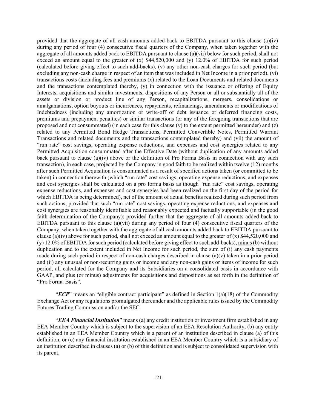 -21- provided that the aggregate of all cash amounts added-back to EBITDA pursuant to this clause (a)(iv) during any period of four (4) consecutive fiscal quarters of the Company, when taken together with the aggregate of all amounts added back to EBITDA pursuant to clause (a)(vii) below for such period, shall not exceed an amount equal to the greater of (x) $44,520,000 and (y) 12.0% of EBITDA for such period (calculated before giving effect to such add-backs), (v) any other non-cash charges for such period (but excluding any non-cash charge in respect of an item that was included in Net Income in a prior period), (vi) transactions costs (including fees and premiums (x) related to the Loan Documents and related documents and the transactions contemplated thereby, (y) in connection with the issuance or offering of Equity Interests, acquisitions and similar investments, dispositions of any Person or all or substantially all of the assets or division or product line of any Person, recapitalizations, mergers, consolidations or amalgamations, option buyouts or incurrences, repayments, refinancings, amendments or modifications of Indebtedness (including any amortization or write-off of debt issuance or deferred financing costs, premiums and prepayment penalties) or similar transactions (or any of the foregoing transactions that are proposed and not consummated) (in each case for this clause (y) to the extent permitted hereunder) and (z) related to any Permitted Bond Hedge Transactions, Permitted Convertible Notes, Permitted Warrant Transactions and related documents and the transactions contemplated thereby) and (vii) the amount of “run rate” cost savings, operating expense reductions, and expenses and cost synergies related to any Permitted Acquisition consummated after the Effective Date (without duplication of any amounts added back pursuant to clause (a)(iv) above or the definition of Pro Forma Basis in connection with any such transaction), in each case, projected by the Company in good faith to be realized within twelve (12) months after such Permitted Acquisition is consummated as a result of specified actions taken (or committed to be taken) in connection therewith (which “run rate” cost savings, operating expense reductions, and expenses and cost synergies shall be calculated on a pro forma basis as though “run rate” cost savings, operating expense reductions, and expenses and cost synergies had been realized on the first day of the period for which EBITDA is being determined), net of the amount of actual benefits realized during such period from such actions; provided that such “run rate” cost savings, operating expense reductions, and expenses and cost synergies are reasonably identifiable and reasonably expected and factually supportable (in the good faith determination of the Company); provided further that the aggregate of all amounts added-back to EBITDA pursuant to this clause (a)(vii) during any period of four (4) consecutive fiscal quarters of the Company, when taken together with the aggregate of all cash amounts added back to EBITDA pursuant to clause (a)(iv) above for such period, shall not exceed an amount equal to the greater of (x) $44,520,000 and (y) 12.0% of EBITDA for such period (calculated before giving effect to such add-backs), minus (b) without duplication and to the extent included in Net Income for such period, the sum of (i) any cash payments made during such period in respect of non-cash charges described in clause (a)(v) taken in a prior period and (ii) any unusual or non-recurring gains or income and any non-cash gains or items of income for such period, all calculated for the Company and its Subsidiaries on a consolidated basis in accordance with GAAP, and plus (or minus) adjustments for acquisitions and dispositions as set forth in the definition of “Pro Forma Basis”. “ECP” means an “eligible contract participant” as defined in Section 1(a)(18) of the Commodity Exchange Act or any regulations promulgated thereunder and the applicable rules issued by the Commodity Futures Trading Commission and/or the SEC. “EEA Financial Institution” means (a) any credit institution or investment firm established in any EEA Member Country which is subject to the supervision of an EEA Resolution Authority, (b) any entity established in an EEA Member Country which is a parent of an institution described in clause (a) of this definition, or (c) any financial institution established in an EEA Member Country which is a subsidiary of an institution described in clauses (a) or (b) of this definition and is subject to consolidated supervision with its parent.