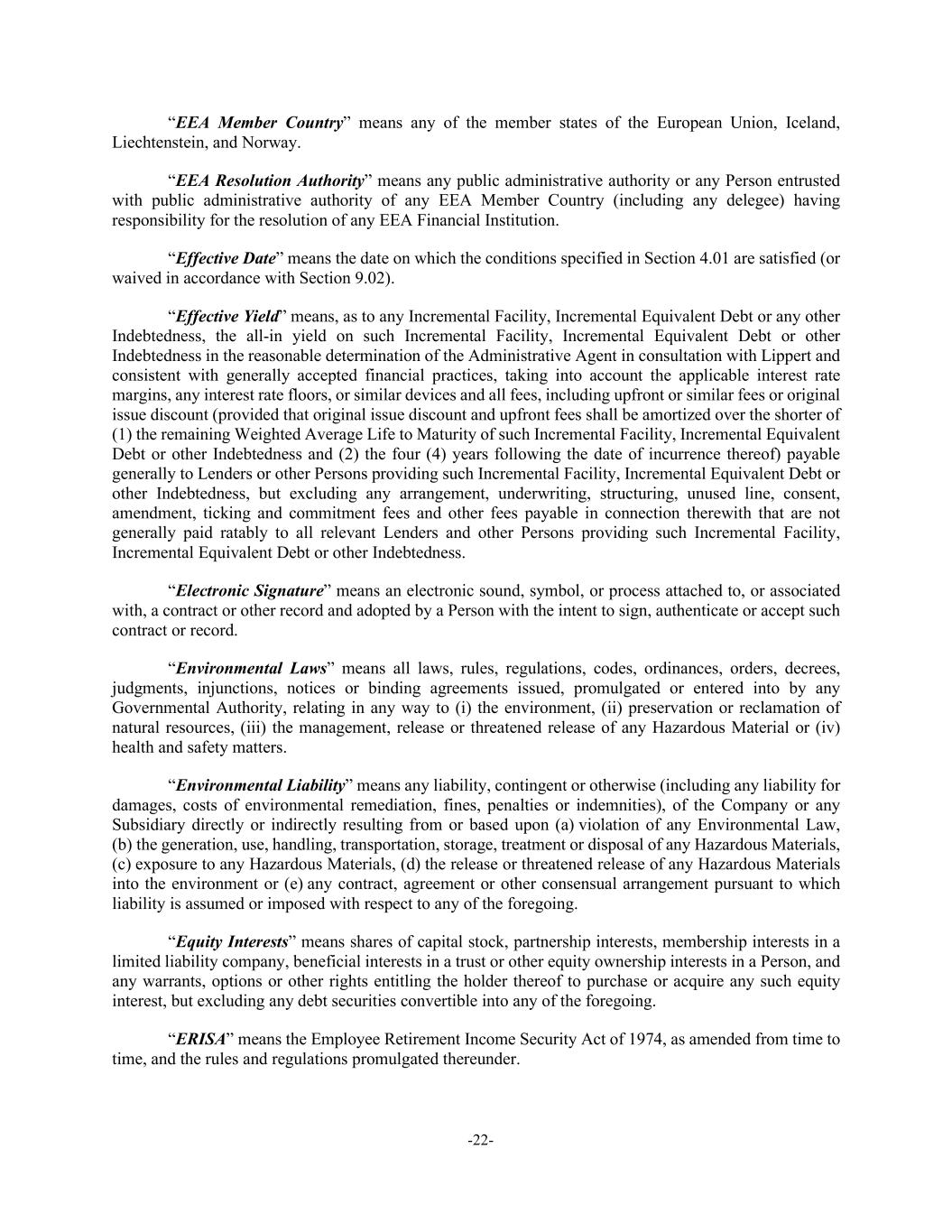 -22- “EEA Member Country” means any of the member states of the European Union, Iceland, Liechtenstein, and Norway. “EEA Resolution Authority” means any public administrative authority or any Person entrusted with public administrative authority of any EEA Member Country (including any delegee) having responsibility for the resolution of any EEA Financial Institution. “Effective Date” means the date on which the conditions specified in Section 4.01 are satisfied (or waived in accordance with Section 9.02). “Effective Yield” means, as to any Incremental Facility, Incremental Equivalent Debt or any other Indebtedness, the all-in yield on such Incremental Facility, Incremental Equivalent Debt or other Indebtedness in the reasonable determination of the Administrative Agent in consultation with Lippert and consistent with generally accepted financial practices, taking into account the applicable interest rate margins, any interest rate floors, or similar devices and all fees, including upfront or similar fees or original issue discount (provided that original issue discount and upfront fees shall be amortized over the shorter of (1) the remaining Weighted Average Life to Maturity of such Incremental Facility, Incremental Equivalent Debt or other Indebtedness and (2) the four (4) years following the date of incurrence thereof) payable generally to Lenders or other Persons providing such Incremental Facility, Incremental Equivalent Debt or other Indebtedness, but excluding any arrangement, underwriting, structuring, unused line, consent, amendment, ticking and commitment fees and other fees payable in connection therewith that are not generally paid ratably to all relevant Lenders and other Persons providing such Incremental Facility, Incremental Equivalent Debt or other Indebtedness. “Electronic Signature” means an electronic sound, symbol, or process attached to, or associated with, a contract or other record and adopted by a Person with the intent to sign, authenticate or accept such contract or record. “Environmental Laws” means all laws, rules, regulations, codes, ordinances, orders, decrees, judgments, injunctions, notices or binding agreements issued, promulgated or entered into by any Governmental Authority, relating in any way to (i) the environment, (ii) preservation or reclamation of natural resources, (iii) the management, release or threatened release of any Hazardous Material or (iv) health and safety matters. “Environmental Liability” means any liability, contingent or otherwise (including any liability for damages, costs of environmental remediation, fines, penalties or indemnities), of the Company or any Subsidiary directly or indirectly resulting from or based upon (a) violation of any Environmental Law, (b) the generation, use, handling, transportation, storage, treatment or disposal of any Hazardous Materials, (c) exposure to any Hazardous Materials, (d) the release or threatened release of any Hazardous Materials into the environment or (e) any contract, agreement or other consensual arrangement pursuant to which liability is assumed or imposed with respect to any of the foregoing. “Equity Interests” means shares of capital stock, partnership interests, membership interests in a limited liability company, beneficial interests in a trust or other equity ownership interests in a Person, and any warrants, options or other rights entitling the holder thereof to purchase or acquire any such equity interest, but excluding any debt securities convertible into any of the foregoing. “ERISA” means the Employee Retirement Income Security Act of 1974, as amended from time to time, and the rules and regulations promulgated thereunder.