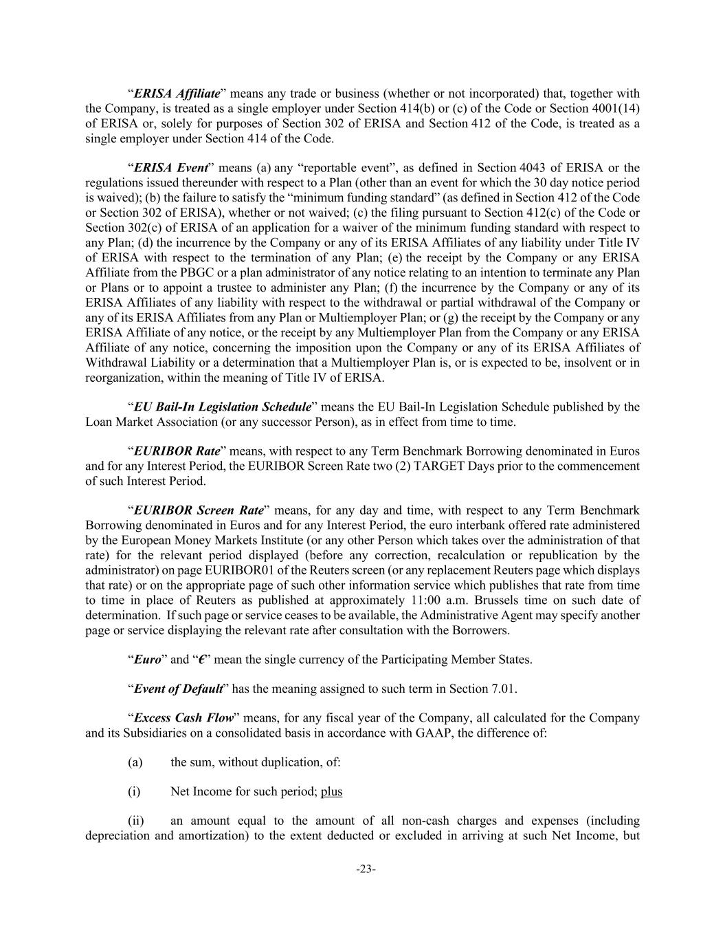 -23- “ERISA Affiliate” means any trade or business (whether or not incorporated) that, together with the Company, is treated as a single employer under Section 414(b) or (c) of the Code or Section 4001(14) of ERISA or, solely for purposes of Section 302 of ERISA and Section 412 of the Code, is treated as a single employer under Section 414 of the Code. “ERISA Event” means (a) any “reportable event”, as defined in Section 4043 of ERISA or the regulations issued thereunder with respect to a Plan (other than an event for which the 30 day notice period is waived); (b) the failure to satisfy the “minimum funding standard” (as defined in Section 412 of the Code or Section 302 of ERISA), whether or not waived; (c) the filing pursuant to Section 412(c) of the Code or Section 302(c) of ERISA of an application for a waiver of the minimum funding standard with respect to any Plan; (d) the incurrence by the Company or any of its ERISA Affiliates of any liability under Title IV of ERISA with respect to the termination of any Plan; (e) the receipt by the Company or any ERISA Affiliate from the PBGC or a plan administrator of any notice relating to an intention to terminate any Plan or Plans or to appoint a trustee to administer any Plan; (f) the incurrence by the Company or any of its ERISA Affiliates of any liability with respect to the withdrawal or partial withdrawal of the Company or any of its ERISA Affiliates from any Plan or Multiemployer Plan; or (g) the receipt by the Company or any ERISA Affiliate of any notice, or the receipt by any Multiemployer Plan from the Company or any ERISA Affiliate of any notice, concerning the imposition upon the Company or any of its ERISA Affiliates of Withdrawal Liability or a determination that a Multiemployer Plan is, or is expected to be, insolvent or in reorganization, within the meaning of Title IV of ERISA. “EU Bail-In Legislation Schedule” means the EU Bail-In Legislation Schedule published by the Loan Market Association (or any successor Person), as in effect from time to time. “EURIBOR Rate” means, with respect to any Term Benchmark Borrowing denominated in Euros and for any Interest Period, the EURIBOR Screen Rate two (2) TARGET Days prior to the commencement of such Interest Period. “EURIBOR Screen Rate” means, for any day and time, with respect to any Term Benchmark Borrowing denominated in Euros and for any Interest Period, the euro interbank offered rate administered by the European Money Markets Institute (or any other Person which takes over the administration of that rate) for the relevant period displayed (before any correction, recalculation or republication by the administrator) on page EURIBOR01 of the Reuters screen (or any replacement Reuters page which displays that rate) or on the appropriate page of such other information service which publishes that rate from time to time in place of Reuters as published at approximately 11:00 a.m. Brussels time on such date of determination. If such page or service ceases to be available, the Administrative Agent may specify another page or service displaying the relevant rate after consultation with the Borrowers. “Euro” and “€” mean the single currency of the Participating Member States. “Event of Default” has the meaning assigned to such term in Section 7.01. “Excess Cash Flow” means, for any fiscal year of the Company, all calculated for the Company and its Subsidiaries on a consolidated basis in accordance with GAAP, the difference of: (a) the sum, without duplication, of: (i) Net Income for such period; plus (ii) an amount equal to the amount of all non-cash charges and expenses (including depreciation and amortization) to the extent deducted or excluded in arriving at such Net Income, but