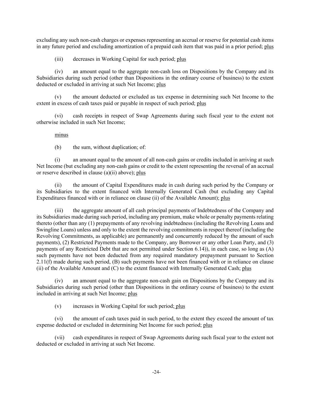 -24- excluding any such non-cash charges or expenses representing an accrual or reserve for potential cash items in any future period and excluding amortization of a prepaid cash item that was paid in a prior period; plus (iii) decreases in Working Capital for such period; plus (iv) an amount equal to the aggregate non-cash loss on Dispositions by the Company and its Subsidiaries during such period (other than Dispositions in the ordinary course of business) to the extent deducted or excluded in arriving at such Net Income; plus (v) the amount deducted or excluded as tax expense in determining such Net Income to the extent in excess of cash taxes paid or payable in respect of such period; plus (vi) cash receipts in respect of Swap Agreements during such fiscal year to the extent not otherwise included in such Net Income; minus (b) the sum, without duplication; of: (i) an amount equal to the amount of all non-cash gains or credits included in arriving at such Net Income (but excluding any non-cash gains or credit to the extent representing the reversal of an accrual or reserve described in clause (a)(ii) above); plus (ii) the amount of Capital Expenditures made in cash during such period by the Company or its Subsidiaries to the extent financed with Internally Generated Cash (but excluding any Capital Expenditures financed with or in reliance on clause (ii) of the Available Amount); plus (iii) the aggregate amount of all cash principal payments of Indebtedness of the Company and its Subsidiaries made during such period, including any premium, make whole or penalty payments relating thereto (other than any (1) prepayments of any revolving indebtedness (including the Revolving Loans and Swingline Loans) unless and only to the extent the revolving commitments in respect thereof (including the Revolving Commitments, as applicable) are permanently and concurrently reduced by the amount of such payments), (2) Restricted Payments made to the Company, any Borrower or any other Loan Party, and (3) payments of any Restricted Debt that are not permitted under Section 6.14)), in each case, so long as (A) such payments have not been deducted from any required mandatory prepayment pursuant to Section 2.11(f) made during such period, (B) such payments have not been financed with or in reliance on clause (ii) of the Available Amount and (C) to the extent financed with Internally Generated Cash; plus (iv) an amount equal to the aggregate non-cash gain on Dispositions by the Company and its Subsidiaries during such period (other than Dispositions in the ordinary course of business) to the extent included in arriving at such Net Income; plus (v) increases in Working Capital for such period; plus (vi) the amount of cash taxes paid in such period, to the extent they exceed the amount of tax expense deducted or excluded in determining Net Income for such period; plus (vii) cash expenditures in respect of Swap Agreements during such fiscal year to the extent not deducted or excluded in arriving at such Net Income.