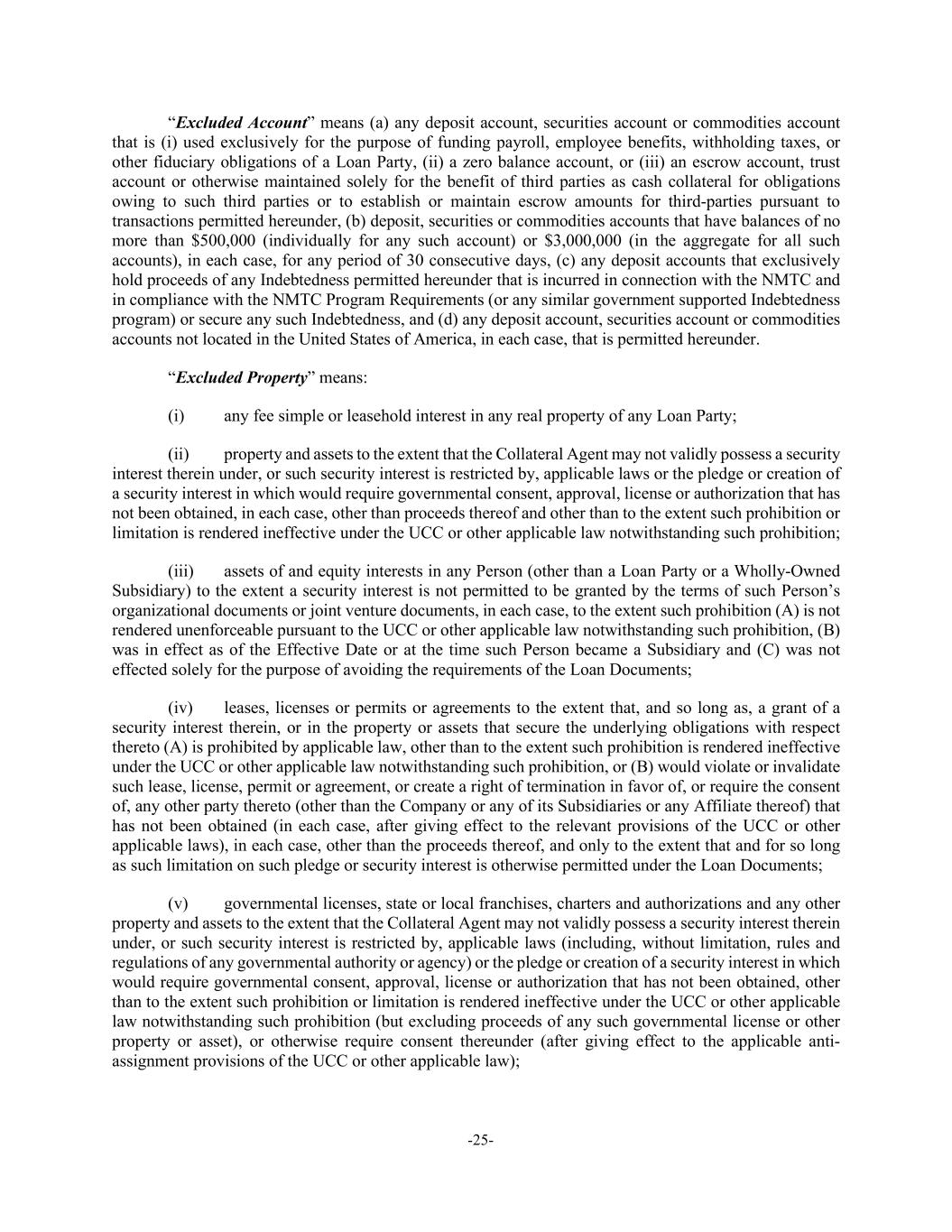 -25- “Excluded Account” means (a) any deposit account, securities account or commodities account that is (i) used exclusively for the purpose of funding payroll, employee benefits, withholding taxes, or other fiduciary obligations of a Loan Party, (ii) a zero balance account, or (iii) an escrow account, trust account or otherwise maintained solely for the benefit of third parties as cash collateral for obligations owing to such third parties or to establish or maintain escrow amounts for third-parties pursuant to transactions permitted hereunder, (b) deposit, securities or commodities accounts that have balances of no more than $500,000 (individually for any such account) or $3,000,000 (in the aggregate for all such accounts), in each case, for any period of 30 consecutive days, (c) any deposit accounts that exclusively hold proceeds of any Indebtedness permitted hereunder that is incurred in connection with the NMTC and in compliance with the NMTC Program Requirements (or any similar government supported Indebtedness program) or secure any such Indebtedness, and (d) any deposit account, securities account or commodities accounts not located in the United States of America, in each case, that is permitted hereunder. “Excluded Property” means: (i) any fee simple or leasehold interest in any real property of any Loan Party; (ii) property and assets to the extent that the Collateral Agent may not validly possess a security interest therein under, or such security interest is restricted by, applicable laws or the pledge or creation of a security interest in which would require governmental consent, approval, license or authorization that has not been obtained, in each case, other than proceeds thereof and other than to the extent such prohibition or limitation is rendered ineffective under the UCC or other applicable law notwithstanding such prohibition; (iii) assets of and equity interests in any Person (other than a Loan Party or a Wholly-Owned Subsidiary) to the extent a security interest is not permitted to be granted by the terms of such Person’s organizational documents or joint venture documents, in each case, to the extent such prohibition (A) is not rendered unenforceable pursuant to the UCC or other applicable law notwithstanding such prohibition, (B) was in effect as of the Effective Date or at the time such Person became a Subsidiary and (C) was not effected solely for the purpose of avoiding the requirements of the Loan Documents; (iv) leases, licenses or permits or agreements to the extent that, and so long as, a grant of a security interest therein, or in the property or assets that secure the underlying obligations with respect thereto (A) is prohibited by applicable law, other than to the extent such prohibition is rendered ineffective under the UCC or other applicable law notwithstanding such prohibition, or (B) would violate or invalidate such lease, license, permit or agreement, or create a right of termination in favor of, or require the consent of, any other party thereto (other than the Company or any of its Subsidiaries or any Affiliate thereof) that has not been obtained (in each case, after giving effect to the relevant provisions of the UCC or other applicable laws), in each case, other than the proceeds thereof, and only to the extent that and for so long as such limitation on such pledge or security interest is otherwise permitted under the Loan Documents; (v) governmental licenses, state or local franchises, charters and authorizations and any other property and assets to the extent that the Collateral Agent may not validly possess a security interest therein under, or such security interest is restricted by, applicable laws (including, without limitation, rules and regulations of any governmental authority or agency) or the pledge or creation of a security interest in which would require governmental consent, approval, license or authorization that has not been obtained, other than to the extent such prohibition or limitation is rendered ineffective under the UCC or other applicable law notwithstanding such prohibition (but excluding proceeds of any such governmental license or other property or asset), or otherwise require consent thereunder (after giving effect to the applicable anti- assignment provisions of the UCC or other applicable law);