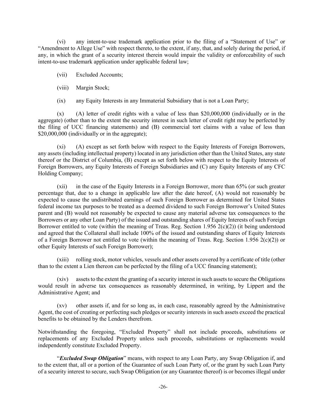 -26- (vi) any intent-to-use trademark application prior to the filing of a “Statement of Use” or “Amendment to Allege Use” with respect thereto, to the extent, if any, that, and solely during the period, if any, in which the grant of a security interest therein would impair the validity or enforceability of such intent-to-use trademark application under applicable federal law; (vii) Excluded Accounts; (viii) Margin Stock; (ix) any Equity Interests in any Immaterial Subsidiary that is not a Loan Party; (x) (A) letter of credit rights with a value of less than $20,000,000 (individually or in the aggregate) (other than to the extent the security interest in such letter of credit right may be perfected by the filing of UCC financing statements) and (B) commercial tort claims with a value of less than $20,000,000 (individually or in the aggregate); (xi) (A) except as set forth below with respect to the Equity Interests of Foreign Borrowers, any assets (including intellectual property) located in any jurisdiction other than the United States, any state thereof or the District of Columbia, (B) except as set forth below with respect to the Equity Interests of Foreign Borrowers, any Equity Interests of Foreign Subsidiaries and (C) any Equity Interests of any CFC Holding Company; (xii) in the case of the Equity Interests in a Foreign Borrower, more than 65% (or such greater percentage that, due to a change in applicable law after the date hereof, (A) would not reasonably be expected to cause the undistributed earnings of such Foreign Borrower as determined for United States federal income tax purposes to be treated as a deemed dividend to such Foreign Borrower’s United States parent and (B) would not reasonably be expected to cause any material adverse tax consequences to the Borrowers or any other Loan Party) of the issued and outstanding shares of Equity Interests of such Foreign Borrower entitled to vote (within the meaning of Treas. Reg. Section 1.956 2(c)(2)) (it being understood and agreed that the Collateral shall include 100% of the issued and outstanding shares of Equity Interests of a Foreign Borrower not entitled to vote (within the meaning of Treas. Reg. Section 1.956 2(c)(2)) or other Equity Interests of such Foreign Borrower); (xiii) rolling stock, motor vehicles, vessels and other assets covered by a certificate of title (other than to the extent a Lien thereon can be perfected by the filing of a UCC financing statement); (xiv) assets to the extent the granting of a security interest in such assets to secure the Obligations would result in adverse tax consequences as reasonably determined, in writing, by Lippert and the Administrative Agent; and (xv) other assets if, and for so long as, in each case, reasonably agreed by the Administrative Agent, the cost of creating or perfecting such pledges or security interests in such assets exceed the practical benefits to be obtained by the Lenders therefrom. Notwithstanding the foregoing, “Excluded Property” shall not include proceeds, substitutions or replacements of any Excluded Property unless such proceeds, substitutions or replacements would independently constitute Excluded Property. “Excluded Swap Obligation” means, with respect to any Loan Party, any Swap Obligation if, and to the extent that, all or a portion of the Guarantee of such Loan Party of, or the grant by such Loan Party of a security interest to secure, such Swap Obligation (or any Guarantee thereof) is or becomes illegal under