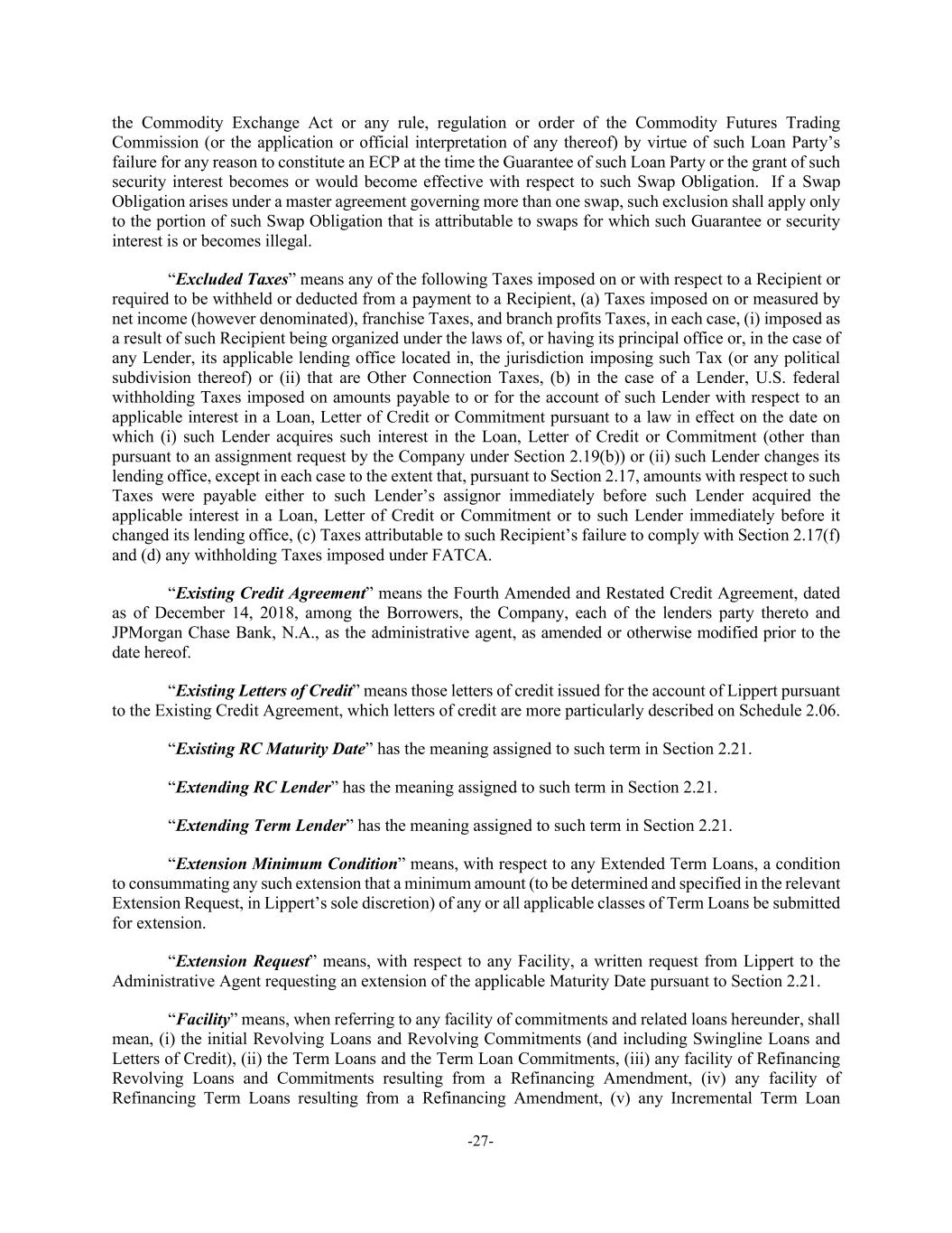 -27- the Commodity Exchange Act or any rule, regulation or order of the Commodity Futures Trading Commission (or the application or official interpretation of any thereof) by virtue of such Loan Party’s failure for any reason to constitute an ECP at the time the Guarantee of such Loan Party or the grant of such security interest becomes or would become effective with respect to such Swap Obligation. If a Swap Obligation arises under a master agreement governing more than one swap, such exclusion shall apply only to the portion of such Swap Obligation that is attributable to swaps for which such Guarantee or security interest is or becomes illegal. “Excluded Taxes” means any of the following Taxes imposed on or with respect to a Recipient or required to be withheld or deducted from a payment to a Recipient, (a) Taxes imposed on or measured by net income (however denominated), franchise Taxes, and branch profits Taxes, in each case, (i) imposed as a result of such Recipient being organized under the laws of, or having its principal office or, in the case of any Lender, its applicable lending office located in, the jurisdiction imposing such Tax (or any political subdivision thereof) or (ii) that are Other Connection Taxes, (b) in the case of a Lender, U.S. federal withholding Taxes imposed on amounts payable to or for the account of such Lender with respect to an applicable interest in a Loan, Letter of Credit or Commitment pursuant to a law in effect on the date on which (i) such Lender acquires such interest in the Loan, Letter of Credit or Commitment (other than pursuant to an assignment request by the Company under Section 2.19(b)) or (ii) such Lender changes its lending office, except in each case to the extent that, pursuant to Section 2.17, amounts with respect to such Taxes were payable either to such Lender’s assignor immediately before such Lender acquired the applicable interest in a Loan, Letter of Credit or Commitment or to such Lender immediately before it changed its lending office, (c) Taxes attributable to such Recipient’s failure to comply with Section 2.17(f) and (d) any withholding Taxes imposed under FATCA. “Existing Credit Agreement” means the Fourth Amended and Restated Credit Agreement, dated as of December 14, 2018, among the Borrowers, the Company, each of the lenders party thereto and JPMorgan Chase Bank, N.A., as the administrative agent, as amended or otherwise modified prior to the date hereof. “Existing Letters of Credit” means those letters of credit issued for the account of Lippert pursuant to the Existing Credit Agreement, which letters of credit are more particularly described on Schedule 2.06. “Existing RC Maturity Date” has the meaning assigned to such term in Section 2.21. “Extending RC Lender” has the meaning assigned to such term in Section 2.21. “Extending Term Lender” has the meaning assigned to such term in Section 2.21. “Extension Minimum Condition” means, with respect to any Extended Term Loans, a condition to consummating any such extension that a minimum amount (to be determined and specified in the relevant Extension Request, in Lippert’s sole discretion) of any or all applicable classes of Term Loans be submitted for extension. “Extension Request” means, with respect to any Facility, a written request from Lippert to the Administrative Agent requesting an extension of the applicable Maturity Date pursuant to Section 2.21. “Facility” means, when referring to any facility of commitments and related loans hereunder, shall mean, (i) the initial Revolving Loans and Revolving Commitments (and including Swingline Loans and Letters of Credit), (ii) the Term Loans and the Term Loan Commitments, (iii) any facility of Refinancing Revolving Loans and Commitments resulting from a Refinancing Amendment, (iv) any facility of Refinancing Term Loans resulting from a Refinancing Amendment, (v) any Incremental Term Loan