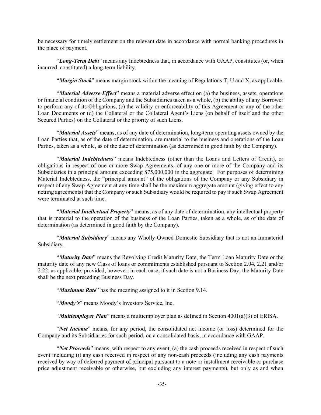 -35- be necessary for timely settlement on the relevant date in accordance with normal banking procedures in the place of payment. “Long-Term Debt” means any Indebtedness that, in accordance with GAAP, constitutes (or, when incurred, constituted) a long-term liability. “Margin Stock” means margin stock within the meaning of Regulations T, U and X, as applicable. “Material Adverse Effect” means a material adverse effect on (a) the business, assets, operations or financial condition of the Company and the Subsidiaries taken as a whole, (b) the ability of any Borrower to perform any of its Obligations, (c) the validity or enforceability of this Agreement or any of the other Loan Documents or (d) the Collateral or the Collateral Agent’s Liens (on behalf of itself and the other Secured Parties) on the Collateral or the priority of such Liens. “Material Assets” means, as of any date of determination, long-term operating assets owned by the Loan Parties that, as of the date of determination, are material to the business and operations of the Loan Parties, taken as a whole, as of the date of determination (as determined in good faith by the Company). “Material Indebtedness” means Indebtedness (other than the Loans and Letters of Credit), or obligations in respect of one or more Swap Agreements, of any one or more of the Company and its Subsidiaries in a principal amount exceeding $75,000,000 in the aggregate. For purposes of determining Material Indebtedness, the “principal amount” of the obligations of the Company or any Subsidiary in respect of any Swap Agreement at any time shall be the maximum aggregate amount (giving effect to any netting agreements) that the Company or such Subsidiary would be required to pay if such Swap Agreement were terminated at such time. “Material Intellectual Property” means, as of any date of determination, any intellectual property that is material to the operation of the business of the Loan Parties, taken as a whole, as of the date of determination (as determined in good faith by the Company). “Material Subsidiary” means any Wholly-Owned Domestic Subsidiary that is not an Immaterial Subsidiary. “Maturity Date” means the Revolving Credit Maturity Date, the Term Loan Maturity Date or the maturity date of any new Class of loans or commitments established pursuant to Section 2.04, 2.21 and/or 2.22, as applicable; provided, however, in each case, if such date is not a Business Day, the Maturity Date shall be the next preceding Business Day. “Maximum Rate” has the meaning assigned to it in Section 9.14. “Moody’s” means Moody’s Investors Service, Inc. “Multiemployer Plan” means a multiemployer plan as defined in Section 4001(a)(3) of ERISA. “Net Income” means, for any period, the consolidated net income (or loss) determined for the Company and its Subsidiaries for such period, on a consolidated basis, in accordance with GAAP. “Net Proceeds” means, with respect to any event, (a) the cash proceeds received in respect of such event including (i) any cash received in respect of any non-cash proceeds (including any cash payments received by way of deferred payment of principal pursuant to a note or installment receivable or purchase price adjustment receivable or otherwise, but excluding any interest payments), but only as and when