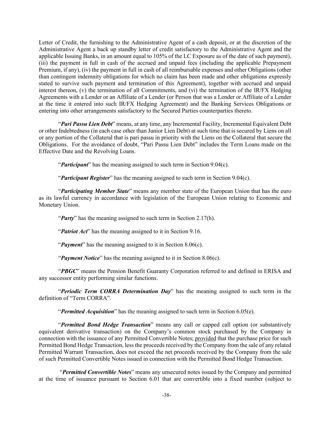-38- Letter of Credit, the furnishing to the Administrative Agent of a cash deposit, or at the discretion of the Administrative Agent a back up standby letter of credit satisfactory to the Administrative Agent and the applicable Issuing Banks, in an amount equal to 105% of the LC Exposure as of the date of such payment), (iii) the payment in full in cash of the accrued and unpaid fees (including the applicable Prepayment Premium, if any), (iv) the payment in full in cash of all reimbursable expenses and other Obligations (other than contingent indemnity obligations for which no claim has been made and other obligations expressly stated to survive such payment and termination of this Agreement), together with accrued and unpaid interest thereon, (v) the termination of all Commitments, and (vi) the termination of the IR/FX Hedging Agreements with a Lender or an Affiliate of a Lender (or Person that was a Lender or Affiliate of a Lender at the time it entered into such IR/FX Hedging Agreement) and the Banking Services Obligations or entering into other arrangements satisfactory to the Secured Parties counterparties thereto. “Pari Passu Lien Debt” means, at any time, any Incremental Facility, Incremental Equivalent Debt or other Indebtedness (in each case other than Junior Lien Debt) at such time that is secured by Liens on all or any portion of the Collateral that is pari passu in priority with the Liens on the Collateral that secure the Obligations. For the avoidance of doubt, “Pari Passu Lien Debt” includes the Term Loans made on the Effective Date and the Revolving Loans. “Participant” has the meaning assigned to such term in Section 9.04(c). “Participant Register” has the meaning assigned to such term in Section 9.04(c). “Participating Member State” means any member state of the European Union that has the euro as its lawful currency in accordance with legislation of the European Union relating to Economic and Monetary Union. “Party” has the meaning assigned to such term in Section 2.17(h). “Patriot Act” has the meaning assigned to it in Section 9.16. “Payment” has the meaning assigned to it in Section 8.06(c). “Payment Notice” has the meaning assigned to it in Section 8.06(c). “PBGC” means the Pension Benefit Guaranty Corporation referred to and defined in ERISA and any successor entity performing similar functions. “Periodic Term CORRA Determination Day” has the meaning assigned to such term in the definition of “Term CORRA”. “Permitted Acquisition” has the meaning assigned to such term in Section 6.05(e). “Permitted Bond Hedge Transaction” means any call or capped call option (or substantively equivalent derivative transaction) on the Company’s common stock purchased by the Company in connection with the issuance of any Permitted Convertible Notes; provided that the purchase price for such Permitted Bond Hedge Transaction, less the proceeds received by the Company from the sale of any related Permitted Warrant Transaction, does not exceed the net proceeds received by the Company from the sale of such Permitted Convertible Notes issued in connection with the Permitted Bond Hedge Transaction. “Permitted Convertible Notes” means any unsecured notes issued by the Company and permitted at the time of issuance pursuant to Section 6.01 that are convertible into a fixed number (subject to