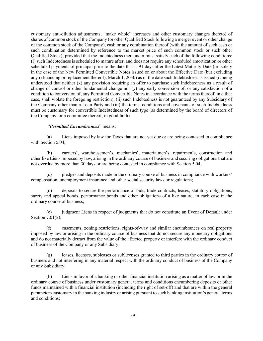 -39- customary anti-dilution adjustments, “make whole” increases and other customary changes thereto) of shares of common stock of the Company (or other Qualified Stock following a merger event or other change of the common stock of the Company), cash or any combination thereof (with the amount of such cash or such combination determined by reference to the market price of such common stock or such other Qualified Stock); provided that the Indebtedness thereunder must satisfy each of the following conditions: (i) such Indebtedness is scheduled to mature after, and does not require any scheduled amortization or other scheduled payments of principal prior to the date that is 91 days after the Latest Maturity Date (or, solely in the case of the New Permitted Convertible Notes issued on or about the Effective Date (but excluding any refinancing or replacement thereof), March 1, 2030) as of the date such Indebtedness is issued (it being understood that neither (x) any provision requiring an offer to purchase such Indebtedness as a result of change of control or other fundamental change nor (y) any early conversion of, or any satisfaction of a condition to conversion of, any Permitted Convertible Notes in accordance with the terms thereof, in either case, shall violate the foregoing restriction), (ii) such Indebtedness is not guaranteed by any Subsidiary of the Company other than a Loan Party and (iii) the terms, conditions and covenants of such Indebtedness must be customary for convertible Indebtedness of such type (as determined by the board of directors of the Company, or a committee thereof, in good faith). “Permitted Encumbrances” means: (a) Liens imposed by law for Taxes that are not yet due or are being contested in compliance with Section 5.04; (b) carriers’, warehousemen’s, mechanics’, materialmen’s, repairmen’s, construction and other like Liens imposed by law, arising in the ordinary course of business and securing obligations that are not overdue by more than 30 days or are being contested in compliance with Section 5.04; (c) pledges and deposits made in the ordinary course of business in compliance with workers’ compensation, unemployment insurance and other social security laws or regulations; (d) deposits to secure the performance of bids, trade contracts, leases, statutory obligations, surety and appeal bonds, performance bonds and other obligations of a like nature, in each case in the ordinary course of business; (e) judgment Liens in respect of judgments that do not constitute an Event of Default under Section 7.01(k); (f) easements, zoning restrictions, rights-of-way and similar encumbrances on real property imposed by law or arising in the ordinary course of business that do not secure any monetary obligations and do not materially detract from the value of the affected property or interfere with the ordinary conduct of business of the Company or any Subsidiary; (g) leases, licenses, subleases or sublicenses granted to third parties in the ordinary course of business and not interfering in any material respect with the ordinary conduct of business of the Company or any Subsidiary; (h) Liens in favor of a banking or other financial institution arising as a matter of law or in the ordinary course of business under customary general terms and conditions encumbering deposits or other funds maintained with a financial institution (including the right of set-off) and that are within the general parameters customary in the banking industry or arising pursuant to such banking institution’s general terms and conditions;