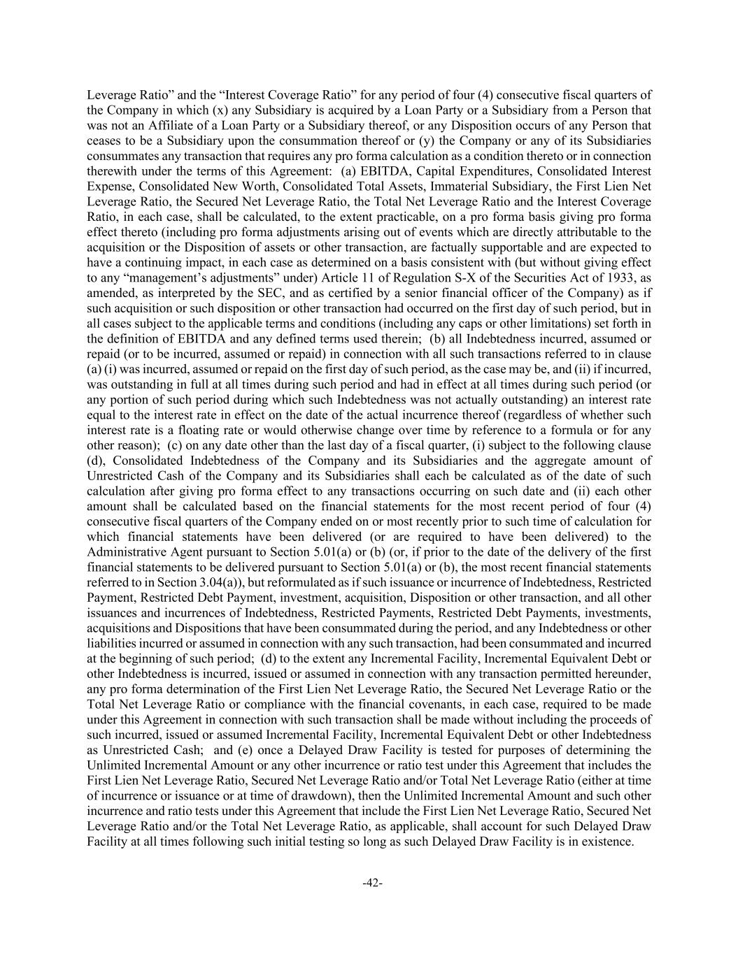 -42- Leverage Ratio” and the “Interest Coverage Ratio” for any period of four (4) consecutive fiscal quarters of the Company in which (x) any Subsidiary is acquired by a Loan Party or a Subsidiary from a Person that was not an Affiliate of a Loan Party or a Subsidiary thereof, or any Disposition occurs of any Person that ceases to be a Subsidiary upon the consummation thereof or (y) the Company or any of its Subsidiaries consummates any transaction that requires any pro forma calculation as a condition thereto or in connection therewith under the terms of this Agreement: (a) EBITDA, Capital Expenditures, Consolidated Interest Expense, Consolidated New Worth, Consolidated Total Assets, Immaterial Subsidiary, the First Lien Net Leverage Ratio, the Secured Net Leverage Ratio, the Total Net Leverage Ratio and the Interest Coverage Ratio, in each case, shall be calculated, to the extent practicable, on a pro forma basis giving pro forma effect thereto (including pro forma adjustments arising out of events which are directly attributable to the acquisition or the Disposition of assets or other transaction, are factually supportable and are expected to have a continuing impact, in each case as determined on a basis consistent with (but without giving effect to any “management’s adjustments” under) Article 11 of Regulation S-X of the Securities Act of 1933, as amended, as interpreted by the SEC, and as certified by a senior financial officer of the Company) as if such acquisition or such disposition or other transaction had occurred on the first day of such period, but in all cases subject to the applicable terms and conditions (including any caps or other limitations) set forth in the definition of EBITDA and any defined terms used therein; (b) all Indebtedness incurred, assumed or repaid (or to be incurred, assumed or repaid) in connection with all such transactions referred to in clause (a) (i) was incurred, assumed or repaid on the first day of such period, as the case may be, and (ii) if incurred, was outstanding in full at all times during such period and had in effect at all times during such period (or any portion of such period during which such Indebtedness was not actually outstanding) an interest rate equal to the interest rate in effect on the date of the actual incurrence thereof (regardless of whether such interest rate is a floating rate or would otherwise change over time by reference to a formula or for any other reason); (c) on any date other than the last day of a fiscal quarter, (i) subject to the following clause (d), Consolidated Indebtedness of the Company and its Subsidiaries and the aggregate amount of Unrestricted Cash of the Company and its Subsidiaries shall each be calculated as of the date of such calculation after giving pro forma effect to any transactions occurring on such date and (ii) each other amount shall be calculated based on the financial statements for the most recent period of four (4) consecutive fiscal quarters of the Company ended on or most recently prior to such time of calculation for which financial statements have been delivered (or are required to have been delivered) to the Administrative Agent pursuant to Section 5.01(a) or (b) (or, if prior to the date of the delivery of the first financial statements to be delivered pursuant to Section 5.01(a) or (b), the most recent financial statements referred to in Section 3.04(a)), but reformulated as if such issuance or incurrence of Indebtedness, Restricted Payment, Restricted Debt Payment, investment, acquisition, Disposition or other transaction, and all other issuances and incurrences of Indebtedness, Restricted Payments, Restricted Debt Payments, investments, acquisitions and Dispositions that have been consummated during the period, and any Indebtedness or other liabilities incurred or assumed in connection with any such transaction, had been consummated and incurred at the beginning of such period; (d) to the extent any Incremental Facility, Incremental Equivalent Debt or other Indebtedness is incurred, issued or assumed in connection with any transaction permitted hereunder, any pro forma determination of the First Lien Net Leverage Ratio, the Secured Net Leverage Ratio or the Total Net Leverage Ratio or compliance with the financial covenants, in each case, required to be made under this Agreement in connection with such transaction shall be made without including the proceeds of such incurred, issued or assumed Incremental Facility, Incremental Equivalent Debt or other Indebtedness as Unrestricted Cash; and (e) once a Delayed Draw Facility is tested for purposes of determining the Unlimited Incremental Amount or any other incurrence or ratio test under this Agreement that includes the First Lien Net Leverage Ratio, Secured Net Leverage Ratio and/or Total Net Leverage Ratio (either at time of incurrence or issuance or at time of drawdown), then the Unlimited Incremental Amount and such other incurrence and ratio tests under this Agreement that include the First Lien Net Leverage Ratio, Secured Net Leverage Ratio and/or the Total Net Leverage Ratio, as applicable, shall account for such Delayed Draw Facility at all times following such initial testing so long as such Delayed Draw Facility is in existence.
