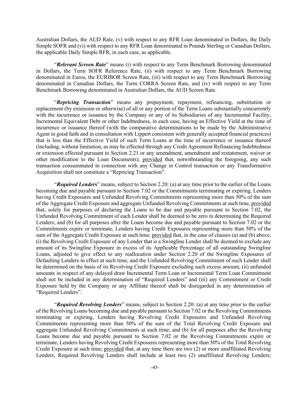 -45- Australian Dollars, the AUD Rate, (v) with respect to any RFR Loan denominated in Dollars, the Daily Simple SOFR and (vi) with respect to any RFR Loan denominated in Pounds Sterling or Canadian Dollars, the applicable Daily Simple RFR, in each case, as applicable. “Relevant Screen Rate” means (i) with respect to any Term Benchmark Borrowing denominated in Dollars, the Term SOFR Reference Rate, (ii) with respect to any Term Benchmark Borrowing denominated in Euros, the EURIBOR Screen Rate, (iii) with respect to any Term Benchmark Borrowing denominated in Canadian Dollars, the Term CORRA Screen Rate, and (iv) with respect to any Term Benchmark Borrowing denominated in Australian Dollars, the AUD Screen Rate. “Repricing Transaction” means any prepayment, repayment, refinancing, substitution or replacement (by extension or otherwise) of all or any portion of the Term Loans substantially concurrently with the incurrence or issuance by the Company or any of its Subsidiaries of any Incremental Facility, Incremental Equivalent Debt or other Indebtedness, in each case, having an Effective Yield at the time of incurrence or issuance thereof (with the comparative determinations to be made by the Administrative Agent in good faith and in consultation with Lippert consistent with generally accepted financial practices) that is less than the Effective Yield of such Term Loans at the time of incurrence or issuance thereof (including, without limitation, as may be effected through any Credit Agreement Refinancing Indebtedness or extension effected pursuant to Section 2.21 or any amendment, amendment and restatement, waiver or other modification to the Loan Documents); provided that, notwithstanding the foregoing, any such transaction consummated in connection with any Change in Control transaction or any Transformative Acquisition shall not constitute a “Repricing Transaction”. “Required Lenders” means, subject to Section 2.20: (a) at any time prior to the earlier of the Loans becoming due and payable pursuant to Section 7.02 or the Commitments terminating or expiring, Lenders having Credit Exposures and Unfunded Revolving Commitments representing more than 50% of the sum of the Aggregate Credit Exposure and aggregate Unfunded Revolving Commitments at such time, provided that, solely for purposes of declaring the Loans to be due and payable pursuant to Section 7.02, the Unfunded Revolving Commitment of each Lender shall be deemed to be zero in determining the Required Lenders; and (b) for all purposes after the Loans become due and payable pursuant to Section 7.02 or the Commitments expire or terminate, Lenders having Credit Exposures representing more than 50% of the sum of the Aggregate Credit Exposure at such time; provided that, in the case of clauses (a) and (b) above, (i) the Revolving Credit Exposure of any Lender that is a Swingline Lender shall be deemed to exclude any amount of its Swingline Exposure in excess of its Applicable Percentage of all outstanding Swingline Loans, adjusted to give effect to any reallocation under Section 2.20 of the Swingline Exposures of Defaulting Lenders in effect at such time, and the Unfunded Revolving Commitment of such Lender shall be determined on the basis of its Revolving Credit Exposure excluding such excess amount, (ii) unfunded amounts in respect of any delayed draw Incremental Term Loan or Incremental Term Loan Commitment shall not be included in any determination of “Required Lenders” and (iii) any Commitment or Credit Exposure held by the Company or any Affiliate thereof shall be disregarded in any determination of “Required Lenders”. “Required Revolving Lenders” means, subject to Section 2.20: (a) at any time prior to the earlier of the Revolving Loans becoming due and payable pursuant to Section 7.02 or the Revolving Commitments terminating or expiring, Lenders having Revolving Credit Exposures and Unfunded Revolving Commitments representing more than 50% of the sum of the Total Revolving Credit Exposure and aggregate Unfunded Revolving Commitments at such time; and (b) for all purposes after the Revolving Loans become due and payable pursuant to Section 7.02 or the Revolving Commitments expire or terminate, Lenders having Revolving Credit Exposures representing more than 50% of the Total Revolving Credit Exposure at such time; provided that, at any time there are two (2) or more unaffiliated Revolving Lenders, Required Revolving Lenders shall include at least two (2) unaffiliated Revolving Lenders;