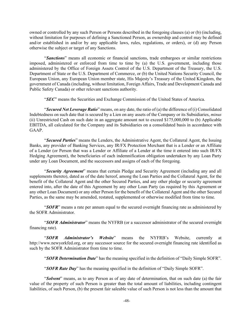 -48- owned or controlled by any such Person or Persons described in the foregoing clauses (a) or (b) (including, without limitation for purposes of defining a Sanctioned Person, as ownership and control may be defined and/or established in and/or by any applicable laws, rules, regulations, or orders), or (d) any Person otherwise the subject or target of any Sanctions. “Sanctions” means all economic or financial sanctions, trade embargoes or similar restrictions imposed, administered or enforced from time to time by (a) the U.S. government, including those administered by the Office of Foreign Assets Control of the U.S. Department of the Treasury, the U.S. Department of State or the U.S. Department of Commerce, or (b) the United Nations Security Council, the European Union, any European Union member state, His Majesty’s Treasury of the United Kingdom, the government of Canada (including, without limitation, Foreign Affairs, Trade and Development Canada and Public Safety Canada) or other relevant sanctions authority. “SEC” means the Securities and Exchange Commission of the United States of America. “Secured Net Leverage Ratio” means, on any date, the ratio of (a) the difference of (i) Consolidated Indebtedness on such date that is secured by a Lien on any assets of the Company or its Subsidiaries, minus (ii) Unrestricted Cash on such date in an aggregate amount not to exceed $175,000,000 to (b) Applicable EBITDA, all calculated for the Company and its Subsidiaries on a consolidated basis in accordance with GAAP. “Secured Parties” means the Lenders, the Administrative Agent, the Collateral Agent, the Issuing Banks, any provider of Banking Services, any IR/FX Protection Merchant that is a Lender or an Affiliate of a Lender (or Person that was a Lender or Affiliate of a Lender at the time it entered into such IR/FX Hedging Agreement), the beneficiaries of each indemnification obligation undertaken by any Loan Party under any Loan Document, and the successors and assigns of each of the foregoing. “Security Agreement” means that certain Pledge and Security Agreement (including any and all supplements thereto), dated as of the date hereof, among the Loan Parties and the Collateral Agent, for the benefit of the Collateral Agent and the other Secured Parties, and any other pledge or security agreement entered into, after the date of this Agreement by any other Loan Party (as required by this Agreement or any other Loan Document) or any other Person for the benefit of the Collateral Agent and the other Secured Parties, as the same may be amended, restated, supplemented or otherwise modified from time to time. “SOFR” means a rate per annum equal to the secured overnight financing rate as administered by the SOFR Administrator. “SOFR Administrator” means the NYFRB (or a successor administrator of the secured overnight financing rate). “SOFR Administrator’s Website” means the NYFRB’s Website, currently at http://www.newyorkfed.org, or any successor source for the secured overnight financing rate identified as such by the SOFR Administrator from time to time. “SOFR Determination Date” has the meaning specified in the definition of “Daily Simple SOFR”. “SOFR Rate Day” has the meaning specified in the definition of “Daily Simple SOFR”. “Solvent” means, as to any Person as of any date of determination, that on such date (a) the fair value of the property of such Person is greater than the total amount of liabilities, including contingent liabilities, of such Person, (b) the present fair saleable value of such Person is not less than the amount that