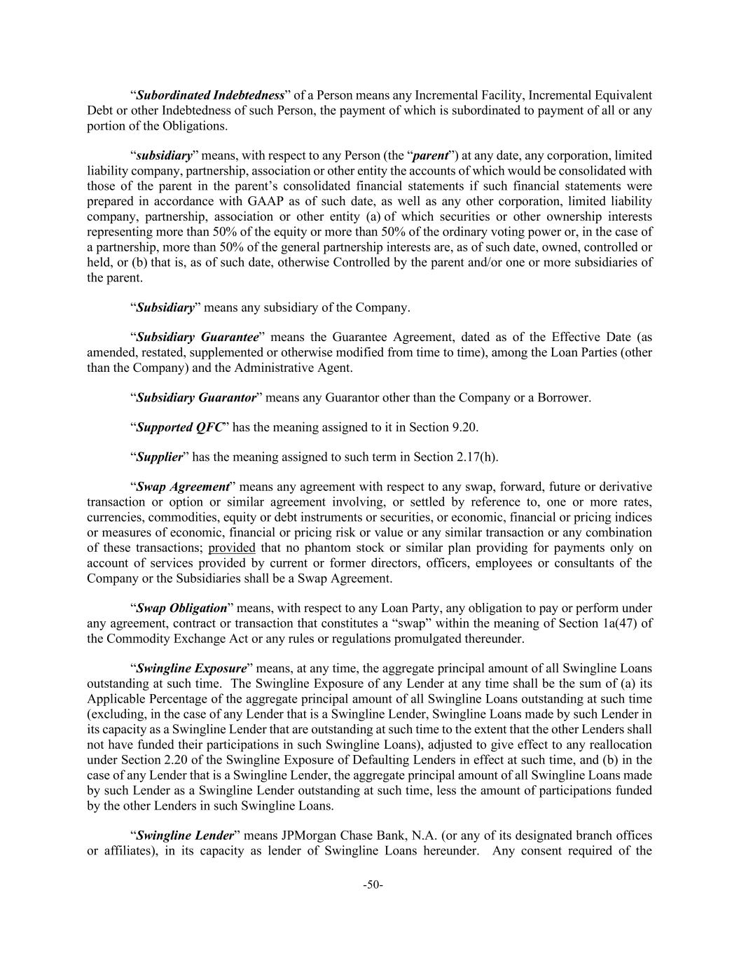 -50- “Subordinated Indebtedness” of a Person means any Incremental Facility, Incremental Equivalent Debt or other Indebtedness of such Person, the payment of which is subordinated to payment of all or any portion of the Obligations. “subsidiary” means, with respect to any Person (the “parent”) at any date, any corporation, limited liability company, partnership, association or other entity the accounts of which would be consolidated with those of the parent in the parent’s consolidated financial statements if such financial statements were prepared in accordance with GAAP as of such date, as well as any other corporation, limited liability company, partnership, association or other entity (a) of which securities or other ownership interests representing more than 50% of the equity or more than 50% of the ordinary voting power or, in the case of a partnership, more than 50% of the general partnership interests are, as of such date, owned, controlled or held, or (b) that is, as of such date, otherwise Controlled by the parent and/or one or more subsidiaries of the parent. “Subsidiary” means any subsidiary of the Company. “Subsidiary Guarantee” means the Guarantee Agreement, dated as of the Effective Date (as amended, restated, supplemented or otherwise modified from time to time), among the Loan Parties (other than the Company) and the Administrative Agent. “Subsidiary Guarantor” means any Guarantor other than the Company or a Borrower. “Supported QFC” has the meaning assigned to it in Section 9.20. “Supplier” has the meaning assigned to such term in Section 2.17(h). “Swap Agreement” means any agreement with respect to any swap, forward, future or derivative transaction or option or similar agreement involving, or settled by reference to, one or more rates, currencies, commodities, equity or debt instruments or securities, or economic, financial or pricing indices or measures of economic, financial or pricing risk or value or any similar transaction or any combination of these transactions; provided that no phantom stock or similar plan providing for payments only on account of services provided by current or former directors, officers, employees or consultants of the Company or the Subsidiaries shall be a Swap Agreement. “Swap Obligation” means, with respect to any Loan Party, any obligation to pay or perform under any agreement, contract or transaction that constitutes a “swap” within the meaning of Section 1a(47) of the Commodity Exchange Act or any rules or regulations promulgated thereunder. “Swingline Exposure” means, at any time, the aggregate principal amount of all Swingline Loans outstanding at such time. The Swingline Exposure of any Lender at any time shall be the sum of (a) its Applicable Percentage of the aggregate principal amount of all Swingline Loans outstanding at such time (excluding, in the case of any Lender that is a Swingline Lender, Swingline Loans made by such Lender in its capacity as a Swingline Lender that are outstanding at such time to the extent that the other Lenders shall not have funded their participations in such Swingline Loans), adjusted to give effect to any reallocation under Section 2.20 of the Swingline Exposure of Defaulting Lenders in effect at such time, and (b) in the case of any Lender that is a Swingline Lender, the aggregate principal amount of all Swingline Loans made by such Lender as a Swingline Lender outstanding at such time, less the amount of participations funded by the other Lenders in such Swingline Loans. “Swingline Lender” means JPMorgan Chase Bank, N.A. (or any of its designated branch offices or affiliates), in its capacity as lender of Swingline Loans hereunder. Any consent required of the