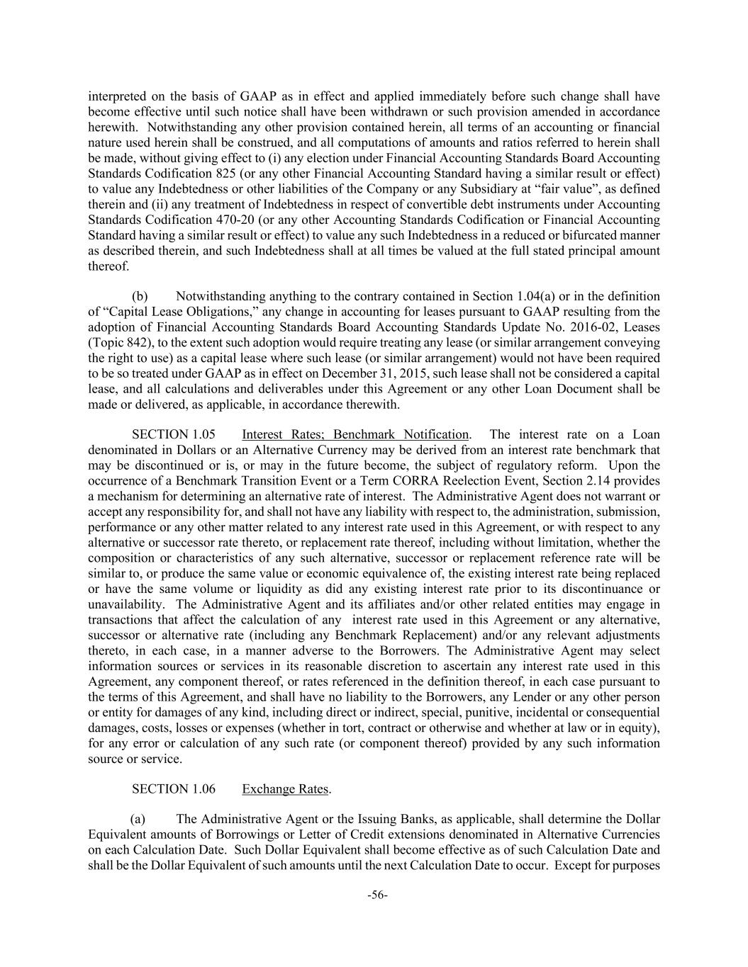 -56- interpreted on the basis of GAAP as in effect and applied immediately before such change shall have become effective until such notice shall have been withdrawn or such provision amended in accordance herewith. Notwithstanding any other provision contained herein, all terms of an accounting or financial nature used herein shall be construed, and all computations of amounts and ratios referred to herein shall be made, without giving effect to (i) any election under Financial Accounting Standards Board Accounting Standards Codification 825 (or any other Financial Accounting Standard having a similar result or effect) to value any Indebtedness or other liabilities of the Company or any Subsidiary at “fair value”, as defined therein and (ii) any treatment of Indebtedness in respect of convertible debt instruments under Accounting Standards Codification 470-20 (or any other Accounting Standards Codification or Financial Accounting Standard having a similar result or effect) to value any such Indebtedness in a reduced or bifurcated manner as described therein, and such Indebtedness shall at all times be valued at the full stated principal amount thereof. (b) Notwithstanding anything to the contrary contained in Section 1.04(a) or in the definition of “Capital Lease Obligations,” any change in accounting for leases pursuant to GAAP resulting from the adoption of Financial Accounting Standards Board Accounting Standards Update No. 2016-02, Leases (Topic 842), to the extent such adoption would require treating any lease (or similar arrangement conveying the right to use) as a capital lease where such lease (or similar arrangement) would not have been required to be so treated under GAAP as in effect on December 31, 2015, such lease shall not be considered a capital lease, and all calculations and deliverables under this Agreement or any other Loan Document shall be made or delivered, as applicable, in accordance therewith. SECTION 1.05 Interest Rates; Benchmark Notification. The interest rate on a Loan denominated in Dollars or an Alternative Currency may be derived from an interest rate benchmark that may be discontinued or is, or may in the future become, the subject of regulatory reform. Upon the occurrence of a Benchmark Transition Event or a Term CORRA Reelection Event, Section 2.14 provides a mechanism for determining an alternative rate of interest. The Administrative Agent does not warrant or accept any responsibility for, and shall not have any liability with respect to, the administration, submission, performance or any other matter related to any interest rate used in this Agreement, or with respect to any alternative or successor rate thereto, or replacement rate thereof, including without limitation, whether the composition or characteristics of any such alternative, successor or replacement reference rate will be similar to, or produce the same value or economic equivalence of, the existing interest rate being replaced or have the same volume or liquidity as did any existing interest rate prior to its discontinuance or unavailability. The Administrative Agent and its affiliates and/or other related entities may engage in transactions that affect the calculation of any interest rate used in this Agreement or any alternative, successor or alternative rate (including any Benchmark Replacement) and/or any relevant adjustments thereto, in each case, in a manner adverse to the Borrowers. The Administrative Agent may select information sources or services in its reasonable discretion to ascertain any interest rate used in this Agreement, any component thereof, or rates referenced in the definition thereof, in each case pursuant to the terms of this Agreement, and shall have no liability to the Borrowers, any Lender or any other person or entity for damages of any kind, including direct or indirect, special, punitive, incidental or consequential damages, costs, losses or expenses (whether in tort, contract or otherwise and whether at law or in equity), for any error or calculation of any such rate (or component thereof) provided by any such information source or service. SECTION 1.06 Exchange Rates. (a) The Administrative Agent or the Issuing Banks, as applicable, shall determine the Dollar Equivalent amounts of Borrowings or Letter of Credit extensions denominated in Alternative Currencies on each Calculation Date. Such Dollar Equivalent shall become effective as of such Calculation Date and shall be the Dollar Equivalent of such amounts until the next Calculation Date to occur. Except for purposes