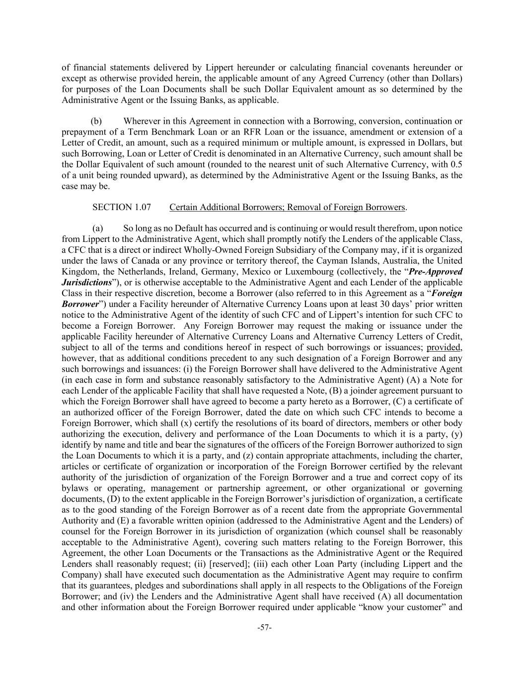 -57- of financial statements delivered by Lippert hereunder or calculating financial covenants hereunder or except as otherwise provided herein, the applicable amount of any Agreed Currency (other than Dollars) for purposes of the Loan Documents shall be such Dollar Equivalent amount as so determined by the Administrative Agent or the Issuing Banks, as applicable. (b) Wherever in this Agreement in connection with a Borrowing, conversion, continuation or prepayment of a Term Benchmark Loan or an RFR Loan or the issuance, amendment or extension of a Letter of Credit, an amount, such as a required minimum or multiple amount, is expressed in Dollars, but such Borrowing, Loan or Letter of Credit is denominated in an Alternative Currency, such amount shall be the Dollar Equivalent of such amount (rounded to the nearest unit of such Alternative Currency, with 0.5 of a unit being rounded upward), as determined by the Administrative Agent or the Issuing Banks, as the case may be. SECTION 1.07 Certain Additional Borrowers; Removal of Foreign Borrowers. (a) So long as no Default has occurred and is continuing or would result therefrom, upon notice from Lippert to the Administrative Agent, which shall promptly notify the Lenders of the applicable Class, a CFC that is a direct or indirect Wholly-Owned Foreign Subsidiary of the Company may, if it is organized under the laws of Canada or any province or territory thereof, the Cayman Islands, Australia, the United Kingdom, the Netherlands, Ireland, Germany, Mexico or Luxembourg (collectively, the “Pre-Approved Jurisdictions”), or is otherwise acceptable to the Administrative Agent and each Lender of the applicable Class in their respective discretion, become a Borrower (also referred to in this Agreement as a “Foreign Borrower”) under a Facility hereunder of Alternative Currency Loans upon at least 30 days’ prior written notice to the Administrative Agent of the identity of such CFC and of Lippert’s intention for such CFC to become a Foreign Borrower. Any Foreign Borrower may request the making or issuance under the applicable Facility hereunder of Alternative Currency Loans and Alternative Currency Letters of Credit, subject to all of the terms and conditions hereof in respect of such borrowings or issuances; provided, however, that as additional conditions precedent to any such designation of a Foreign Borrower and any such borrowings and issuances: (i) the Foreign Borrower shall have delivered to the Administrative Agent (in each case in form and substance reasonably satisfactory to the Administrative Agent) (A) a Note for each Lender of the applicable Facility that shall have requested a Note, (B) a joinder agreement pursuant to which the Foreign Borrower shall have agreed to become a party hereto as a Borrower, (C) a certificate of an authorized officer of the Foreign Borrower, dated the date on which such CFC intends to become a Foreign Borrower, which shall (x) certify the resolutions of its board of directors, members or other body authorizing the execution, delivery and performance of the Loan Documents to which it is a party, (y) identify by name and title and bear the signatures of the officers of the Foreign Borrower authorized to sign the Loan Documents to which it is a party, and (z) contain appropriate attachments, including the charter, articles or certificate of organization or incorporation of the Foreign Borrower certified by the relevant authority of the jurisdiction of organization of the Foreign Borrower and a true and correct copy of its bylaws or operating, management or partnership agreement, or other organizational or governing documents, (D) to the extent applicable in the Foreign Borrower’s jurisdiction of organization, a certificate as to the good standing of the Foreign Borrower as of a recent date from the appropriate Governmental Authority and (E) a favorable written opinion (addressed to the Administrative Agent and the Lenders) of counsel for the Foreign Borrower in its jurisdiction of organization (which counsel shall be reasonably acceptable to the Administrative Agent), covering such matters relating to the Foreign Borrower, this Agreement, the other Loan Documents or the Transactions as the Administrative Agent or the Required Lenders shall reasonably request; (ii) [reserved]; (iii) each other Loan Party (including Lippert and the Company) shall have executed such documentation as the Administrative Agent may require to confirm that its guarantees, pledges and subordinations shall apply in all respects to the Obligations of the Foreign Borrower; and (iv) the Lenders and the Administrative Agent shall have received (A) all documentation and other information about the Foreign Borrower required under applicable “know your customer” and