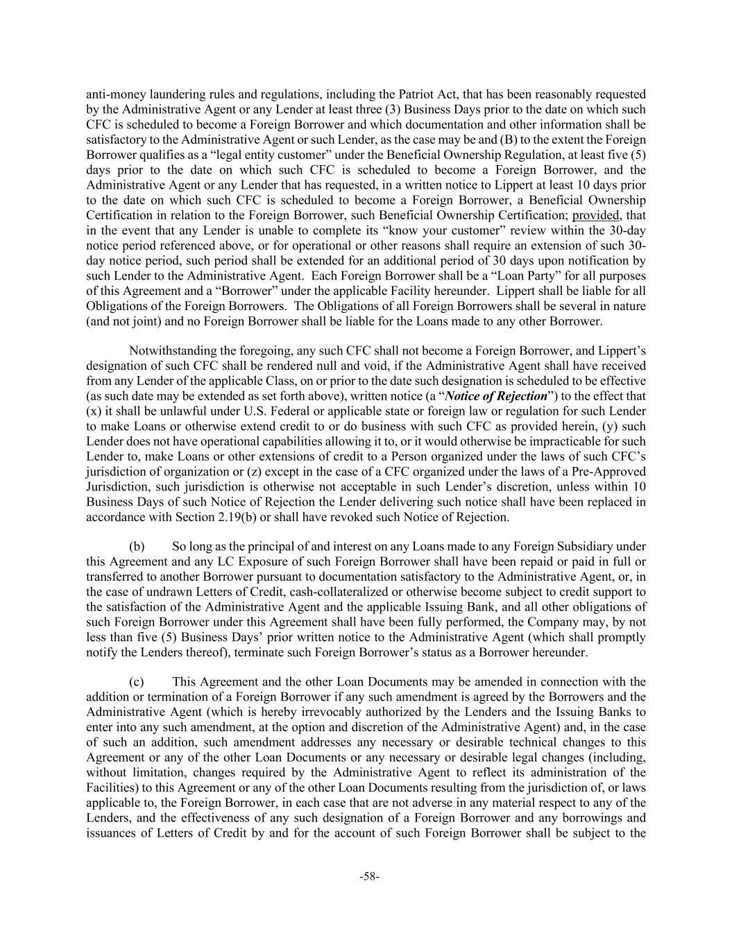 -58- anti-money laundering rules and regulations, including the Patriot Act, that has been reasonably requested by the Administrative Agent or any Lender at least three (3) Business Days prior to the date on which such CFC is scheduled to become a Foreign Borrower and which documentation and other information shall be satisfactory to the Administrative Agent or such Lender, as the case may be and (B) to the extent the Foreign Borrower qualifies as a “legal entity customer” under the Beneficial Ownership Regulation, at least five (5) days prior to the date on which such CFC is scheduled to become a Foreign Borrower, and the Administrative Agent or any Lender that has requested, in a written notice to Lippert at least 10 days prior to the date on which such CFC is scheduled to become a Foreign Borrower, a Beneficial Ownership Certification in relation to the Foreign Borrower, such Beneficial Ownership Certification; provided, that in the event that any Lender is unable to complete its “know your customer” review within the 30-day notice period referenced above, or for operational or other reasons shall require an extension of such 30- day notice period, such period shall be extended for an additional period of 30 days upon notification by such Lender to the Administrative Agent. Each Foreign Borrower shall be a “Loan Party” for all purposes of this Agreement and a “Borrower” under the applicable Facility hereunder. Lippert shall be liable for all Obligations of the Foreign Borrowers. The Obligations of all Foreign Borrowers shall be several in nature (and not joint) and no Foreign Borrower shall be liable for the Loans made to any other Borrower. Notwithstanding the foregoing, any such CFC shall not become a Foreign Borrower, and Lippert’s designation of such CFC shall be rendered null and void, if the Administrative Agent shall have received from any Lender of the applicable Class, on or prior to the date such designation is scheduled to be effective (as such date may be extended as set forth above), written notice (a “Notice of Rejection”) to the effect that (x) it shall be unlawful under U.S. Federal or applicable state or foreign law or regulation for such Lender to make Loans or otherwise extend credit to or do business with such CFC as provided herein, (y) such Lender does not have operational capabilities allowing it to, or it would otherwise be impracticable for such Lender to, make Loans or other extensions of credit to a Person organized under the laws of such CFC’s jurisdiction of organization or (z) except in the case of a CFC organized under the laws of a Pre-Approved Jurisdiction, such jurisdiction is otherwise not acceptable in such Lender’s discretion, unless within 10 Business Days of such Notice of Rejection the Lender delivering such notice shall have been replaced in accordance with Section 2.19(b) or shall have revoked such Notice of Rejection. (b) So long as the principal of and interest on any Loans made to any Foreign Subsidiary under this Agreement and any LC Exposure of such Foreign Borrower shall have been repaid or paid in full or transferred to another Borrower pursuant to documentation satisfactory to the Administrative Agent, or, in the case of undrawn Letters of Credit, cash-collateralized or otherwise become subject to credit support to the satisfaction of the Administrative Agent and the applicable Issuing Bank, and all other obligations of such Foreign Borrower under this Agreement shall have been fully performed, the Company may, by not less than five (5) Business Days’ prior written notice to the Administrative Agent (which shall promptly notify the Lenders thereof), terminate such Foreign Borrower’s status as a Borrower hereunder. (c) This Agreement and the other Loan Documents may be amended in connection with the addition or termination of a Foreign Borrower if any such amendment is agreed by the Borrowers and the Administrative Agent (which is hereby irrevocably authorized by the Lenders and the Issuing Banks to enter into any such amendment, at the option and discretion of the Administrative Agent) and, in the case of such an addition, such amendment addresses any necessary or desirable technical changes to this Agreement or any of the other Loan Documents or any necessary or desirable legal changes (including, without limitation, changes required by the Administrative Agent to reflect its administration of the Facilities) to this Agreement or any of the other Loan Documents resulting from the jurisdiction of, or laws applicable to, the Foreign Borrower, in each case that are not adverse in any material respect to any of the Lenders, and the effectiveness of any such designation of a Foreign Borrower and any borrowings and issuances of Letters of Credit by and for the account of such Foreign Borrower shall be subject to the
