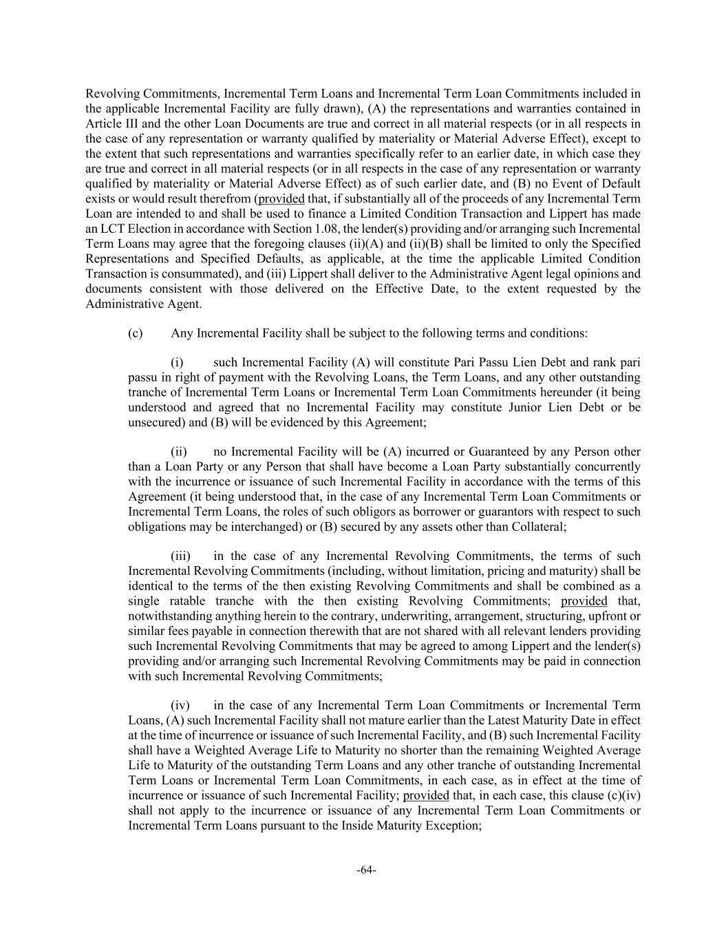 -64- Revolving Commitments, Incremental Term Loans and Incremental Term Loan Commitments included in the applicable Incremental Facility are fully drawn), (A) the representations and warranties contained in Article III and the other Loan Documents are true and correct in all material respects (or in all respects in the case of any representation or warranty qualified by materiality or Material Adverse Effect), except to the extent that such representations and warranties specifically refer to an earlier date, in which case they are true and correct in all material respects (or in all respects in the case of any representation or warranty qualified by materiality or Material Adverse Effect) as of such earlier date, and (B) no Event of Default exists or would result therefrom (provided that, if substantially all of the proceeds of any Incremental Term Loan are intended to and shall be used to finance a Limited Condition Transaction and Lippert has made an LCT Election in accordance with Section 1.08, the lender(s) providing and/or arranging such Incremental Term Loans may agree that the foregoing clauses (ii)(A) and (ii)(B) shall be limited to only the Specified Representations and Specified Defaults, as applicable, at the time the applicable Limited Condition Transaction is consummated), and (iii) Lippert shall deliver to the Administrative Agent legal opinions and documents consistent with those delivered on the Effective Date, to the extent requested by the Administrative Agent. (c) Any Incremental Facility shall be subject to the following terms and conditions: (i) such Incremental Facility (A) will constitute Pari Passu Lien Debt and rank pari passu in right of payment with the Revolving Loans, the Term Loans, and any other outstanding tranche of Incremental Term Loans or Incremental Term Loan Commitments hereunder (it being understood and agreed that no Incremental Facility may constitute Junior Lien Debt or be unsecured) and (B) will be evidenced by this Agreement; (ii) no Incremental Facility will be (A) incurred or Guaranteed by any Person other than a Loan Party or any Person that shall have become a Loan Party substantially concurrently with the incurrence or issuance of such Incremental Facility in accordance with the terms of this Agreement (it being understood that, in the case of any Incremental Term Loan Commitments or Incremental Term Loans, the roles of such obligors as borrower or guarantors with respect to such obligations may be interchanged) or (B) secured by any assets other than Collateral; (iii) in the case of any Incremental Revolving Commitments, the terms of such Incremental Revolving Commitments (including, without limitation, pricing and maturity) shall be identical to the terms of the then existing Revolving Commitments and shall be combined as a single ratable tranche with the then existing Revolving Commitments; provided that, notwithstanding anything herein to the contrary, underwriting, arrangement, structuring, upfront or similar fees payable in connection therewith that are not shared with all relevant lenders providing such Incremental Revolving Commitments that may be agreed to among Lippert and the lender(s) providing and/or arranging such Incremental Revolving Commitments may be paid in connection with such Incremental Revolving Commitments; (iv) in the case of any Incremental Term Loan Commitments or Incremental Term Loans, (A) such Incremental Facility shall not mature earlier than the Latest Maturity Date in effect at the time of incurrence or issuance of such Incremental Facility, and (B) such Incremental Facility shall have a Weighted Average Life to Maturity no shorter than the remaining Weighted Average Life to Maturity of the outstanding Term Loans and any other tranche of outstanding Incremental Term Loans or Incremental Term Loan Commitments, in each case, as in effect at the time of incurrence or issuance of such Incremental Facility; provided that, in each case, this clause (c)(iv) shall not apply to the incurrence or issuance of any Incremental Term Loan Commitments or Incremental Term Loans pursuant to the Inside Maturity Exception;