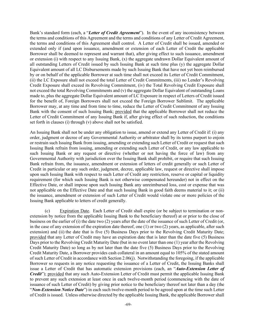 -69- Bank’s standard form (each, a “Letter of Credit Agreement”). In the event of any inconsistency between the terms and conditions of this Agreement and the terms and conditions of any Letter of Credit Agreement, the terms and conditions of this Agreement shall control. A Letter of Credit shall be issued, amended or extended only if (and upon issuance, amendment or extension of each Letter of Credit the applicable Borrower shall be deemed to represent and warrant that), after giving effect to such issuance, amendment or extension (i) with respect to any Issuing Bank, (x) the aggregate undrawn Dollar Equivalent amount of all outstanding Letters of Credit issued by such Issuing Bank at such time plus (y) the aggregate Dollar Equivalent amount of all LC Disbursements made by such Issuing Bank that have not yet been reimbursed by or on behalf of the applicable Borrower at such time shall not exceed its Letter of Credit Commitment, (ii) the LC Exposure shall not exceed the total Letter of Credit Commitments, (iii) no Lender’s Revolving Credit Exposure shall exceed its Revolving Commitment, (iv) the Total Revolving Credit Exposure shall not exceed the total Revolving Commitments and (v) the aggregate Dollar Equivalent of outstanding Loans made to, plus the aggregate Dollar Equivalent amount of LC Exposure in respect of Letters of Credit issued for the benefit of, Foreign Borrowers shall not exceed the Foreign Borrower Sublimit. The applicable Borrower may, at any time and from time to time, reduce the Letter of Credit Commitment of any Issuing Bank with the consent of such Issuing Bank; provided that the applicable Borrower shall not reduce the Letter of Credit Commitment of any Issuing Bank if, after giving effect of such reduction, the conditions set forth in clauses (i) through (v) above shall not be satisfied. An Issuing Bank shall not be under any obligation to issue, amend or extend any Letter of Credit if: (i) any order, judgment or decree of any Governmental Authority or arbitrator shall by its terms purport to enjoin or restrain such Issuing Bank from issuing, amending or extending such Letter of Credit or request that such Issuing Bank refrain from issuing, amending or extending such Letter of Credit, or any law applicable to such Issuing Bank or any request or directive (whether or not having the force of law) from any Governmental Authority with jurisdiction over the Issuing Bank shall prohibit, or require that such Issuing Bank refrain from, the issuance, amendment or extension of letters of credit generally or such Letter of Credit in particular or any such order, judgment, decree, applicable law, request or directive shall impose upon such Issuing Bank with respect to such Letter of Credit any restriction, reserve or capital or liquidity requirement (for which such Issuing Bank is not otherwise compensated hereunder) not in effect on the Effective Date, or shall impose upon such Issuing Bank any unreimbursed loss, cost or expense that was not applicable on the Effective Date and that such Issuing Bank in good faith deems material to it; or (ii) the issuance, amendment or extension of such Letter of Credit would violate one or more policies of the Issuing Bank applicable to letters of credit generally. (c) Expiration Date. Each Letter of Credit shall expire (or be subject to termination or non- extension by notice from the applicable Issuing Bank to the beneficiary thereof) at or prior to the close of business on the earlier of (i) the date two (2) years after the date of the issuance of such Letter of Credit (or, in the case of any extension of the expiration date thereof, one (1) or two (2) years, as applicable, after such extension) and (ii) the date that is five (5) Business Days prior to the Revolving Credit Maturity Date; provided that any Letter of Credit may have an expiration date that is later than the date five (5) Business Days prior to the Revolving Credit Maturity Date (but in no event later than one (1) year after the Revolving Credit Maturity Date) so long as by not later than the date five (5) Business Days prior to the Revolving Credit Maturity Date, a Borrower provides cash collateral in an amount equal to 105% of the stated amount of such Letter of Credit in accordance with Section 2.06(j). Notwithstanding the foregoing, if the applicable Borrower so requests in any notice requesting the issuance of a Letter of Credit, the Issuing Banks shall issue a Letter of Credit that has automatic extension provisions (each, an “Auto-Extension Letter of Credit”); provided that any such Auto-Extension Letter of Credit must permit the applicable Issuing Bank to prevent any such extension at least once in each twelve-month period (commencing with the date of issuance of such Letter of Credit) by giving prior notice to the beneficiary thereof not later than a day (the “Non-Extension Notice Date”) in each such twelve-month period to be agreed upon at the time such Letter of Credit is issued. Unless otherwise directed by the applicable Issuing Bank, the applicable Borrower shall