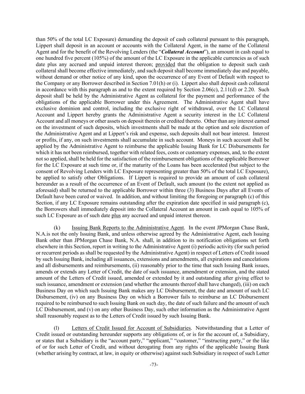-73- than 50% of the total LC Exposure) demanding the deposit of cash collateral pursuant to this paragraph, Lippert shall deposit in an account or accounts with the Collateral Agent, in the name of the Collateral Agent and for the benefit of the Revolving Lenders (the “Collateral Account”), an amount in cash equal to one hundred five percent (105%) of the amount of the LC Exposure in the applicable currencies as of such date plus any accrued and unpaid interest thereon; provided that the obligation to deposit such cash collateral shall become effective immediately, and such deposit shall become immediately due and payable, without demand or other notice of any kind, upon the occurrence of any Event of Default with respect to the Company or any Borrower described in Section 7.01(h) or (i). Lippert also shall deposit cash collateral in accordance with this paragraph as and to the extent required by Section 2.06(c), 2.11(d) or 2.20. Such deposit shall be held by the Administrative Agent as collateral for the payment and performance of the obligations of the applicable Borrower under this Agreement. The Administrative Agent shall have exclusive dominion and control, including the exclusive right of withdrawal, over the LC Collateral Account and Lippert hereby grants the Administrative Agent a security interest in the LC Collateral Account and all moneys or other assets on deposit therein or credited thereto. Other than any interest earned on the investment of such deposits, which investments shall be made at the option and sole discretion of the Administrative Agent and at Lippert’s risk and expense, such deposits shall not bear interest. Interest or profits, if any, on such investments shall accumulate in such account. Moneys in such account shall be applied by the Administrative Agent to reimburse the applicable Issuing Bank for LC Disbursements for which it has not been reimbursed, together with related fees, costs or customary expenses, and, to the extent not so applied, shall be held for the satisfaction of the reimbursement obligations of the applicable Borrower for the LC Exposure at such time or, if the maturity of the Loans has been accelerated (but subject to the consent of Revolving Lenders with LC Exposure representing greater than 50% of the total LC Exposure), be applied to satisfy other Obligations. If Lippert is required to provide an amount of cash collateral hereunder as a result of the occurrence of an Event of Default, such amount (to the extent not applied as aforesaid) shall be returned to the applicable Borrower within three (3) Business Days after all Events of Default have been cured or waived. In addition, and without limiting the foregoing or paragraph (c) of this Section, if any LC Exposure remains outstanding after the expiration date specified in said paragraph (c), the Borrowers shall immediately deposit into the Collateral Account an amount in cash equal to 105% of such LC Exposure as of such date plus any accrued and unpaid interest thereon. (k) Issuing Bank Reports to the Administrative Agent. In the event JPMorgan Chase Bank, N.A.is not the only Issuing Bank, and unless otherwise agreed by the Administrative Agent, each Issuing Bank other than JPMorgan Chase Bank, N.A. shall, in addition to its notification obligations set forth elsewhere in this Section, report in writing to the Administrative Agent (i) periodic activity (for such period or recurrent periods as shall be requested by the Administrative Agent) in respect of Letters of Credit issued by such Issuing Bank, including all issuances, extensions and amendments, all expirations and cancelations and all disbursements and reimbursements, (ii) reasonably prior to the time that such Issuing Bank issues, amends or extends any Letter of Credit, the date of such issuance, amendment or extension, and the stated amount of the Letters of Credit issued, amended or extended by it and outstanding after giving effect to such issuance, amendment or extension (and whether the amounts thereof shall have changed), (iii) on each Business Day on which such Issuing Bank makes any LC Disbursement, the date and amount of such LC Disbursement, (iv) on any Business Day on which a Borrower fails to reimburse an LC Disbursement required to be reimbursed to such Issuing Bank on such day, the date of such failure and the amount of such LC Disbursement, and (v) on any other Business Day, such other information as the Administrative Agent shall reasonably request as to the Letters of Credit issued by such Issuing Bank. (l) Letters of Credit Issued for Account of Subsidiaries. Notwithstanding that a Letter of Credit issued or outstanding hereunder supports any obligations of, or is for the account of, a Subsidiary, or states that a Subsidiary is the “account party,” “applicant,” “customer,” “instructing party,” or the like of or for such Letter of Credit, and without derogating from any rights of the applicable Issuing Bank (whether arising by contract, at law, in equity or otherwise) against such Subsidiary in respect of such Letter