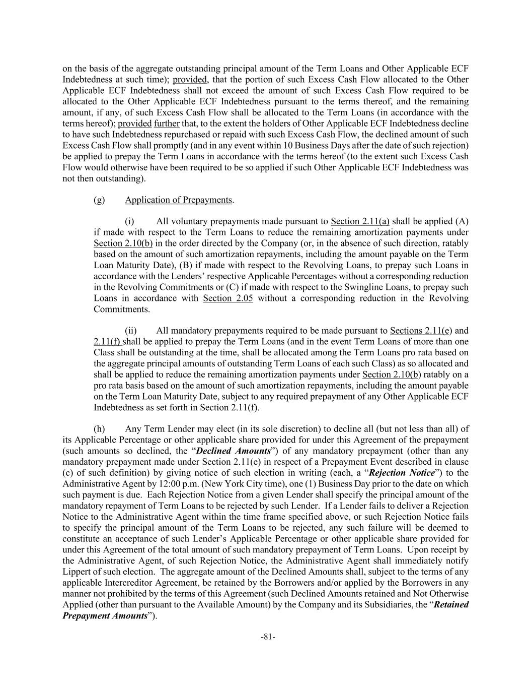-81- on the basis of the aggregate outstanding principal amount of the Term Loans and Other Applicable ECF Indebtedness at such time); provided, that the portion of such Excess Cash Flow allocated to the Other Applicable ECF Indebtedness shall not exceed the amount of such Excess Cash Flow required to be allocated to the Other Applicable ECF Indebtedness pursuant to the terms thereof, and the remaining amount, if any, of such Excess Cash Flow shall be allocated to the Term Loans (in accordance with the terms hereof); provided further that, to the extent the holders of Other Applicable ECF Indebtedness decline to have such Indebtedness repurchased or repaid with such Excess Cash Flow, the declined amount of such Excess Cash Flow shall promptly (and in any event within 10 Business Days after the date of such rejection) be applied to prepay the Term Loans in accordance with the terms hereof (to the extent such Excess Cash Flow would otherwise have been required to be so applied if such Other Applicable ECF Indebtedness was not then outstanding). (g) Application of Prepayments. (i) All voluntary prepayments made pursuant to Section 2.11(a) shall be applied (A) if made with respect to the Term Loans to reduce the remaining amortization payments under Section 2.10(b) in the order directed by the Company (or, in the absence of such direction, ratably based on the amount of such amortization repayments, including the amount payable on the Term Loan Maturity Date), (B) if made with respect to the Revolving Loans, to prepay such Loans in accordance with the Lenders’ respective Applicable Percentages without a corresponding reduction in the Revolving Commitments or (C) if made with respect to the Swingline Loans, to prepay such Loans in accordance with Section 2.05 without a corresponding reduction in the Revolving Commitments. (ii) All mandatory prepayments required to be made pursuant to Sections 2.11(e) and 2.11(f) shall be applied to prepay the Term Loans (and in the event Term Loans of more than one Class shall be outstanding at the time, shall be allocated among the Term Loans pro rata based on the aggregate principal amounts of outstanding Term Loans of each such Class) as so allocated and shall be applied to reduce the remaining amortization payments under Section 2.10(b) ratably on a pro rata basis based on the amount of such amortization repayments, including the amount payable on the Term Loan Maturity Date, subject to any required prepayment of any Other Applicable ECF Indebtedness as set forth in Section 2.11(f). (h) Any Term Lender may elect (in its sole discretion) to decline all (but not less than all) of its Applicable Percentage or other applicable share provided for under this Agreement of the prepayment (such amounts so declined, the “Declined Amounts”) of any mandatory prepayment (other than any mandatory prepayment made under Section 2.11(e) in respect of a Prepayment Event described in clause (c) of such definition) by giving notice of such election in writing (each, a “Rejection Notice”) to the Administrative Agent by 12:00 p.m. (New York City time), one (1) Business Day prior to the date on which such payment is due. Each Rejection Notice from a given Lender shall specify the principal amount of the mandatory repayment of Term Loans to be rejected by such Lender. If a Lender fails to deliver a Rejection Notice to the Administrative Agent within the time frame specified above, or such Rejection Notice fails to specify the principal amount of the Term Loans to be rejected, any such failure will be deemed to constitute an acceptance of such Lender’s Applicable Percentage or other applicable share provided for under this Agreement of the total amount of such mandatory prepayment of Term Loans. Upon receipt by the Administrative Agent, of such Rejection Notice, the Administrative Agent shall immediately notify Lippert of such election. The aggregate amount of the Declined Amounts shall, subject to the terms of any applicable Intercreditor Agreement, be retained by the Borrowers and/or applied by the Borrowers in any manner not prohibited by the terms of this Agreement (such Declined Amounts retained and Not Otherwise Applied (other than pursuant to the Available Amount) by the Company and its Subsidiaries, the “Retained Prepayment Amounts”).