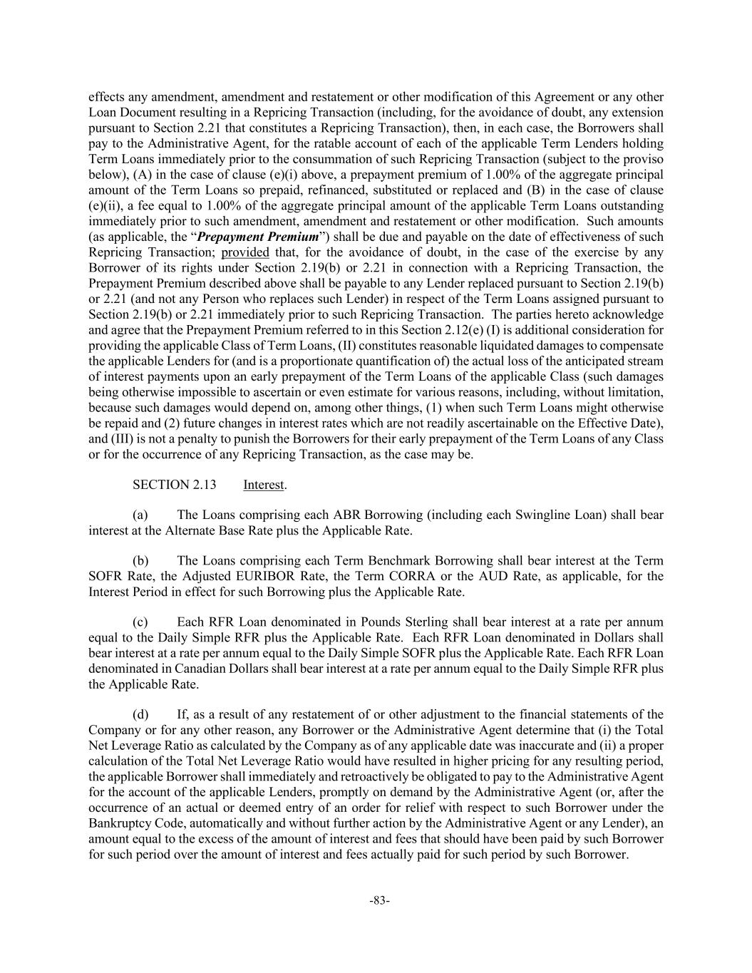 -83- effects any amendment, amendment and restatement or other modification of this Agreement or any other Loan Document resulting in a Repricing Transaction (including, for the avoidance of doubt, any extension pursuant to Section 2.21 that constitutes a Repricing Transaction), then, in each case, the Borrowers shall pay to the Administrative Agent, for the ratable account of each of the applicable Term Lenders holding Term Loans immediately prior to the consummation of such Repricing Transaction (subject to the proviso below), (A) in the case of clause (e)(i) above, a prepayment premium of 1.00% of the aggregate principal amount of the Term Loans so prepaid, refinanced, substituted or replaced and (B) in the case of clause (e)(ii), a fee equal to 1.00% of the aggregate principal amount of the applicable Term Loans outstanding immediately prior to such amendment, amendment and restatement or other modification. Such amounts (as applicable, the “Prepayment Premium”) shall be due and payable on the date of effectiveness of such Repricing Transaction; provided that, for the avoidance of doubt, in the case of the exercise by any Borrower of its rights under Section 2.19(b) or 2.21 in connection with a Repricing Transaction, the Prepayment Premium described above shall be payable to any Lender replaced pursuant to Section 2.19(b) or 2.21 (and not any Person who replaces such Lender) in respect of the Term Loans assigned pursuant to Section 2.19(b) or 2.21 immediately prior to such Repricing Transaction. The parties hereto acknowledge and agree that the Prepayment Premium referred to in this Section 2.12(e) (I) is additional consideration for providing the applicable Class of Term Loans, (II) constitutes reasonable liquidated damages to compensate the applicable Lenders for (and is a proportionate quantification of) the actual loss of the anticipated stream of interest payments upon an early prepayment of the Term Loans of the applicable Class (such damages being otherwise impossible to ascertain or even estimate for various reasons, including, without limitation, because such damages would depend on, among other things, (1) when such Term Loans might otherwise be repaid and (2) future changes in interest rates which are not readily ascertainable on the Effective Date), and (III) is not a penalty to punish the Borrowers for their early prepayment of the Term Loans of any Class or for the occurrence of any Repricing Transaction, as the case may be. SECTION 2.13 Interest. (a) The Loans comprising each ABR Borrowing (including each Swingline Loan) shall bear interest at the Alternate Base Rate plus the Applicable Rate. (b) The Loans comprising each Term Benchmark Borrowing shall bear interest at the Term SOFR Rate, the Adjusted EURIBOR Rate, the Term CORRA or the AUD Rate, as applicable, for the Interest Period in effect for such Borrowing plus the Applicable Rate. (c) Each RFR Loan denominated in Pounds Sterling shall bear interest at a rate per annum equal to the Daily Simple RFR plus the Applicable Rate. Each RFR Loan denominated in Dollars shall bear interest at a rate per annum equal to the Daily Simple SOFR plus the Applicable Rate. Each RFR Loan denominated in Canadian Dollars shall bear interest at a rate per annum equal to the Daily Simple RFR plus the Applicable Rate. (d) If, as a result of any restatement of or other adjustment to the financial statements of the Company or for any other reason, any Borrower or the Administrative Agent determine that (i) the Total Net Leverage Ratio as calculated by the Company as of any applicable date was inaccurate and (ii) a proper calculation of the Total Net Leverage Ratio would have resulted in higher pricing for any resulting period, the applicable Borrower shall immediately and retroactively be obligated to pay to the Administrative Agent for the account of the applicable Lenders, promptly on demand by the Administrative Agent (or, after the occurrence of an actual or deemed entry of an order for relief with respect to such Borrower under the Bankruptcy Code, automatically and without further action by the Administrative Agent or any Lender), an amount equal to the excess of the amount of interest and fees that should have been paid by such Borrower for such period over the amount of interest and fees actually paid for such period by such Borrower.